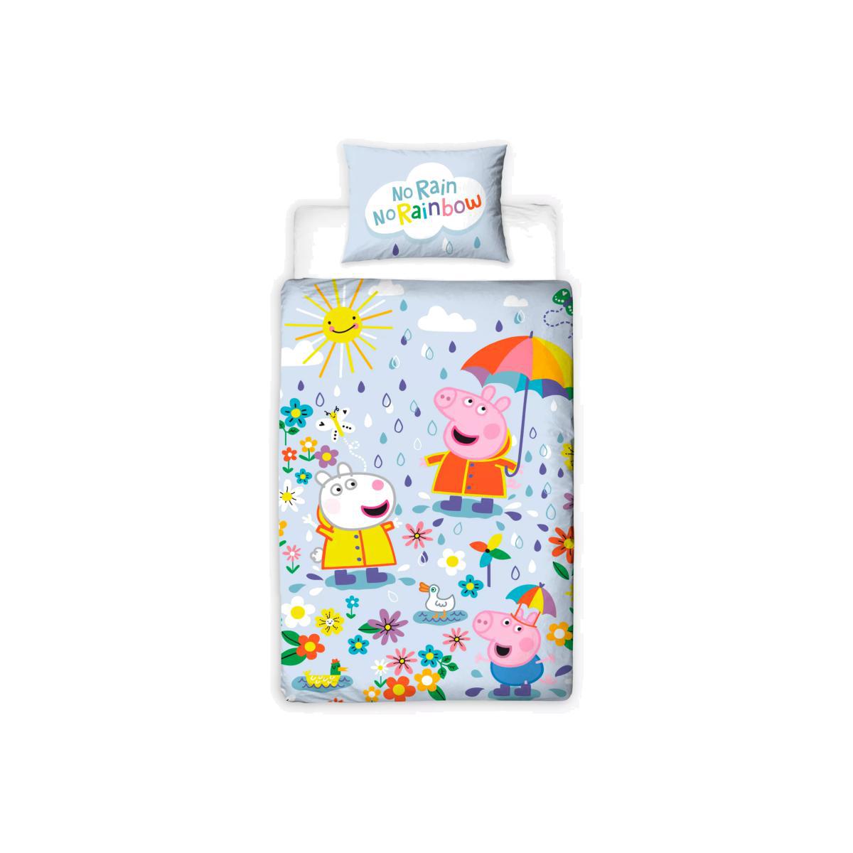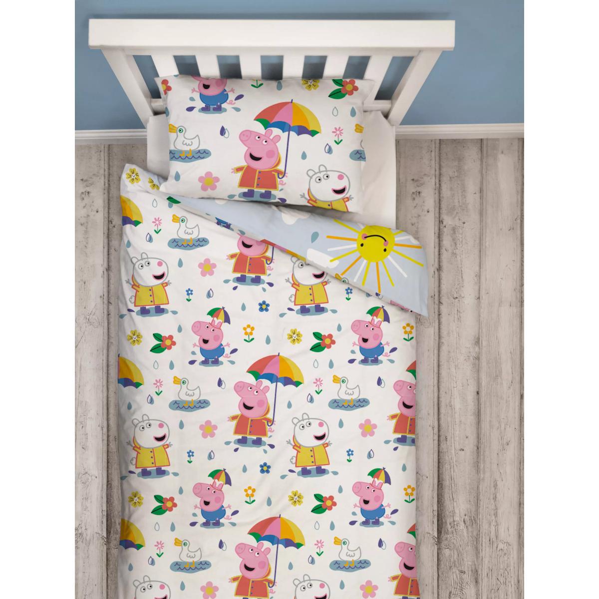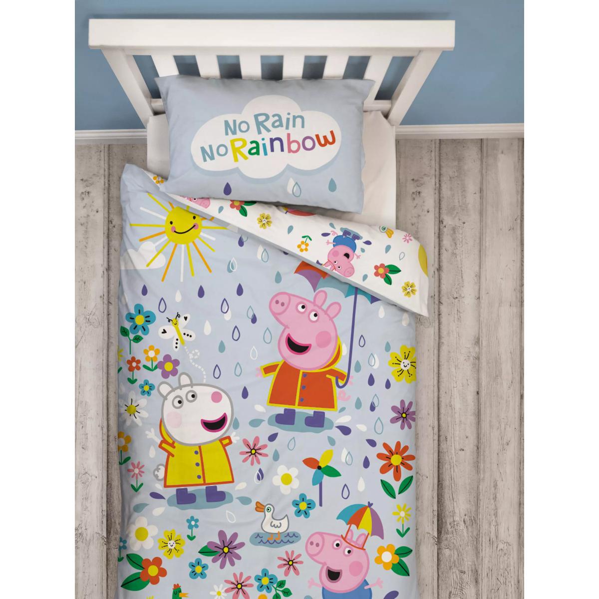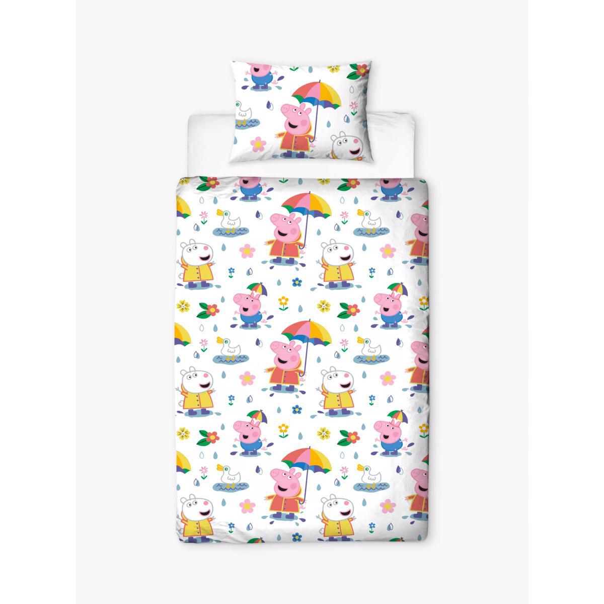 Make a splash at bedtime with this fun Peppa Pig single duvet. Featuring Peppa and Suzy Sheep on both sides as well as the cute phrase 'No rain no rainbow' on the pillow. This adorable duvet set will make bedtime the best time of day for your little one. Made from soft cotton, the duvet cover is reversible and offers two different prints that match the pillowcase. By buying cotton products from John Lewis & Partners, you're supporting more sustainable cotton farming through the Better Cotton Initiative. BCI is a not-for-profit organisation which exists to make global cotton production better for the people who produce it, better for the environment it grows in, and better for the sector's future. BCI works with partners around the world such as WWF, Solidaridad and Cotton Connect to train farmers to produce cotton more sustainably. Better Cotton is sourced via a principle of "mass balance" and is not physically traceable to end products. However, BCI Farmers benefit from the demand for Better Cotton in equivalent volumes to those we source.