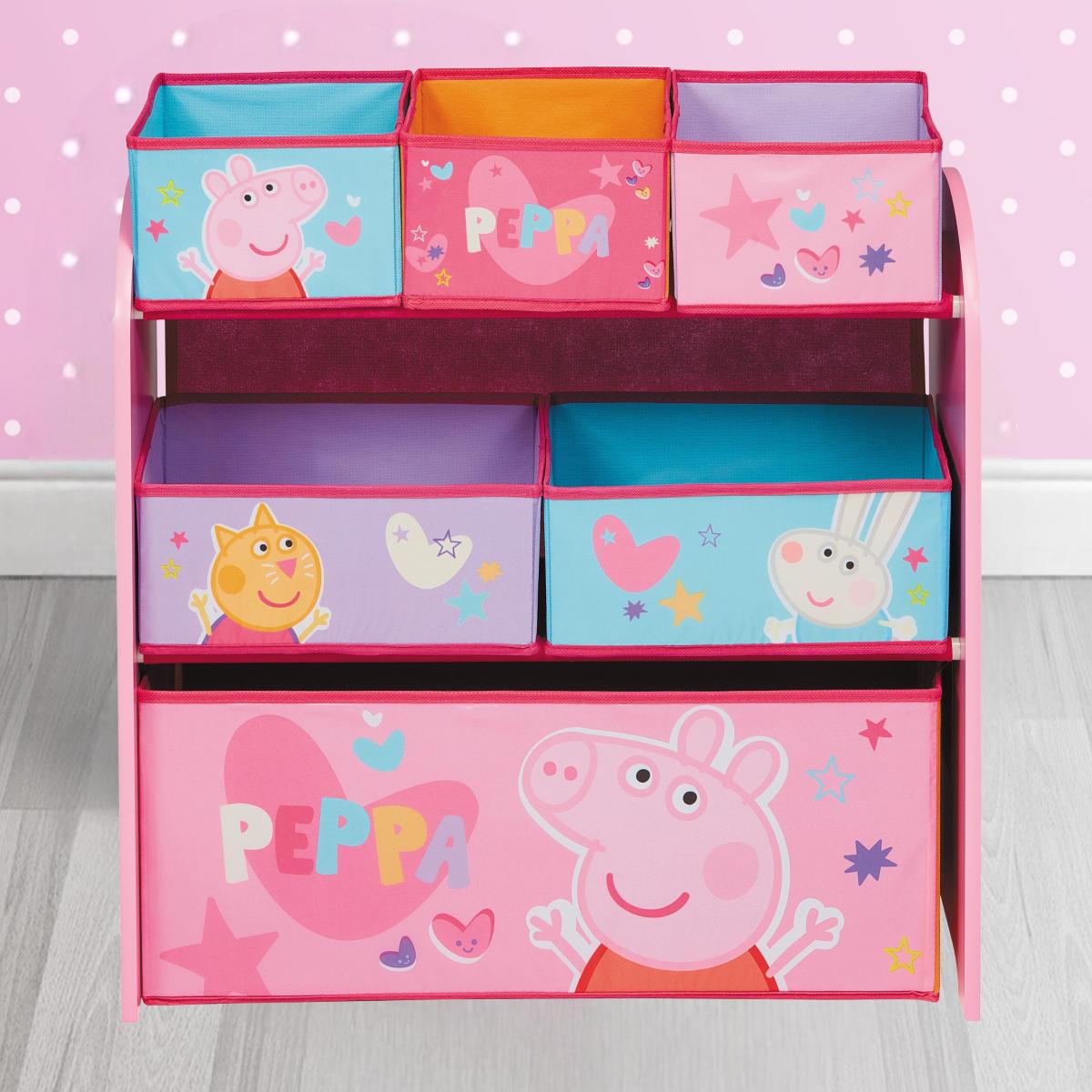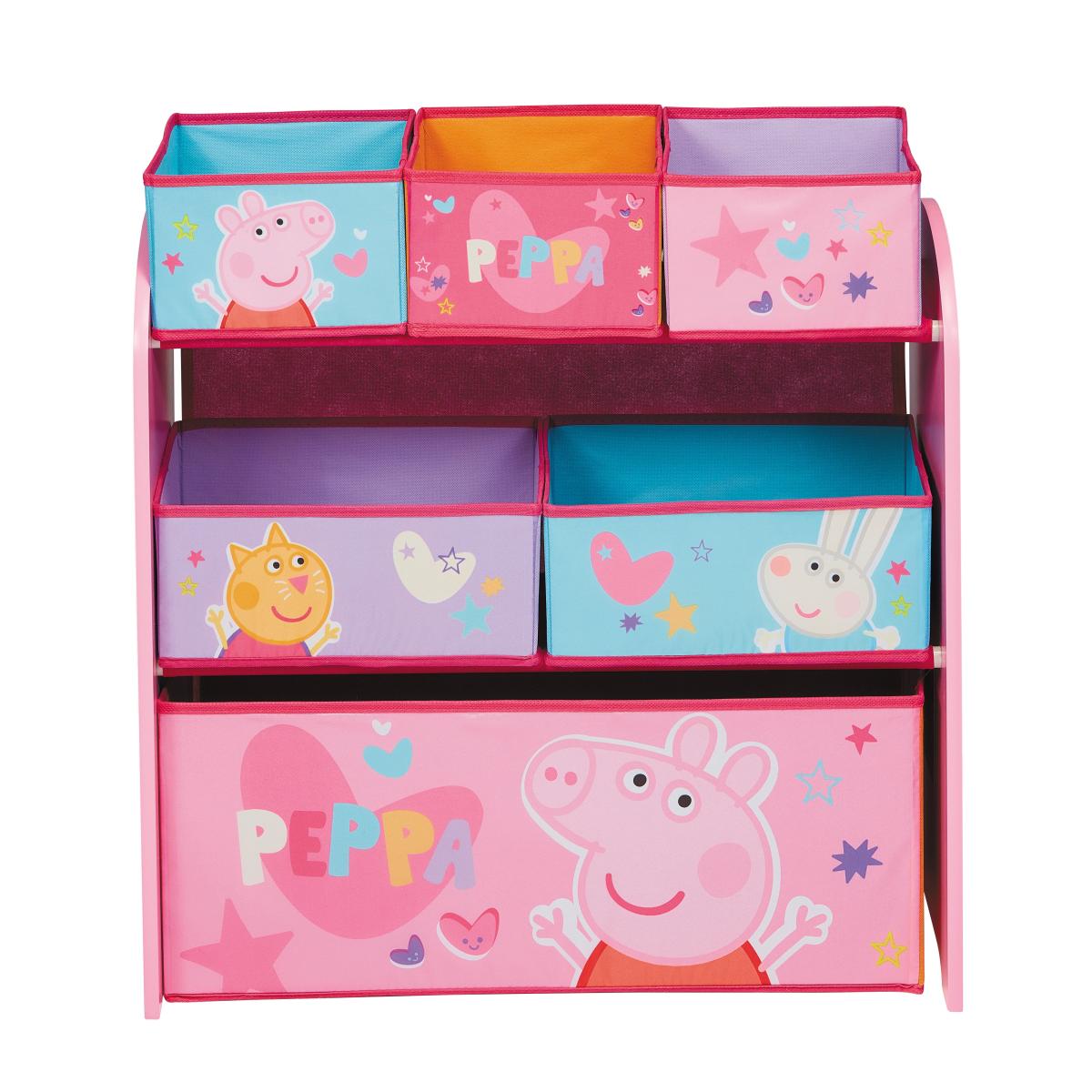 * Wooden frame* Multi-sized bins* Easy to assemble This unit is the ultimate storage solution to keep your child's books, toys, and supplies neatly in order. Featuring a delightful Peppa Pig design, this organiser is perfect for any playroom or bedroom. With six uniquely sized storage boxes, tidying up becomes a fun and exciting activity for your little one. Easy to assemble and designed to look great in any child's space, this high-quality toy organiser makes clean-up a breeze while adding a playful touch to the room.