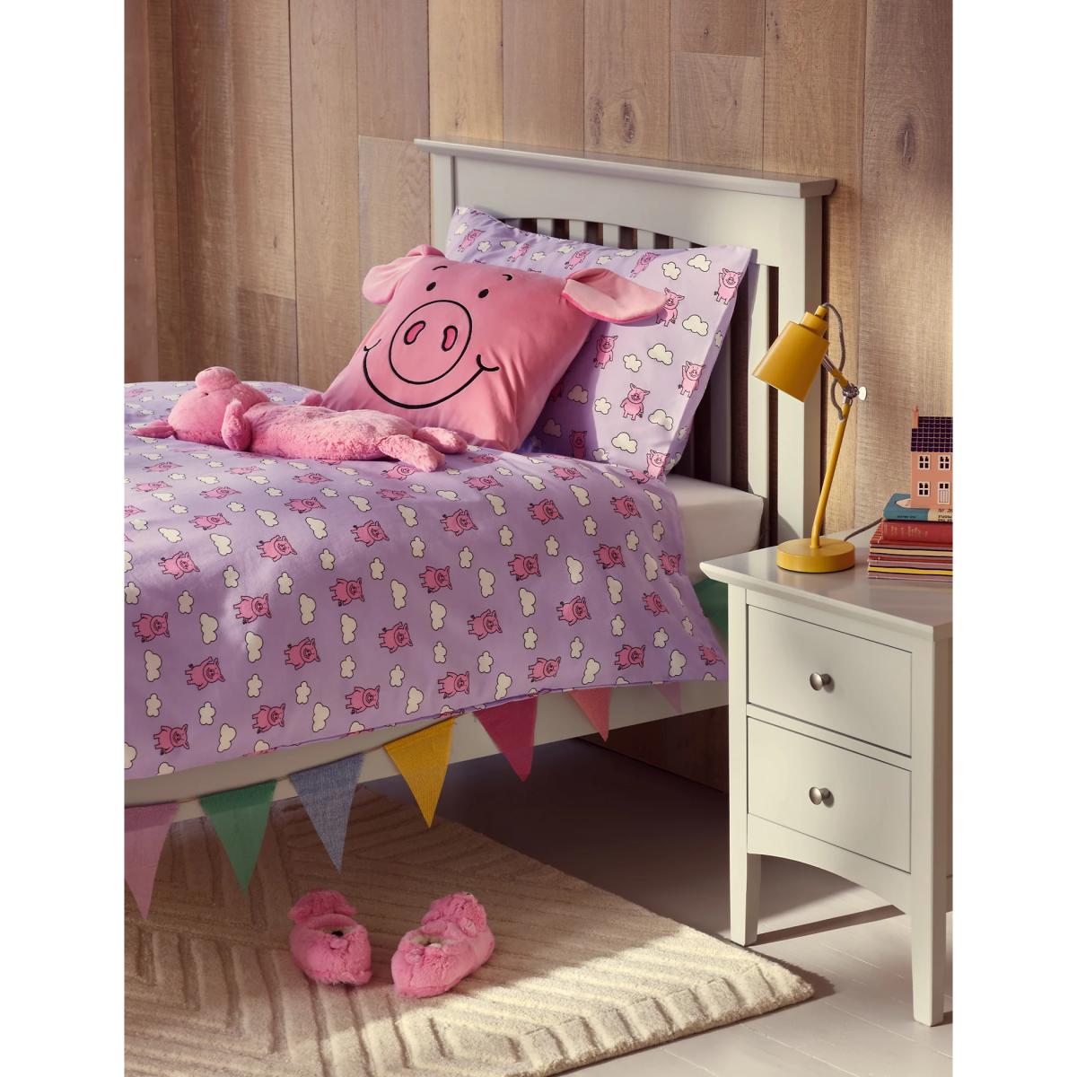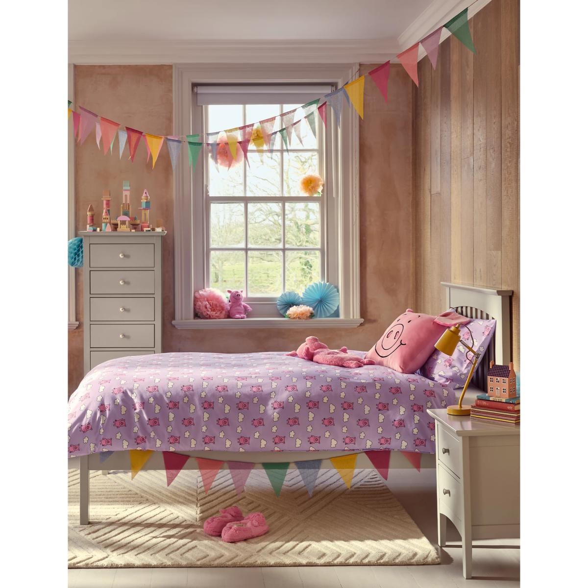 I love this Percy Pig™ clouds bedding-its playful pig and cloud print brings a cheerful touch to any child's room. The lilac mix colour adds a soft, calming vibe that works well in both contemporary and traditional interiors. To style it effectively, pair it with neutral or pastel-toned accessories to keep the look light and airy, or introduce some colourful cushions or a plush rug for added comfort and visual interest. Its cotton blend fabric not only makes it durable for everyday use but also easy to care for, perfect for busy family homes. Overall, it’s a practical yet adorable set that balances fun with style, ideal for creating a cosy, kid-friendly space.