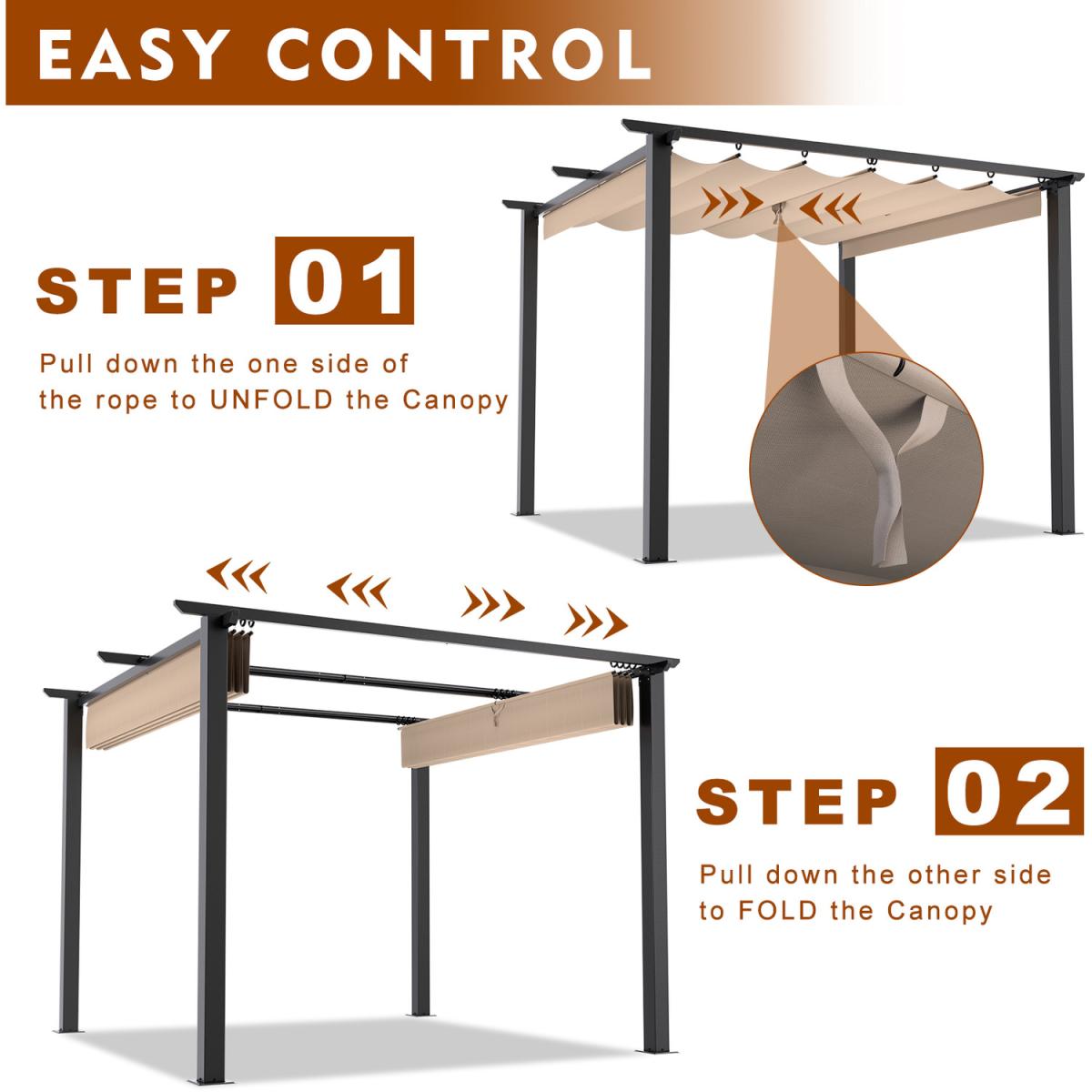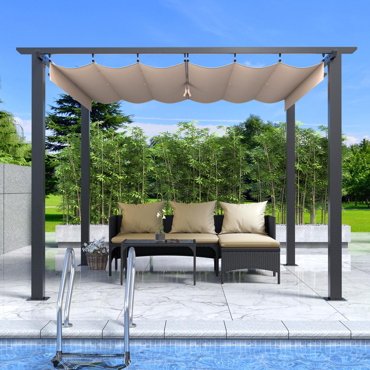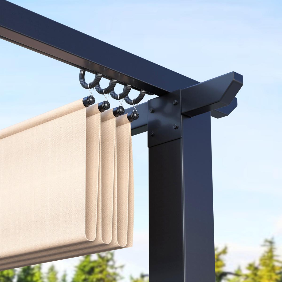 The pergola gazebo is equipped with a thicker canopy which is made of 160g PU-coated polyester with reinforced PA coating for better waterproof, UV-resistant and colour-fading-resistant concerns, keeping your family cosy and safe. Pergola has an adjustable canopy that can open or fold up and away, allowing you to control how much sun your seating arrangement gets. The sunshade canopy is designed as removable and retractable with a magnetic catch on one side for you to adjust depending on your own needs. This outdoor shelter gazebo combines a simple but elegant design, suitable for various occasions. Adds an elegant and relaxed outdoor space for dining or entertaining in your garden, pool, deck, patio, or yard. It even can be used as a grape rack with a rattan chair to decorate your backyard.