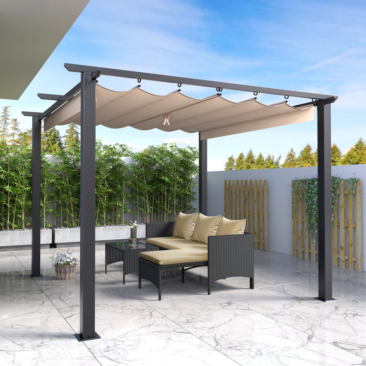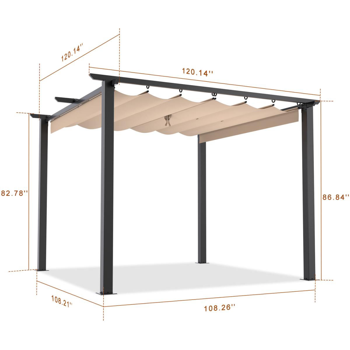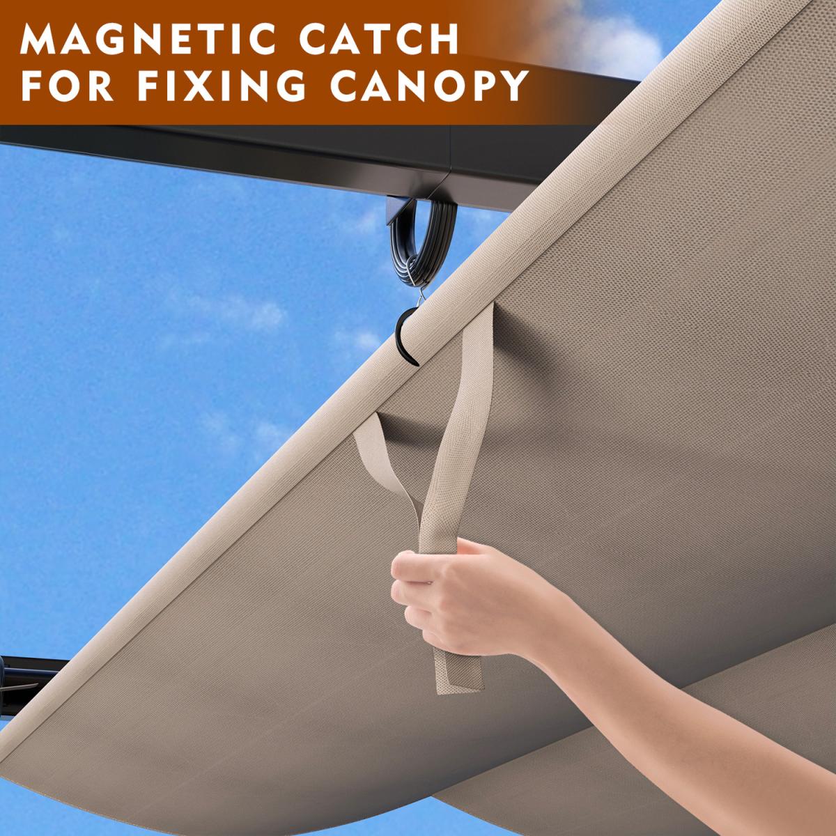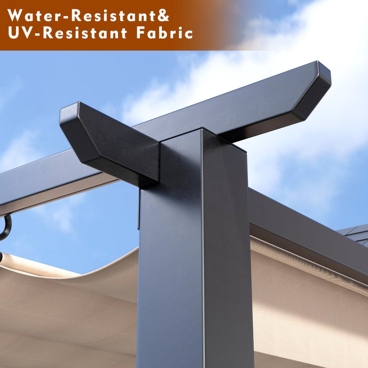 The pergola gazebo is equipped with a thicker canopy which is made of 160g PU-coated polyester with reinforced PA coating for better waterproof, UV-resistant and colour-fading-resistant concerns, keeping your family cosy and safe. Pergola has an adjustable canopy that can open or fold up and away, allowing you to control how much sun your seating arrangement gets. The sunshade canopy is designed as removable and retractable with a magnetic catch on one side for you to adjust depending on your own needs. This outdoor shelter gazebo combines a simple but elegant design, suitable for various occasions. Adds an elegant and relaxed outdoor space for dining or entertaining in your garden, pool, deck, patio, or yard. It even can be used as a grape rack with a rattan chair to decorate your backyard.