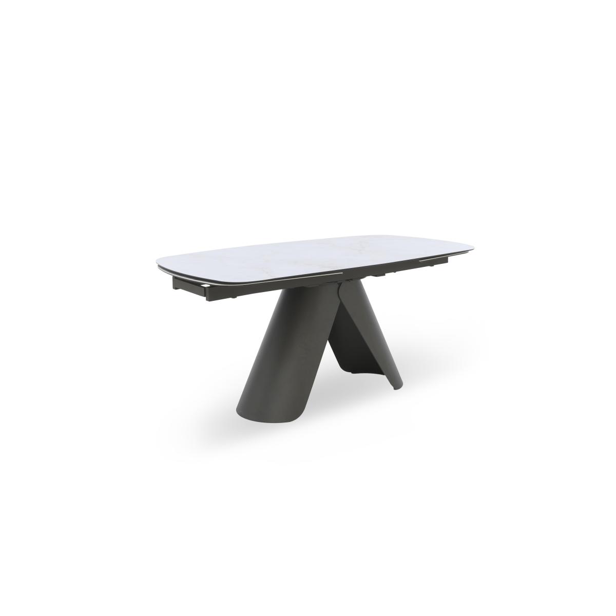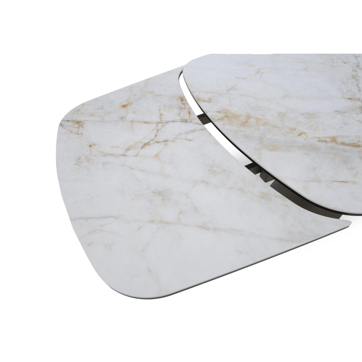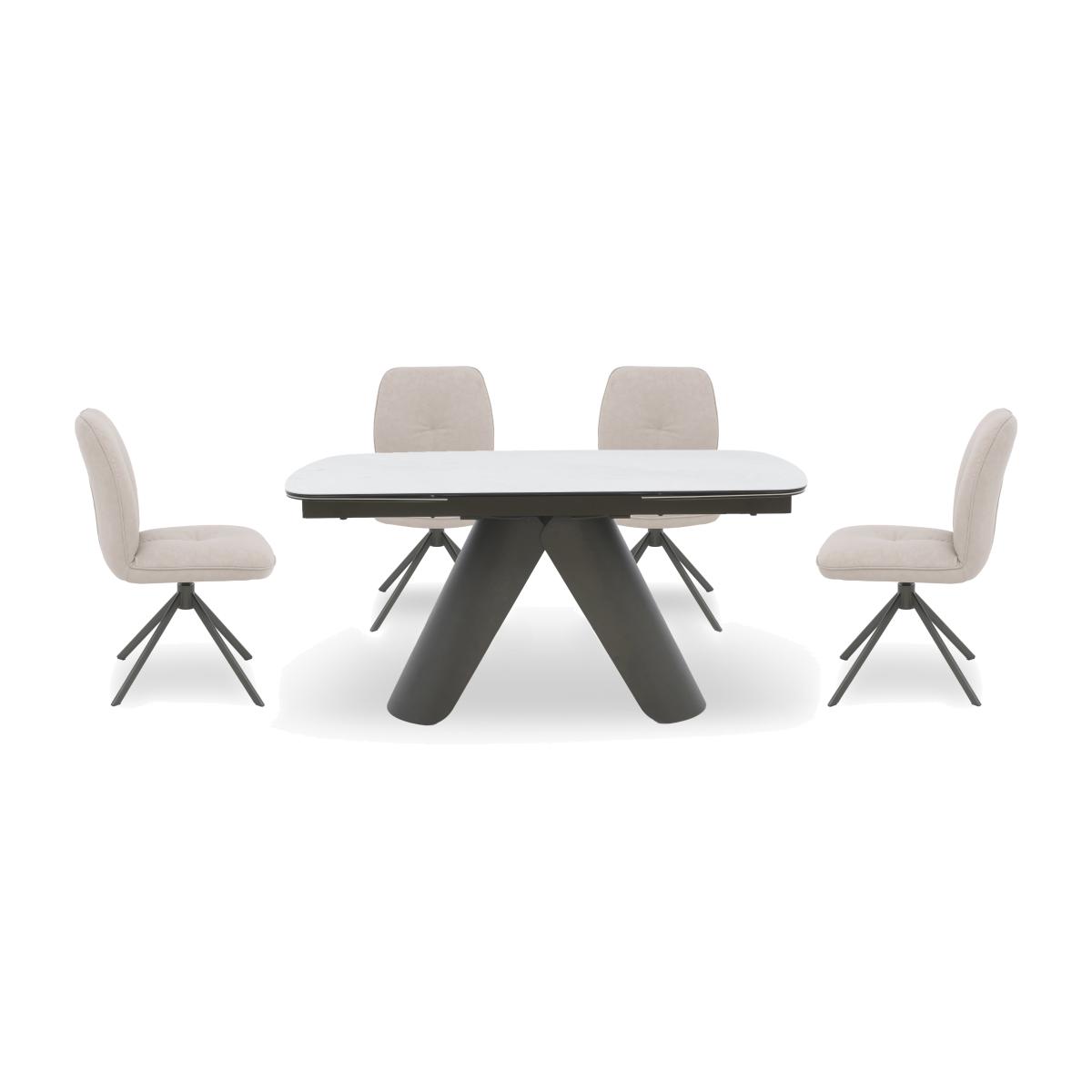Our Perla range takes everything we love about statement dining style and gives it a new glam look. You’ll find surfaces finished with gorgeous ceramic imported from Italy, statement metal table bases and chair legs with a bronze-toned finish, and distinctive design elements like the oval-shaped dining table top, the sideboard’s curved silhouette and the swivel-top coffee table. Designed for real-life living, the super-comfy dining chairs have swivel bases that neatly return the chairs to their original position, and ceramic surfaces are bonded to tempered glass for easy cleaning and durability. Bring home singular glam style with the Perla range. This dining set will wow any crowd. Offered in two sizes, the oval-shaped extending dining table has a glossy ceramic top and a statement metal base. With four beautiful faux leather swivel dining chairs. Why you'll love it Singular glam style with a gorgeous finish – this dining set is sensational. Curvaceous oval dining table leads the way in bold modern design. Beautiful pearl-coloured Italian ceramic top with a high-gloss finish. Absolutely stunning metal base has a dark bronze finish. Striking style and a practical finish makes this table perfect for any occasion. Ceramic is heatproof and both scratch- and chip-resistant. The ceramic top is bonded to tempered glass for extra strength and durability. Extends in seconds – extra leaves simply pull out from the table ends. Table is available in 2 sizes, the largest of which seats 10 when extended. Set includes 4 dining chairs upholstered in taupe faux leather. Well-cushioned seats with very supportive backs. Auto-return swivel bases. Metal legs have a very stylish dark bronze finish. This dining set is part of our Perla range. What you need to know Dining chairs have metal frames and legs and are cushioned with foam. The small 160 cm dining table seats 6 closed and 8 when extended. The large 180 cm dining table seats 8 closed and 10 when extended. This dining table is very heavy and should not be moved once in place. We recommend using coasters and placemats at all times. Easy to care for. Simply wipe with a clean damp cloth and dry with a soft duster. Do not use abrasive cleaning products. Item code: PERLDSET14-001