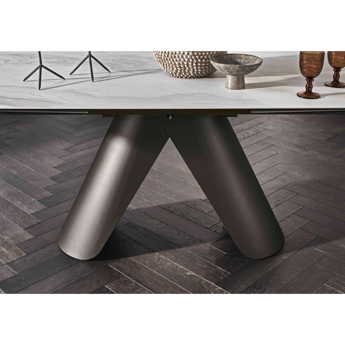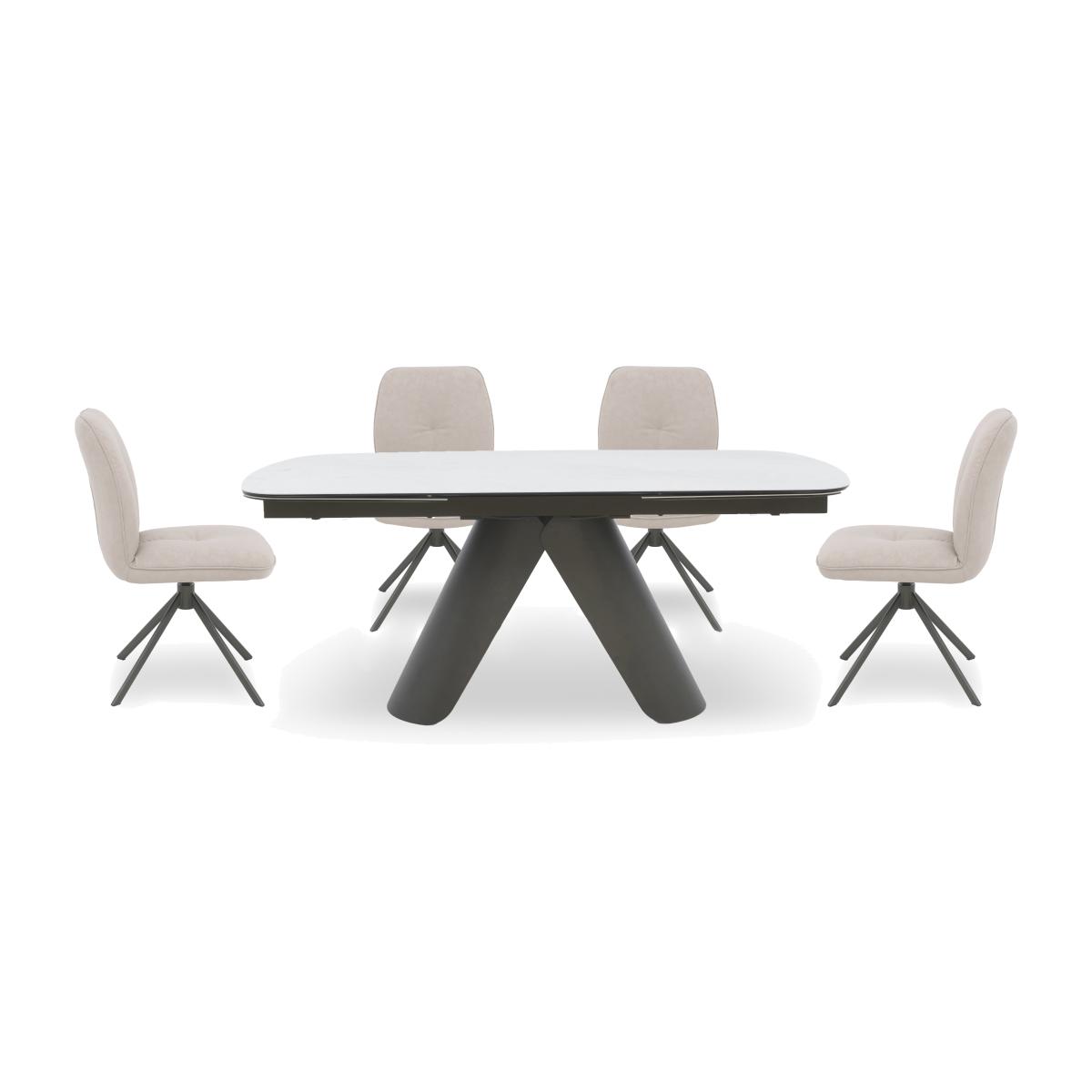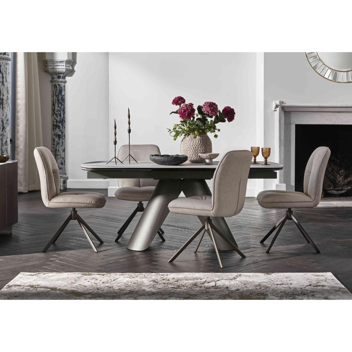 Our Perla range takes everything we love about statement dining style and gives it a new glam look. You’ll find surfaces finished with gorgeous ceramic imported from Italy, statement metal table bases and chair legs with a bronze-toned finish, and distinctive design elements like the oval-shaped dining table top, the sideboard’s curved silhouette and the swivel-top coffee table. Designed for real-life living, the super-comfy dining chairs have swivel bases that neatly return the chairs to their original position, and ceramic surfaces are bonded to tempered glass for easy cleaning and durability. Bring home singular glam style with the Perla range. This very stylish dining set brings together gorgeous ceramic with bronze-toned metal surfaces and is paired with a set of four faux leather dining chairs. Why you'll love it Singular glam style with a gorgeous finish – this dining set is sensational. Curvaceous oval dining table leads the way in bold modern design. Beautiful pearl-coloured Italian ceramic top. Extends in seconds to seat 10. Extra leaves pull out from the table ends. Absolutely stunning metal base has a dark bronze finish. Striking style and a practical finish makes this table perfect for any occasion. Ceramic is heatproof and both scratch- and chip-resistant. The ceramic top is bonded to tempered glass for extra strength and durability. Set includes 4 dining chairs upholstered in taupe faux leather. Well-cushioned seats with very supportive backs. Auto-return swivel bases. Metal legs have a very stylish dark bronze finish. This dining set is part of our Perla range. What you need to know Dining chairs have metal frames and legs, and are cushioned with foam. The large 180 cm dining table seats 8 closed and 10 when extended. This dining table is very heavy and should not be moved once in place. We recommend using coasters and placemats at all times. Easy to care for. Simply wipe with a clean damp cloth and dry with a soft duster. Do not use abrasive cleaning products.