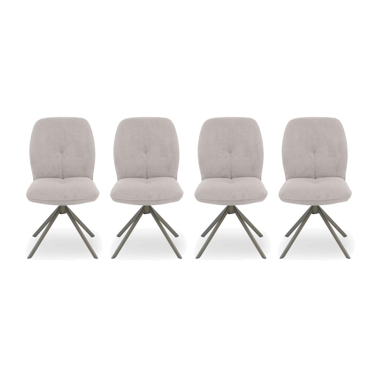 Our Perla range takes everything we love about statement dining style and gives it a new glam look. You’ll find surfaces finished with gorgeous ceramic imported from Italy, statement metal table bases and chair legs with a bronze-toned finish, and distinctive design elements like the oval-shaped dining table top, the sideboard’s curved silhouette and the swivel-top coffee table. Designed for real-life living, the super-comfy dining chairs have swivel bases that neatly return the chairs to their original position, and ceramic surfaces are bonded to tempered glass for easy cleaning and durability. Bring home singular glam style with the Perla range. Bring home this set of four swivel-base dining chairs and enjoy sleek and well-designed seating. The bronze-toned metal legs add subtle glam style. Why you'll love it Glam and elegant style meets superb dining comfort. Well-cushioned seat with a very supportive back. Swivel mechanisms automatically return these chairs to their original position. Metal legs have a very stylish dark bronze finish. Soft fabric upholstery in stone. Simply stunning with a Perla ceramic extending dining table. Also available individually and in sets of 2 and 6 dining chairs. This set of 4 swivel dining chairs is part of our Perla range. What you need to know Metal frames and legs. Cushioned with foam.