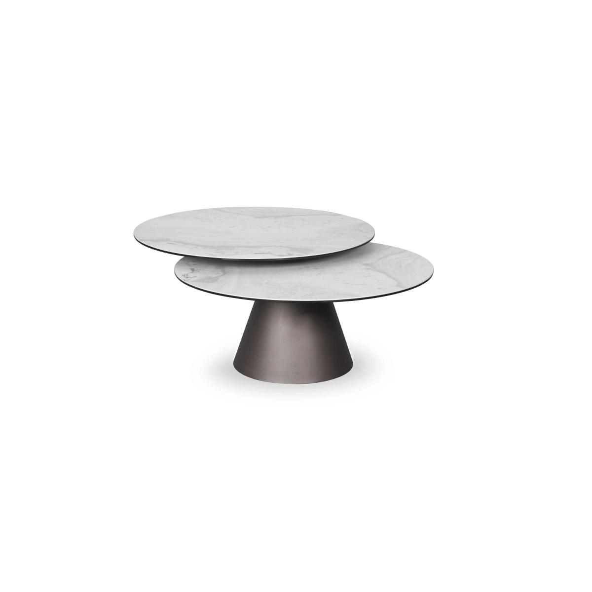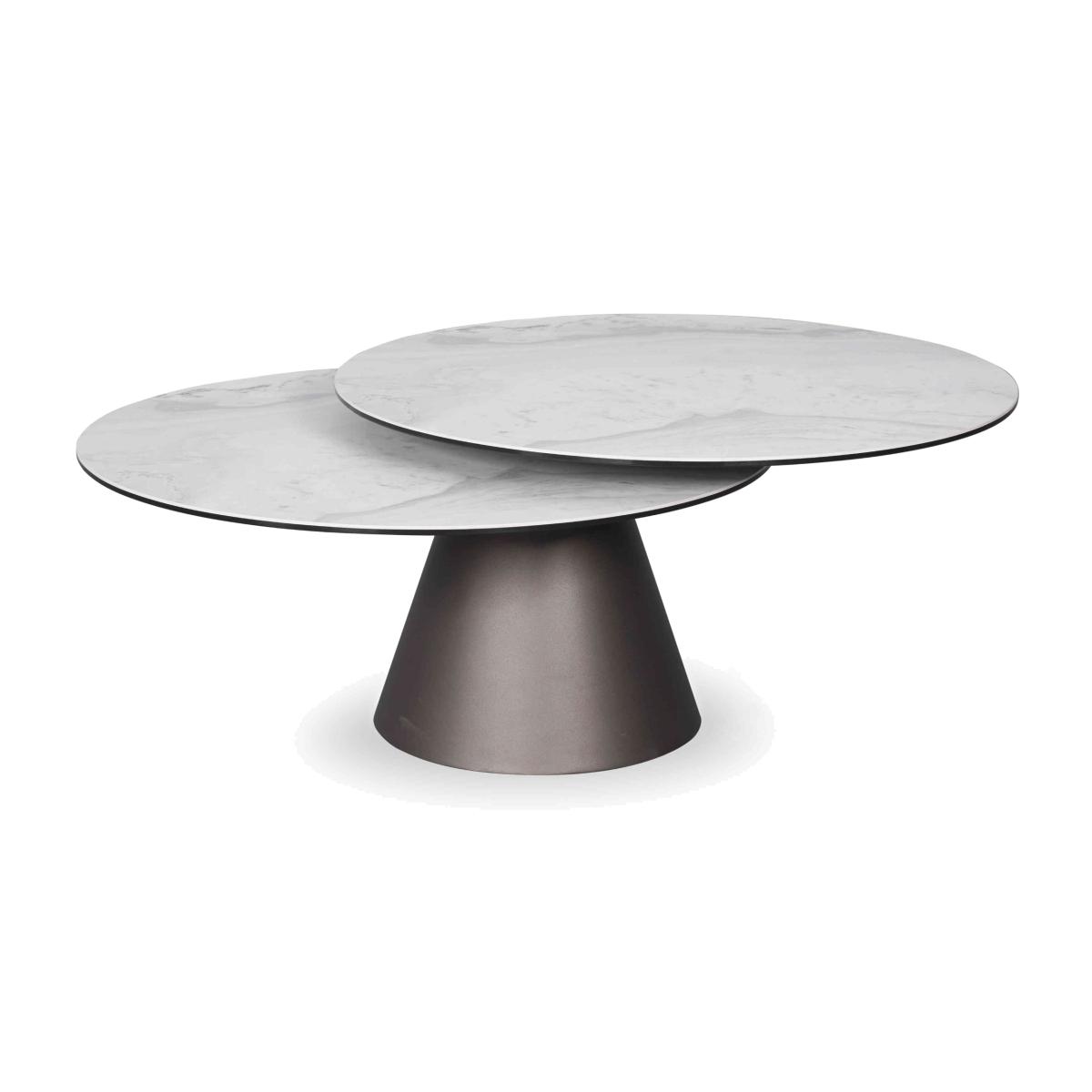 Our Perla range takes everything we love about statement dining style and gives it a new glam look. You’ll find surfaces finished with gorgeous ceramic imported from Italy, statement metal table bases and chair legs with a bronze-toned finish, and distinctive design elements like the oval-shaped dining table top, the sideboard’s curved silhouette and the swivel-top coffee table. Designed for real-life living, the super-comfy dining chairs have swivel bases that neatly return the chairs to their original position, and ceramic surfaces are bonded to tempered glass for easy cleaning and durability. Bring home singular glam style with the Perla range. This coffee table is as clever as it is striking. The top rotates to reveal a second table, both with beautiful Italian ceramic tops. Why you'll love it Singular glam style with a gorgeous finish. Curvaceous coffee table leads the way in bold modern design. The top of this round coffee table swivels to reveal a second table top. Beautiful pearl-coloured Italian ceramic table tops. Metal base has a dark bronze finish. Striking style and a practical finish makes this coffee table perfect for any home. Ceramic is heatproof and both scratch- and chip-resistant. The ceramic table tops are bonded to tempered glass for extra strength and durability. This swivel coffee table is part of our Perla range. What you need to know We recommend using coasters and placemats at all times. Easy to care for. Simply wipe with a clean damp cloth and dry with a soft duster. Do not use abrasive cleaning products.
