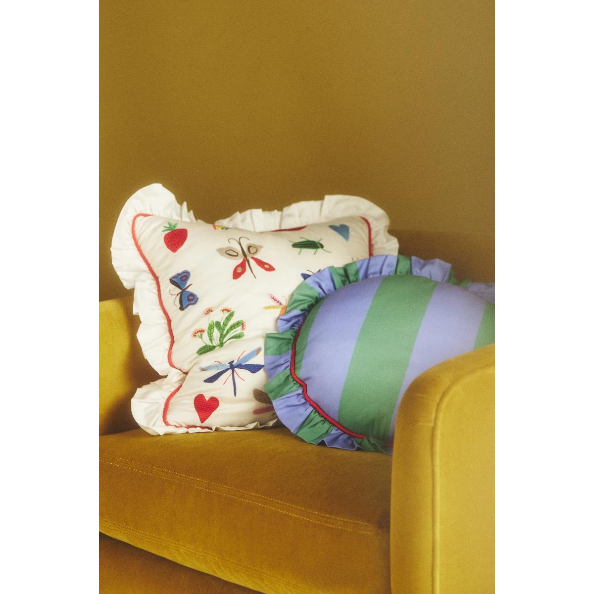 This embroidered cushion is a lovely choice for adding a playful yet sophisticated touch to a variety of interiors. Its colourful embroidery makes it ideal for a boho or eclectic space, and it can also work well in more pared-back settings, providing a lively contrast. I love pairing it with neutral-toned sofas or beds to let the embroidery stand out, and it’s perfect for layering alongside other textured or patterned cushions for a curated look. As a practical tip, use it to introduce a pop of colour or whimsy without overwhelming the overall aesthetic. Its embroidered details and ruffled edge make it a versatile piece that can brighten up both modern and vintage-inspired interiors.