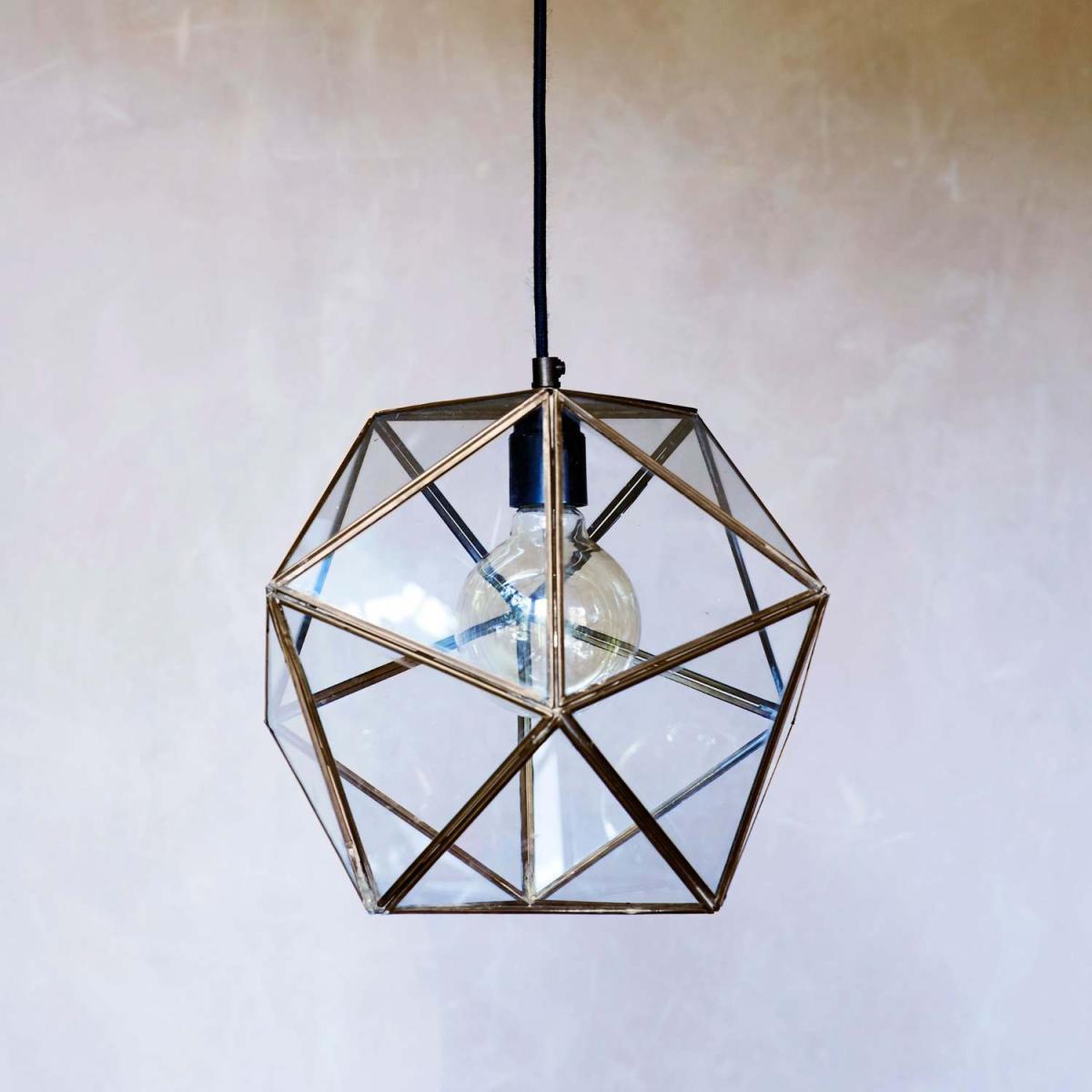 A stunning faceted light pendant with a geometric glass and bronze frame, that creates a distinctive focal point in any room.