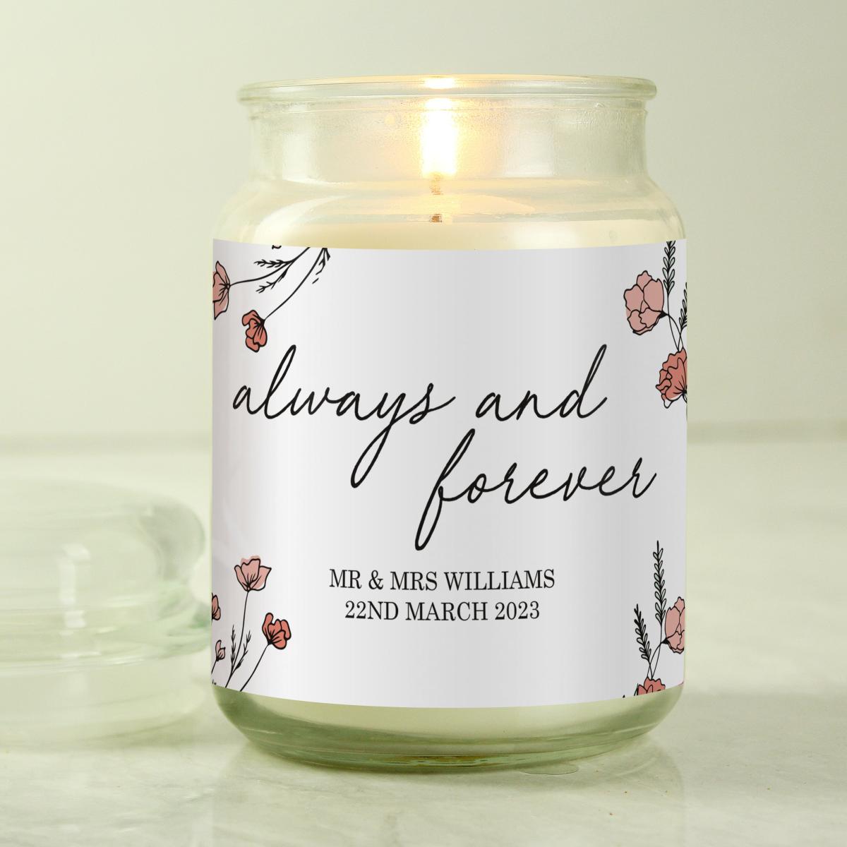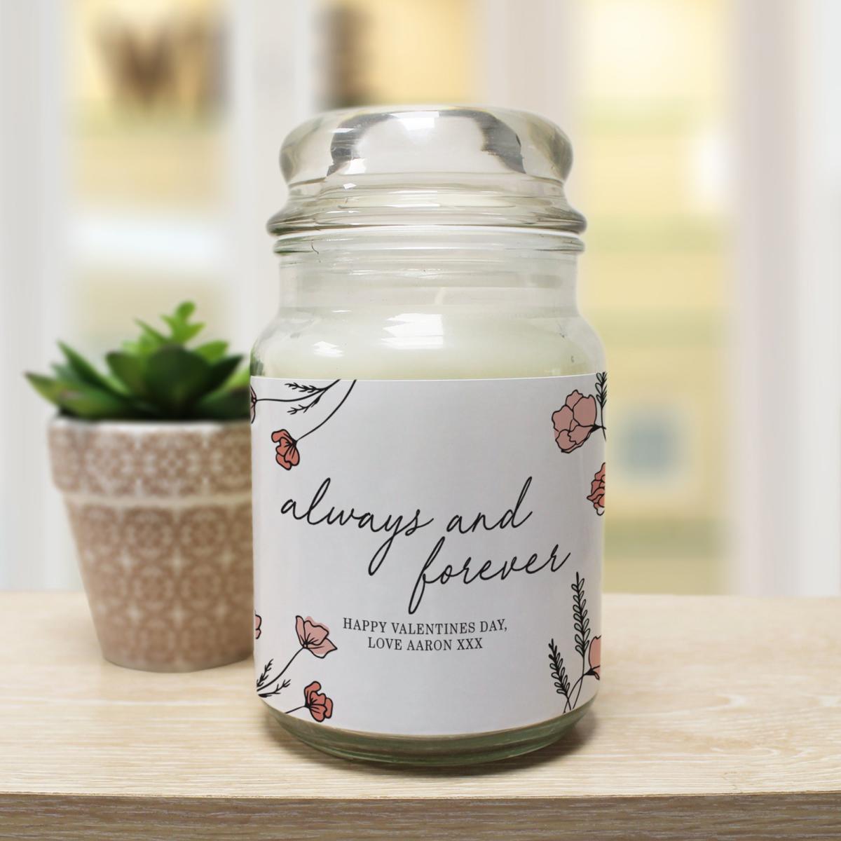 * Please see below on how to personalise your candle:* Line 1 and Line 2: Up to 30 characters each (fixed upper case). * " Always & forever" is fixed text. * Burn time is approximately 110 hours. * A cute way to say 'I Love You'. Our Personalised Always & Forever Large Scented Jar Candle is a cute way to say 'I Love You'.**How to personalise your product:**1. Place your order2. You will receive an email from dunelm@personalisedmemento. co. uk within 1 hour to add your personalised message. If not received, please check your junk folder.3. Once received, follow the link within the email.4. Type your message into the fields on screen and click on the preview button to review the personalisation.5. Once checked and happy, click submit.6. Production of the order will commence.**Please note:*** The content on a personalised product will be produced exactly as you enter it, including spelling and capitalisation. Please ensure that all details, especially the personalised text, are correct before clicking submit.* Accents, special characters and emojis are not accepted.* Once the personalisation has been submitted, the order cannot be amended or cancelled. * If the personalisation is not submitted within 3 days, the order will be automatically cancelled. * We do not permit personalisation that infringes copyright laws, is indecent or offensive, or contains language deemed to be abusive, threatening, or defamatory. Full content rules can be viewed in the [terms and conditions](https://www. dunelm. com/info/help/personalised-goods-terms-and-conditions). Orders that do not follow these rules will be refused. By ordering a personalised product, you are agreeing that your details (name and contact details, including address) and the details that you provide of any other party, such as the recipient of the personalised product, can be shared with our third party supplier who provides the personalisation service only for the purposes of completing the personalisation service and delivering the product to you or the recipient. Our Privacy Policy is here: [Privacy Policy | Dunelm](https://www. dunelm. com/info/help/privacy).