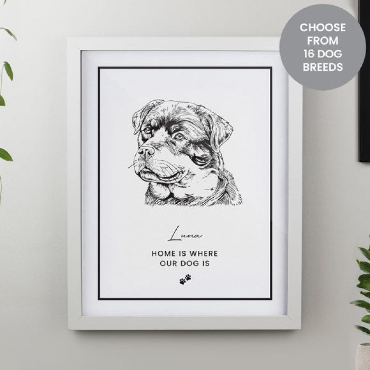 * Personalised framed print * Choice of dog breed illustration * Up to 3 lines of personalised text * Choice of frame colours to suit your space Celebrate your furry friend with our Personalised Dog Breed Framed Print. This striking piece of wall art showcases a detailed illustration of your chosen breed, paired with your own heartfelt message. Presented in a sleek frame in a choice of colours, it’s designed to bring a touch of elegance to any space. Perfect as a gift or a personal keepsake, this print is a timeless way to honour your beloved companion. Add your own personalised message:Line 1 - 20 characters. Line 2 - 30 characters. Line 3 - 30 characters. Please note, the text on line 1 is case sensitive and will appear as entered. Please refrain from using uppercase as this could make the script font difficult to read. All other personalisation will appear in fixed UPPERCASE.**How to personalise your product:** 1. Place your order 2. You will receive an email from dunelm@personalisedmemento.co.uk within 1 hour to add your personalised message. If not received, please check your junk folder. 3. Once received, follow the link within the email. 4. Type your message into the fields on screen and click on the preview button to review the personalisation. 5. Once checked and happy, click submit. 6. Production of the order will commence. **Please note:** * The content on a personalised product will be produced exactly as you enter it, including spelling and capitalisation. Please ensure that all details, especially the personalised text, are correct before clicking submit. * Accents, special characters and emojis are not accepted. * Once the personalisation has been submitted, the order cannot be amended or cancelled. If the personalisation is not submitted within 3 days, the order will be automatically cancelled. * We do not permit personalisation that infringes copyright laws, is indecent or offensive, or contains language deemed to be abusive, threatening, or defamatory. Full content rules can be viewed on the personalisation terms and conditions page. Orders that do not follow these rules will be refused. By ordering a personalised product, you are agreeing that your details (name and contact details, including address) and the details that you provide of any other party, such as the recipient of the personalised product, can be shared with our third party supplier who provides the personalisation service only for the purposes of completing the personalisation service and delivering the product to you or the recipient.