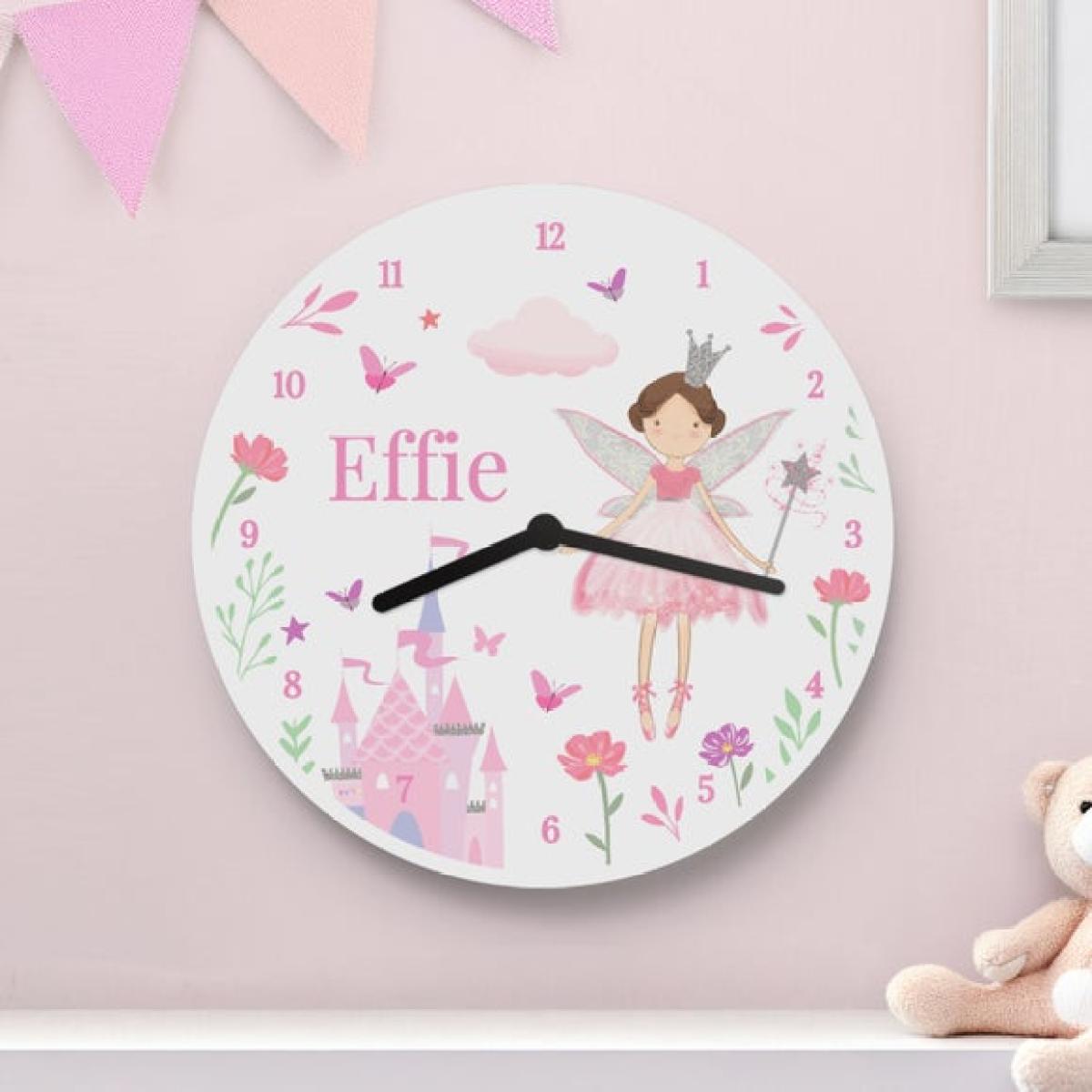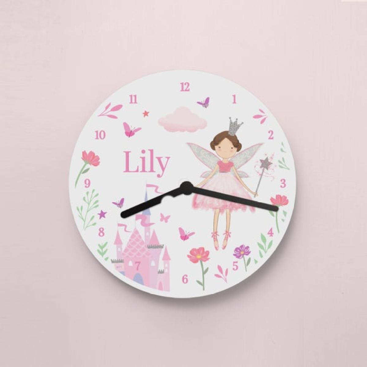 Introducing our Personalised Fairy Princess Clock, a charming addition to any little one's room! This enchanting clock is handcrafted from lightweight white wood board, featuring a delicate fairy design. The gentle pastel colours and intricate details make it a whimsical focal point, perfect for nurseries or playrooms. What makes this clock truly special is the personalisation option...add your child's name to create a unique keepsake they'll treasure forever. With its silent, non-ticking movement, this clock ensures peaceful sleep, while also helping your child learn to tell time in a magical way. The clock requires 1 x AA battery, which is not included.**How to personalise your product:** 1. Place your order 2. You will receive an email from dunelm@personalisedmemento.co.uk within 1 hour to add your personalised message. If not received, please check your junk folder. 3. Once received, follow the link within the email. 4. Type your message into the fields on screen and click on the preview button to review the personalisation. 5. Once checked and happy, click submit. 6. Production of the order will commence. **Please note:** * The content on a personalised product will be produced exactly as you enter it, including spelling and capitalisation. Please ensure that all details, especially the personalised text, are correct before clicking submit. * Accents, special characters and emojis are not accepted. * Once the personalisation has been submitted, the order cannot be amended or cancelled. If the personalisation is not submitted within 3 days, the order will be automatically cancelled. * We do not permit personalisation that infringes copyright laws, is indecent or offensive, or contains language deemed to be abusive, threatening, or defamatory. Full content rules can be viewed on the personalisation terms and conditions page. Orders that do not follow these rules will be refused. By ordering a personalised product, you are agreeing that your details (name and contact details, including address) and the details that you provide of any other party, such as the recipient of the personalised product, can be shared with our third party supplier who provides the personalisation service only for the purposes of completing the personalisation service and delivering the product to you or the recipient.