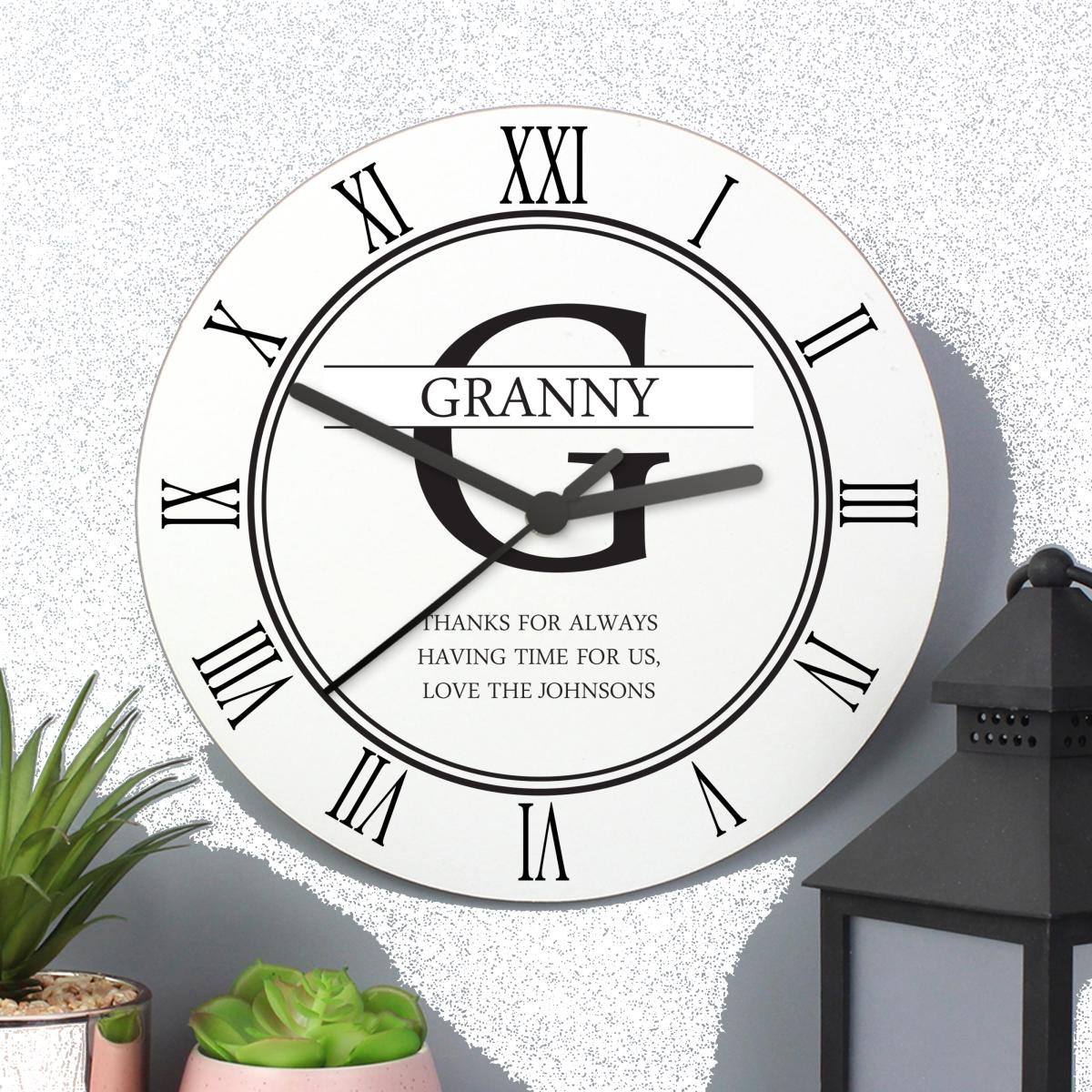 * Please see below on how to personalise your clock* Perfect gift for any occasion!* Personalize with up to 5 lines of text:* Initial - 1 character* Line 1: Up to 15 characters (Surname)* Line 2-4: Up to 30 characters per line* Personalisation in fixed uppercase* Requires 1 x AA battery (not included) * Made from lightweight white wood board* Roman Numeral Display This Personalised Family Name and Initial Wooden Clock is a versatile gift suitable for any occasion. With its customisable design, it's a thoughtful way to celebrate family and home.**How to personalise your product:**1. Place your order2. You will receive an email from dunelm@personalisedmemento. co. uk within 1 hour to add your personalised message. If not received, please check your junk folder.3. Once received, follow the link within the email.4. Type your message into the fields on screen and click on the preview button to review the personalisation.5. Once checked and happy, click submit.6. Production of the order will commence.**Please note:*** The content on a personalised product will be produced exactly as you enter it, including spelling and capitalisation. Please ensure that all details, especially the personalised text, are correct before clicking submit.* Accents, special characters and emojis are not accepted.* Once the personalisation has been submitted, the order cannot be amended or cancelled. * If the personalisation is not submitted within 3 days, the order will be automatically cancelled. * We do not permit personalisation that infringes copyright laws, is indecent or offensive, or contains language deemed to be abusive, threatening, or defamatory. Full content rules can be viewed in the [terms and conditions](https://www. dunelm. com/info/help/personalised-goods-terms-and-conditions). Orders that do not follow these rules will be refused. By ordering a personalised product, you are agreeing that your details (name and contact details, including address) and the details that you provide of any other party, such as the recipient of the personalised product, can be shared with our third party supplier who provides the personalisation service only for the purposes of completing the personalisation service and delivering the product to you or the recipient. Our Privacy Policy is here: [Privacy Policy | Dunelm](https://www. dunelm. com/info/help/privacy).