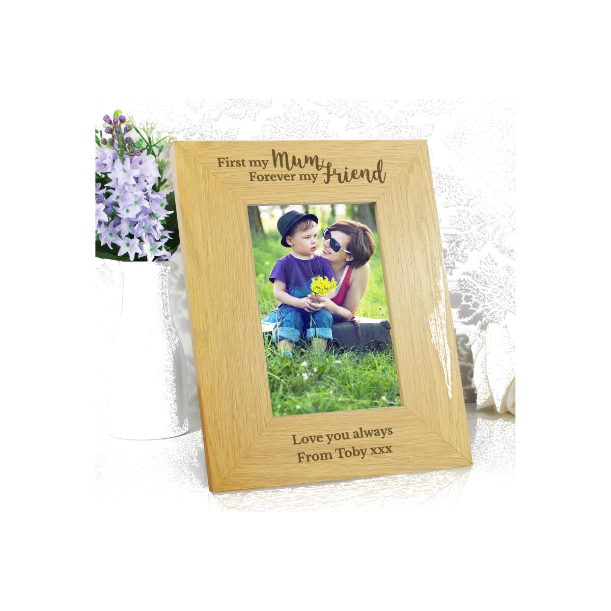 * See below how to personalise your frame* Perfect gift for all mums* Personalise with 2 lines of text, up to 25 characters each* 'First my mum' and 'Forever my friend' are fixed words* All text is case sensitive and appears as entered* Oak Effect Paper Veneer finish Celebrate your mum this Mother's Day and beyond with the Personalised 'First My Mum, Forever My Friend' Light Wood Portrait Photo Frame. Personalise it with your message to make her smile and show your love.**How to personalise your product:**1. Place your order2. You will receive an email from dunelm@personalisedmemento. co. uk within 1 hour to add your personalised message. If not received, please check your junk folder.3. Once received, follow the link within the email.4. Type your message into the fields on screen and click on the preview button to review the personalisation.5. Once checked and happy, click submit.6. Production of the order will commence.**Please note:*** The content on a personalised product will be produced exactly as you enter it, including spelling and capitalisation. Please ensure that all details, especially the personalised text, are correct before clicking submit.* Accents, special characters and emojis are not accepted.* Once the personalisation has been submitted, the order cannot be amended or cancelled. * If the personalisation is not submitted within 3 days, the order will be automatically cancelled. * We do not permit personalisation that infringes copyright laws, is indecent or offensive, or contains language deemed to be abusive, threatening, or defamatory. Full content rules can be viewed in the [terms and conditions](https://www. dunelm. com/info/help/personalised-goods-terms-and-conditions). Orders that do not follow these rules will be refused. By ordering a personalised product, you are agreeing that your details (name and contact details, including address) and the details that you provide of any other party, such as the recipient of the personalised product, can be shared with our third party supplier who provides the personalisation service only for the purposes of completing the personalisation service and delivering the product to you or the recipient. Our Privacy Policy is here: [Privacy Policy | Dunelm](https://www. dunelm. com/info/help/privacy).