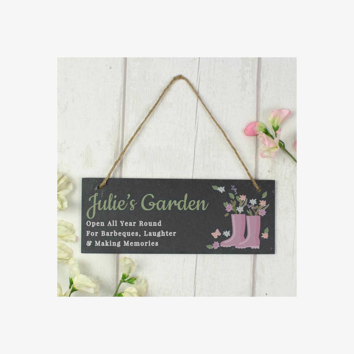 * Personalisable * Crafted from natural slate * Lovely gift idea Add a touch of rustic charm to your garden with our beautiful Personalised Floral Slate Garden Sign. Crafted from natural slate, each piece boasts unique variations in texture and tone, making it one-of-a-kind. The delicate floral design is perfect for garden lovers and nature enthusiasts alike. Personalise with up to 20 characters on one bold line and 3 additional lines of text, each up to 30 characters. Featuring a rustic string for easy hanging, this slate sign adds character and warmth to any space. Please note, as each slate is hand-cut, natural variations such as flaking or uneven edges may occur, adding to its rustic charm.**How to personalise your product:** 1. Place your order 2. You will receive an email from dunelm@personalisedmemento.co.uk within 1 hour to add your personalised message. If not received, please check your junk folder. 3. Once received, follow the link within the email. 4. Type your message into the fields on screen and click on the preview button to review the personalisation. 5. Once checked and happy, click submit. 6. Production of the order will commence. **Please note:** * The content on a personalised product will be produced exactly as you enter it, including spelling and capitalisation. Please ensure that all details, especially the personalised text, are correct before clicking submit. * Accents, special characters and emojis are not accepted. * Once the personalisation has been submitted, the order cannot be amended or cancelled. If the personalisation is not submitted within 3 days, the order will be automatically cancelled. * We do not permit personalisation that infringes copyright laws, is indecent or offensive, or contains language deemed to be abusive, threatening, or defamatory. Full content rules can be viewed in the [terms and conditions](https://www.dunelm.com/info/help/personalised-goods-terms-and-conditions). Orders that do not follow these rules will be refused. By ordering a personalised product, you are agreeing that your details (name and contact details, including address) and the details that you provide of any other party, such as the recipient of the personalised product, can be shared with our third party supplier who provides the personalisation service only for the purposes of completing the personalisation service and delivering the product to you or the recipient. Our Privacy Policy is here: [Privacy Policy | Dunelm](https://www.dunelm.com/info/help/privacy).