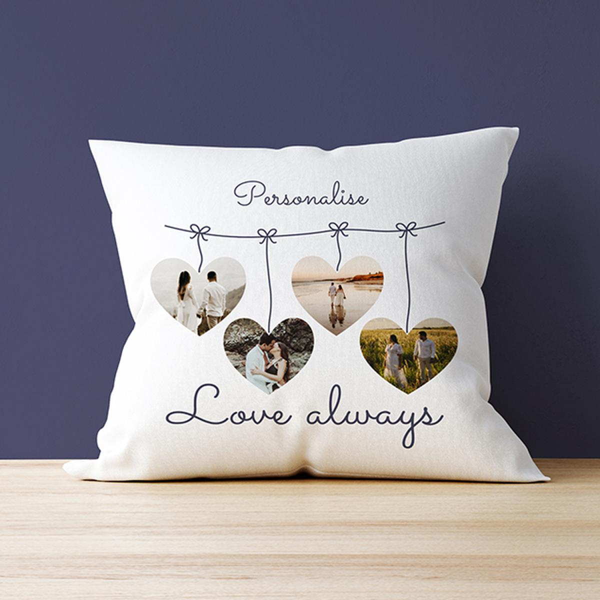 Show your love in photos with this personalised cushion! Choose your favourite moments or a particular memory from your relationship, the options are endless. This makes a great anniversary or valentine's day gift. This personalised cushion comes complete with the inner and would make a great gift!