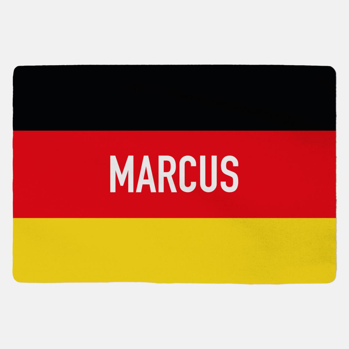This blanket features the German flag and can be personalised with any name up to 12 characters! This luxurious blanket is double layered and lined with a super-soft sherpa fleece material to provide super comfort.