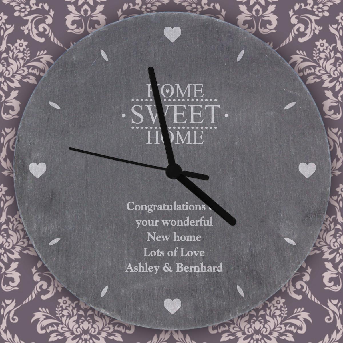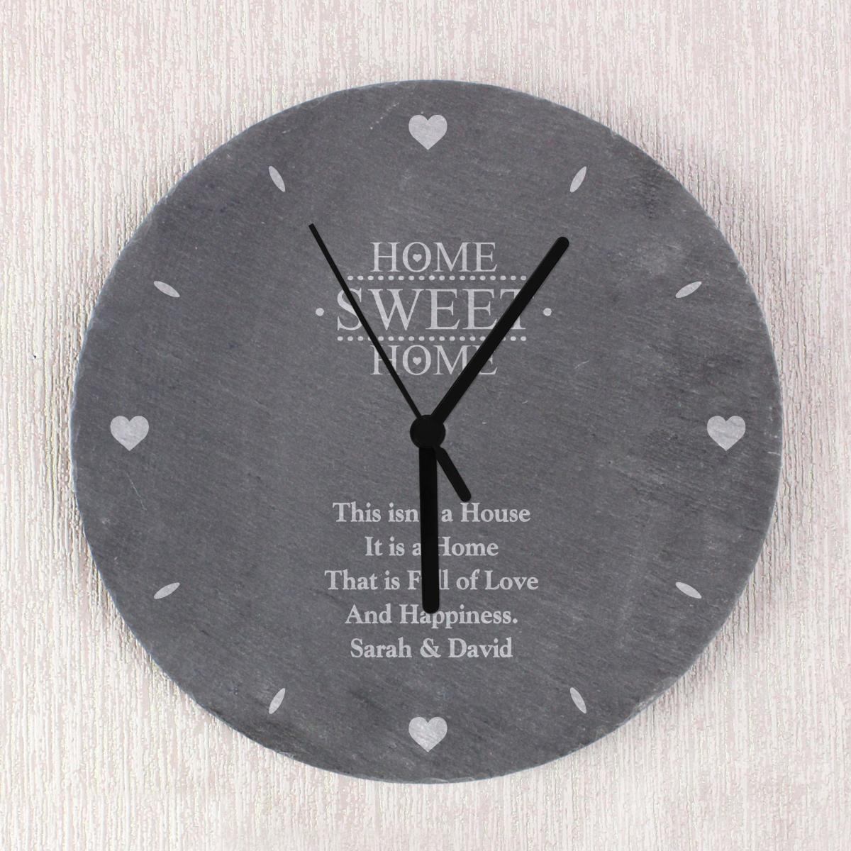 * Please see below on how to personalise your clock* Ideal for new homes or weddings* Personalize with a message over 5 lines:* Line 1-5: Up to 20 characters per line (case sensitive)* " HOME SWEET HOME" is fixed text* Each slate piece is unique with natural variations* Contains speckles of fools gold for a rustic feel* Requires 1 x AA battery (not included)* Numberless display The Personalised Home Sweet Home Slate Clock is a rustic beauty, making it an ideal gift for those starting a new life journey. Personalise it with heartfelt messages to create a warm and welcoming home.**How to personalise your product:**1. Place your order2. You will receive an email from dunelm@personalisedmemento. co. uk within 1 hour to add your personalised message. If not received, please check your junk folder.3. Once received, follow the link within the email.4. Type your message into the fields on screen and click on the preview button to review the personalisation.5. Once checked and happy, click submit.6. Production of the order will commence.**Please note:*** The content on a personalised product will be produced exactly as you enter it, including spelling and capitalisation. Please ensure that all details, especially the personalised text, are correct before clicking submit.* Accents, special characters and emojis are not accepted.* Once the personalisation has been submitted, the order cannot be amended or cancelled. * If the personalisation is not submitted within 3 days, the order will be automatically cancelled. * We do not permit personalisation that infringes copyright laws, is indecent or offensive, or contains language deemed to be abusive, threatening, or defamatory. Full content rules can be viewed in the [terms and conditions](https://www. dunelm. com/info/help/personalised-goods-terms-and-conditions). Orders that do not follow these rules will be refused. By ordering a personalised product, you are agreeing that your details (name and contact details, including address) and the details that you provide of any other party, such as the recipient of the personalised product, can be shared with our third party supplier who provides the personalisation service only for the purposes of completing the personalisation service and delivering the product to you or the recipient. Our Privacy Policy is here: [Privacy Policy | Dunelm](https://www. dunelm. com/info/help/privacy).