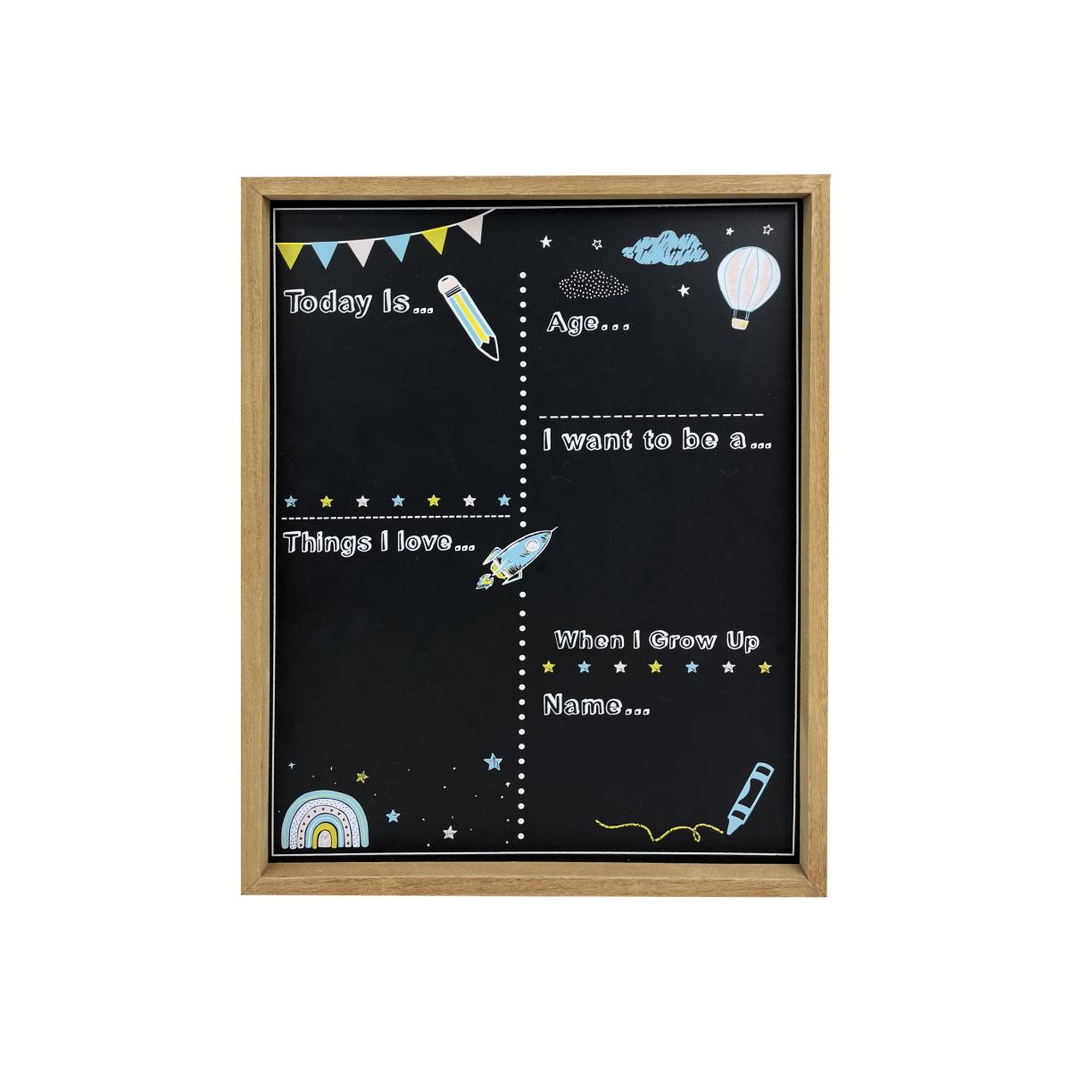 I love this kids' aspirations chalkboard because it adds a personalised and interactive touch to any child's space. It’s versatile and works well in playrooms or bedrooms, especially in interiors that aim for a cosy, functional feel. The framed design elevates it beyond a simple chalkboard, making it suitable for display on focal walls without looking out of place. For styling, consider pairing it with colourful or playful accessories, such as soft cushions, themed storage, or whimsical décor that complement the illustrations. It's practical too-encouraging kids to express their dreams and favourite things whilst adding a personalised artwork element that grows with them.