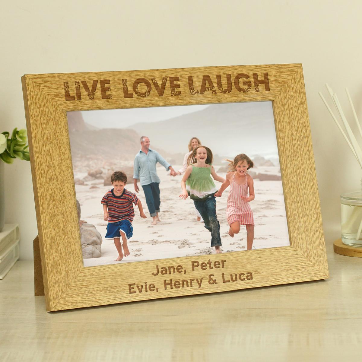 * See below how to personalise your frame* Personalise with 2 lines of 30 characters below the photo* 'LIVE LAUGH LOVE' is fixed text* Frame can hold a 7" x5" landscape photograph* Features an oak effect finish* Ideal for Birthdays, Christmas, Wedding Gifts, Fathers Day, Mothers Day, Retirement gifts The Personalised Live Love Laugh Wooden Landscape Photo Frame is a perfect gift for birthdays, Christmas, weddings, and other special occasions. Personalise it with your message to create a timeless piece that spreads positivity and love.**How to personalise your product:**1. Place your order2. You will receive an email from dunelm@personalisedmemento. co. uk within 1 hour to add your personalised message. If not received, please check your junk folder.3. Once received, follow the link within the email.4. Type your message into the fields on screen and click on the preview button to review the personalisation.5. Once checked and happy, click submit.6. Production of the order will commence.**Please note:*** The content on a personalised product will be produced exactly as you enter it, including spelling and capitalisation. Please ensure that all details, especially the personalised text, are correct before clicking submit.* Accents, special characters and emojis are not accepted.* Once the personalisation has been submitted, the order cannot be amended or cancelled. * If the personalisation is not submitted within 3 days, the order will be automatically cancelled. * We do not permit personalisation that infringes copyright laws, is indecent or offensive, or contains language deemed to be abusive, threatening, or defamatory. Full content rules can be viewed in the [terms and conditions](https://www. dunelm. com/info/help/personalised-goods-terms-and-conditions). Orders that do not follow these rules will be refused. By ordering a personalised product, you are agreeing that your details (name and contact details, including address) and the details that you provide of any other party, such as the recipient of the personalised product, can be shared with our third party supplier who provides the personalisation service only for the purposes of completing the personalisation service and delivering the product to you or the recipient. Our Privacy Policy is here: [Privacy Policy | Dunelm](https://www. dunelm. com/info/help/privacy).