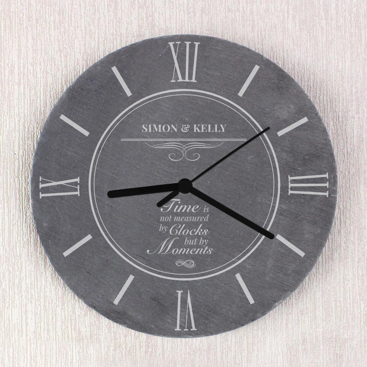 * Please see below on how to personalise your clock* Ideal for new homes or weddings* Personalize with a name inside the banner (up to 18 characters) and a message over 3 lines:* Line 1: Up to 21 characters (case sensitive)* Line 2-3: Up to 21 characters per line (case sensitive)* " KITCHEN" is fixed text* Each slate piece is unique with natural variations* Contains speckles of fools gold for a rustic feel* Requires 1 x AA battery (not included)* Roman Numeral Display The Personalised Moments Slate Clock is a rustic and heartfelt gift, perfect for new homeowners, newlyweds, or those celebrating a special anniversary. It's a reminder that time is measured in precious moments.**How to personalise your product:**1. Place your order2. You will receive an email from dunelm@personalisedmemento. co. uk within 1 hour to add your personalised message. If not received, please check your junk folder.3. Once received, follow the link within the email.4. Type your message into the fields on screen and click on the preview button to review the personalisation.5. Once checked and happy, click submit.6. Production of the order will commence.**Please note:*** The content on a personalised product will be produced exactly as you enter it, including spelling and capitalisation. Please ensure that all details, especially the personalised text, are correct before clicking submit.* Accents, special characters and emojis are not accepted.* Once the personalisation has been submitted, the order cannot be amended or cancelled. * If the personalisation is not submitted within 3 days, the order will be automatically cancelled. * We do not permit personalisation that infringes copyright laws, is indecent or offensive, or contains language deemed to be abusive, threatening, or defamatory. Full content rules can be viewed in the [terms and conditions](https://www. dunelm. com/info/help/personalised-goods-terms-and-conditions). Orders that do not follow these rules will be refused. By ordering a personalised product, you are agreeing that your details (name and contact details, including address) and the details that you provide of any other party, such as the recipient of the personalised product, can be shared with our third party supplier who provides the personalisation service only for the purposes of completing the personalisation service and delivering the product to you or the recipient. Our Privacy Policy is here: [Privacy Policy | Dunelm](https://www. dunelm. com/info/help/privacy).