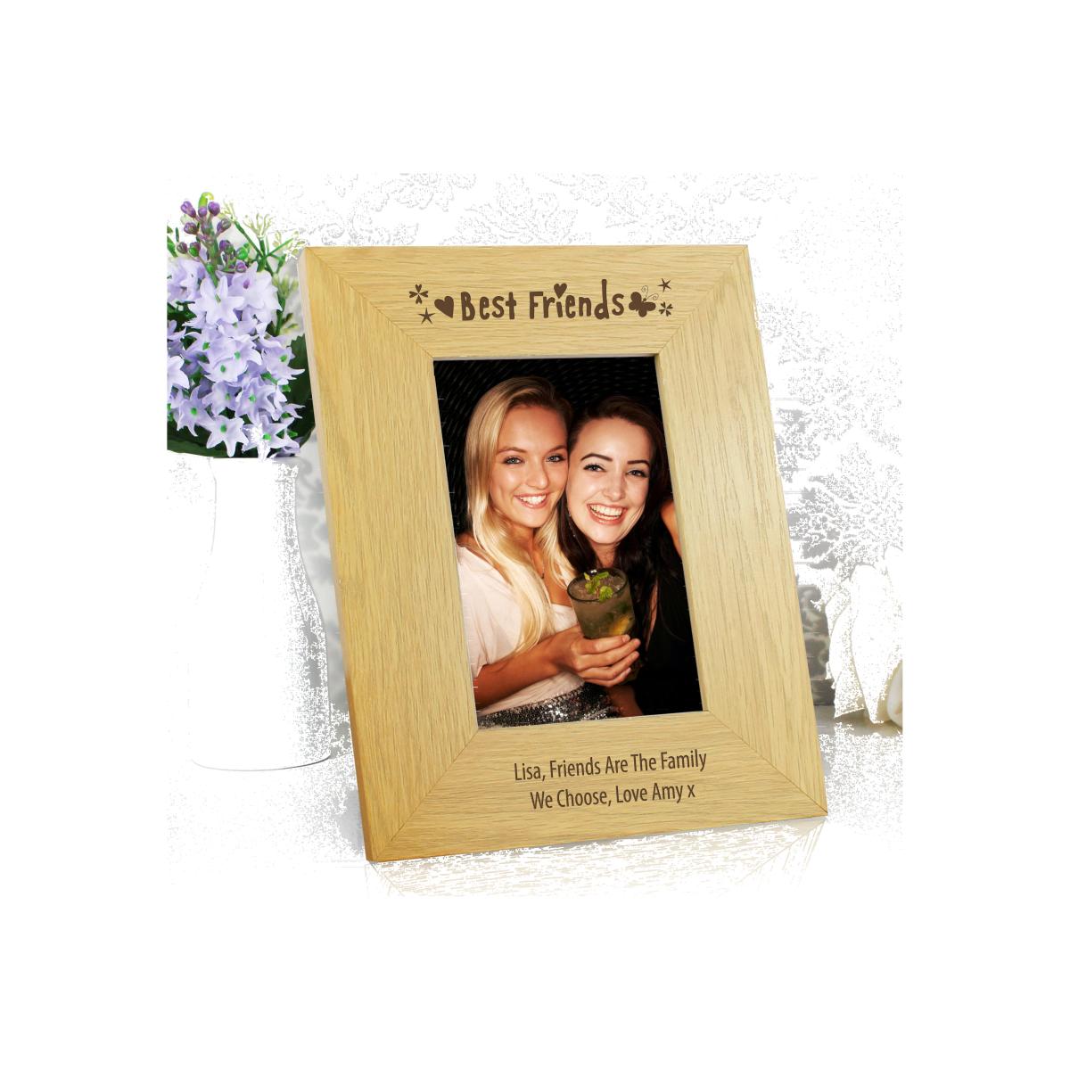 * See below how to personalise your frame* Personalise with any message over 2 lines (up to 30 characters per line)* Personalisation below the photograph* 'Best Friends' is fixed text* Holds a 6" x 4" print* Oak Effect Paper Veneer finish* Avoid using block capitals for personalised text The Personalised Oak Effect Best Friends Portrait Photo Frame is a thoughtful way to celebrate the bond of friendship. Personalise it with your message, creating a cherished keepsake for your best friend.**How to personalise your product:**1. Place your order2. You will receive an email from dunelm@personalisedmemento. co. uk within 1 hour to add your personalised message. If not received, please check your junk folder.3. Once received, follow the link within the email.4. Type your message into the fields on screen and click on the preview button to review the personalisation.5. Once checked and happy, click submit.6. Production of the order will commence.**Please note:*** The content on a personalised product will be produced exactly as you enter it, including spelling and capitalisation. Please ensure that all details, especially the personalised text, are correct before clicking submit.* Accents, special characters and emojis are not accepted.* Once the personalisation has been submitted, the order cannot be amended or cancelled. * If the personalisation is not submitted within 3 days, the order will be automatically cancelled. * We do not permit personalisation that infringes copyright laws, is indecent or offensive, or contains language deemed to be abusive, threatening, or defamatory. Full content rules can be viewed in the [terms and conditions](https://www. dunelm. com/info/help/personalised-goods-terms-and-conditions). Orders that do not follow these rules will be refused. By ordering a personalised product, you are agreeing that your details (name and contact details, including address) and the details that you provide of any other party, such as the recipient of the personalised product, can be shared with our third party supplier who provides the personalisation service only for the purposes of completing the personalisation service and delivering the product to you or the recipient. Our Privacy Policy is here: [Privacy Policy | Dunelm](https://www. dunelm. com/info/help/privacy).