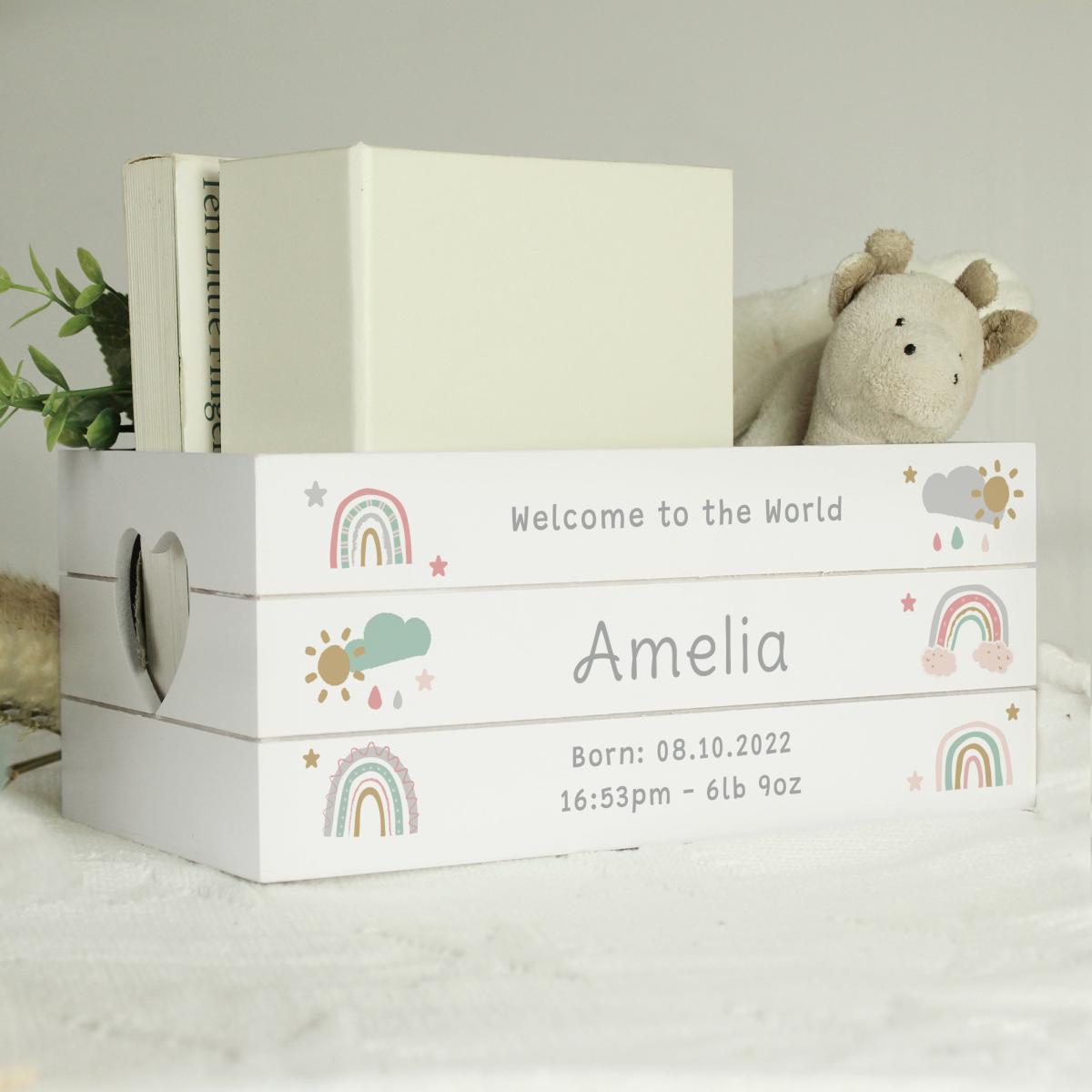 This cute rainbow crate can be personalised with a name and a message. The message line allows for up to 25 characters, while the name can be up to 15 characters, and two more message lines, each accommodating 25 characters. The personalisation is case-sensitive to ensure clarity and readability. Made from reclaimed wood, this crate may have minor imperfections that add to its character. Heart-shaped handles provide a delightful accent, making it an excellent storage solution for keeping belongings organised and adding a touch of charm to the room. How to personalise your product: Please note: By ordering a personalised product, you are agreeing that your details (name and contact details, including address) and the details that you provide of any other party, such as the recipient of the personalised product, can be shared with our third party supplier who provides the personalisation service only for the purposes of completing the personalisation service and delivering the product to you or the recipient. Our Privacy Policy is here: Privacy Policy | Dunelm.
