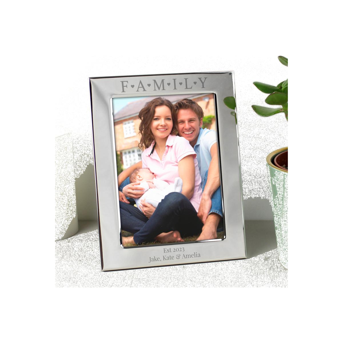 * See below how to personalise your frame* Personalise with any message over 2 lines at the bottom (up to 30 characters each)* 'F. A. M. I. L. Y' is fixed text* Holds a 7" x 5" photograph* Not suitable for wall hanging* Material: Aluminium* Avoid using block capitals for personalised text* Ideal for House Warmings, Engagements, Weddings, and Anniversaries The Personalised Silver Family and Hearts Portrait Photo Frame is a heartfelt gift for special occasions like house warmings, engagements, weddings, and anniversaries. Personalise it with your message to create a cherished keepsake celebrating the essence of family.**How to personalise your product:**1. Place your order2. You will receive an email from dunelm@personalisedmemento. co. uk within 1 hour to add your personalised message. If not received, please check your junk folder.3. Once received, follow the link within the email.4. Type your message into the fields on screen and click on the preview button to review the personalisation.5. Once checked and happy, click submit.6. Production of the order will commence.**Please note:*** The content on a personalised product will be produced exactly as you enter it, including spelling and capitalisation. Please ensure that all details, especially the personalised text, are correct before clicking submit.* Accents, special characters and emojis are not accepted.* Once the personalisation has been submitted, the order cannot be amended or cancelled. * If the personalisation is not submitted within 3 days, the order will be automatically cancelled. * We do not permit personalisation that infringes copyright laws, is indecent or offensive, or contains language deemed to be abusive, threatening, or defamatory. Full content rules can be viewed in the [terms and conditions](https://www. dunelm. com/info/help/personalised-goods-terms-and-conditions). Orders that do not follow these rules will be refused. By ordering a personalised product, you are agreeing that your details (name and contact details, including address) and the details that you provide of any other party, such as the recipient of the personalised product, can be shared with our third party supplier who provides the personalisation service only for the purposes of completing the personalisation service and delivering the product to you or the recipient. Our Privacy Policy is here: [Privacy Policy | Dunelm](https://www. dunelm. com/info/help/privacy).