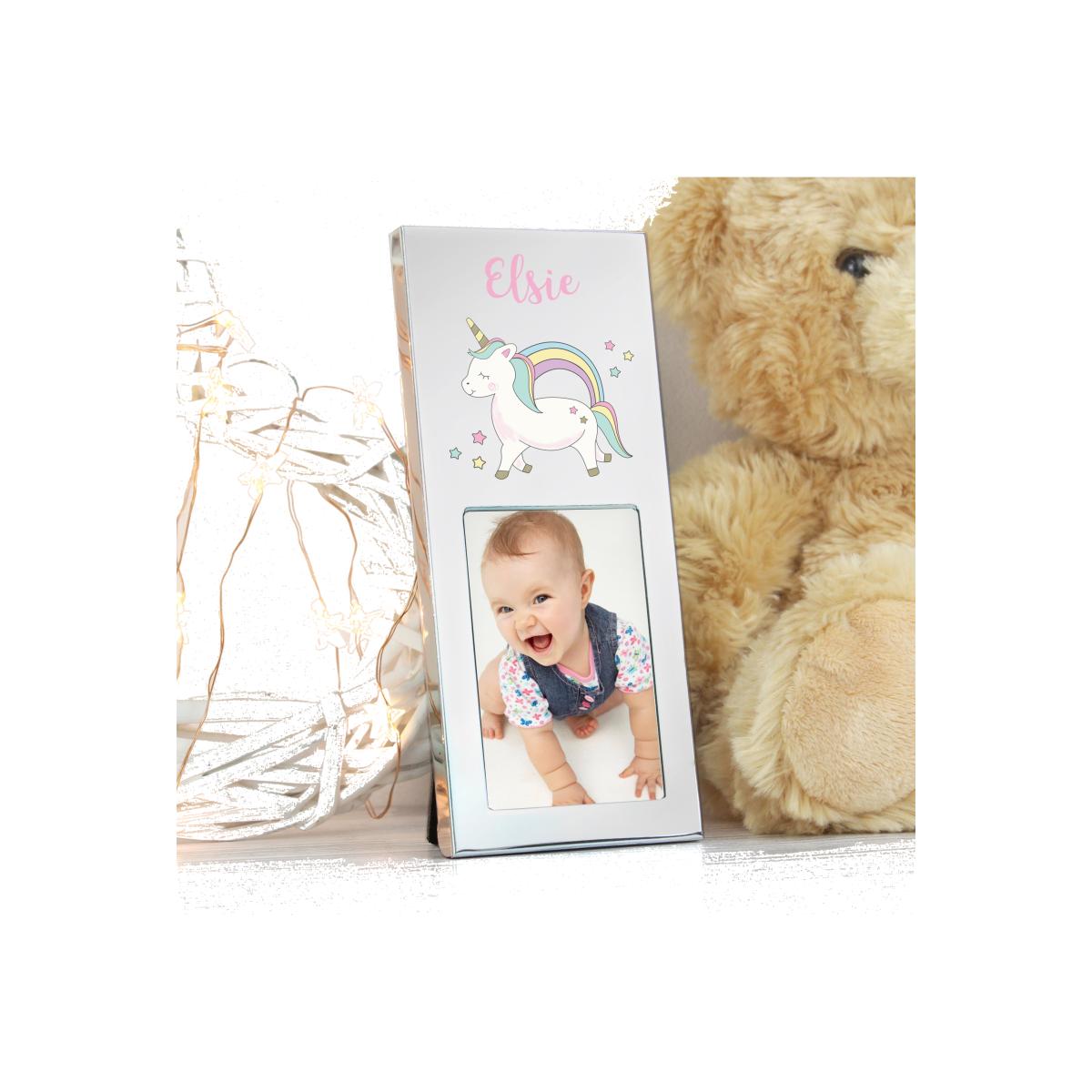* See below how to personalise your frame* Cute way to cherish special memories (3" x 2" size)* Personalise with a name (up to 12 characters)* All text as entered (avoid block capitals)* Holds a 3" x 2" photo* Silver finish, material: Aluminium* Perfect for New baby, Christening, Baptism, Naming Days, and Birthdays The Personalised Small Baby Unicorn Portrait Photo Frame is the perfect choice to celebrate the little ones. Personalise it with a name and capture those precious moments in style, whether it's for a new baby, christening, or birthday.**How to personalise your product:**1. Place your order2. You will receive an email from dunelm@personalisedmemento. co. uk within 1 hour to add your personalised message. If not received, please check your junk folder.3. Once received, follow the link within the email.4. Type your message into the fields on screen and click on the preview button to review the personalisation.5. Once checked and happy, click submit.6. Production of the order will commence.**Please note:*** The content on a personalised product will be produced exactly as you enter it, including spelling and capitalisation. Please ensure that all details, especially the personalised text, are correct before clicking submit.* Accents, special characters and emojis are not accepted.* Once the personalisation has been submitted, the order cannot be amended or cancelled. * If the personalisation is not submitted within 3 days, the order will be automatically cancelled. * We do not permit personalisation that infringes copyright laws, is indecent or offensive, or contains language deemed to be abusive, threatening, or defamatory. Full content rules can be viewed in the [terms and conditions](https://www. dunelm. com/info/help/personalised-goods-terms-and-conditions). Orders that do not follow these rules will be refused. By ordering a personalised product, you are agreeing that your details (name and contact details, including address) and the details that you provide of any other party, such as the recipient of the personalised product, can be shared with our third party supplier who provides the personalisation service only for the purposes of completing the personalisation service and delivering the product to you or the recipient. Our Privacy Policy is here: [Privacy Policy | Dunelm](https://www. dunelm. com/info/help/privacy).