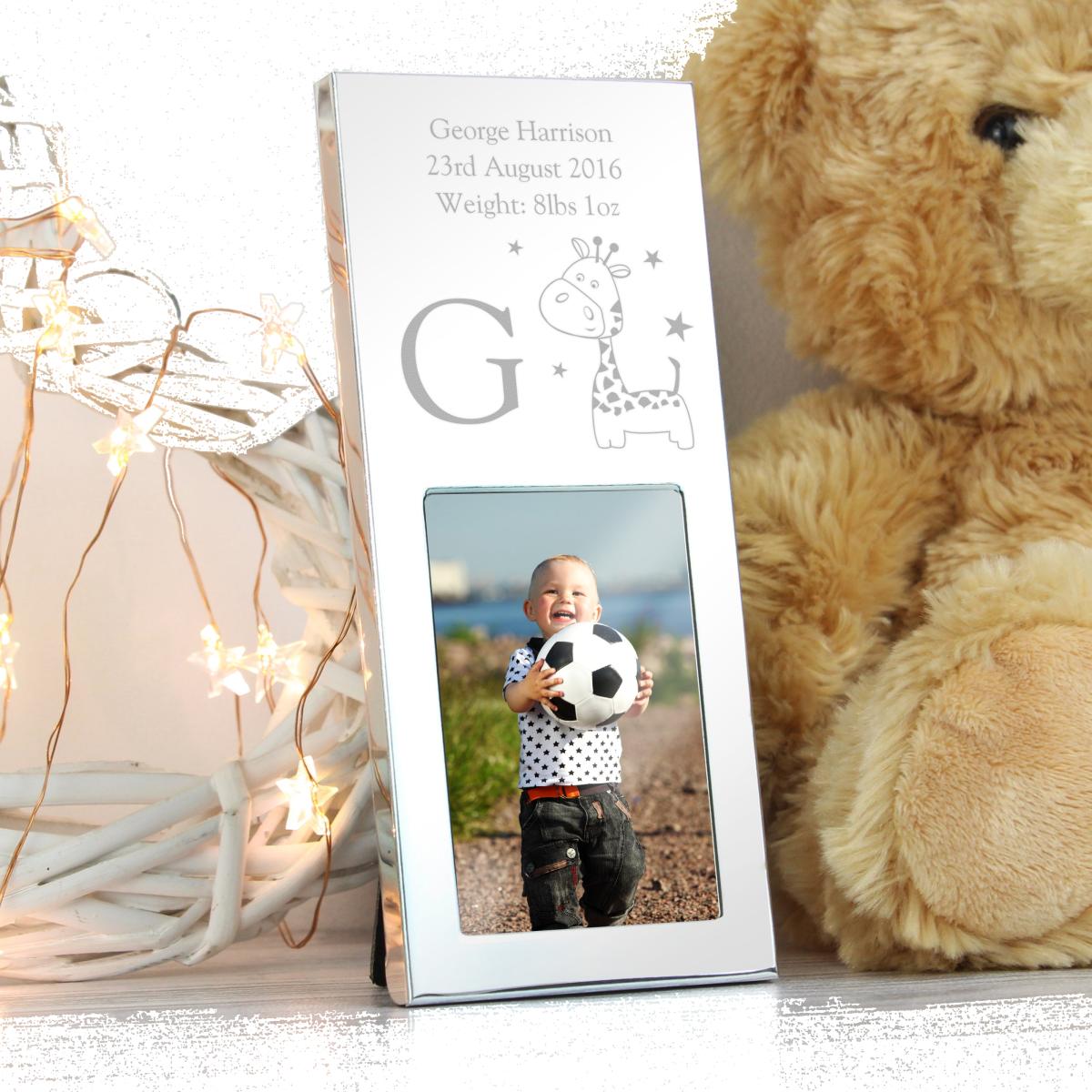 * See below how to personalise your frame* Display a treasured photograph of their little one* Personalise with 3 lines of text (25 characters each) and one letter/initial* All personalisation is case sensitive and as entered* Holds a print sized 3" x 2"* Silver finish, material: Aluminium* Includes stand only, not wall-mountable The Personalised Small Hessian Giraffe Silver Portrait Photo Frame is a perfect way to display a treasured photograph. Personalise it with up to three lines of text and a letter/initial for a unique and meaningful gift.**How to personalise your product:**1. Place your order2. You will receive an email from dunelm@personalisedmemento. co. uk within 1 hour to add your personalised message. If not received, please check your junk folder.3. Once received, follow the link within the email.4. Type your message into the fields on screen and click on the preview button to review the personalisation.5. Once checked and happy, click submit.6. Production of the order will commence.**Please note:*** The content on a personalised product will be produced exactly as you enter it, including spelling and capitalisation. Please ensure that all details, especially the personalised text, are correct before clicking submit.* Accents, special characters and emojis are not accepted.* Once the personalisation has been submitted, the order cannot be amended or cancelled. * If the personalisation is not submitted within 3 days, the order will be automatically cancelled. * We do not permit personalisation that infringes copyright laws, is indecent or offensive, or contains language deemed to be abusive, threatening, or defamatory. Full content rules can be viewed in the [terms and conditions](https://www. dunelm. com/info/help/personalised-goods-terms-and-conditions). Orders that do not follow these rules will be refused. By ordering a personalised product, you are agreeing that your details (name and contact details, including address) and the details that you provide of any other party, such as the recipient of the personalised product, can be shared with our third party supplier who provides the personalisation service only for the purposes of completing the personalisation service and delivering the product to you or the recipient. Our Privacy Policy is here: [Privacy Policy | Dunelm](https://www. dunelm. com/info/help/privacy).