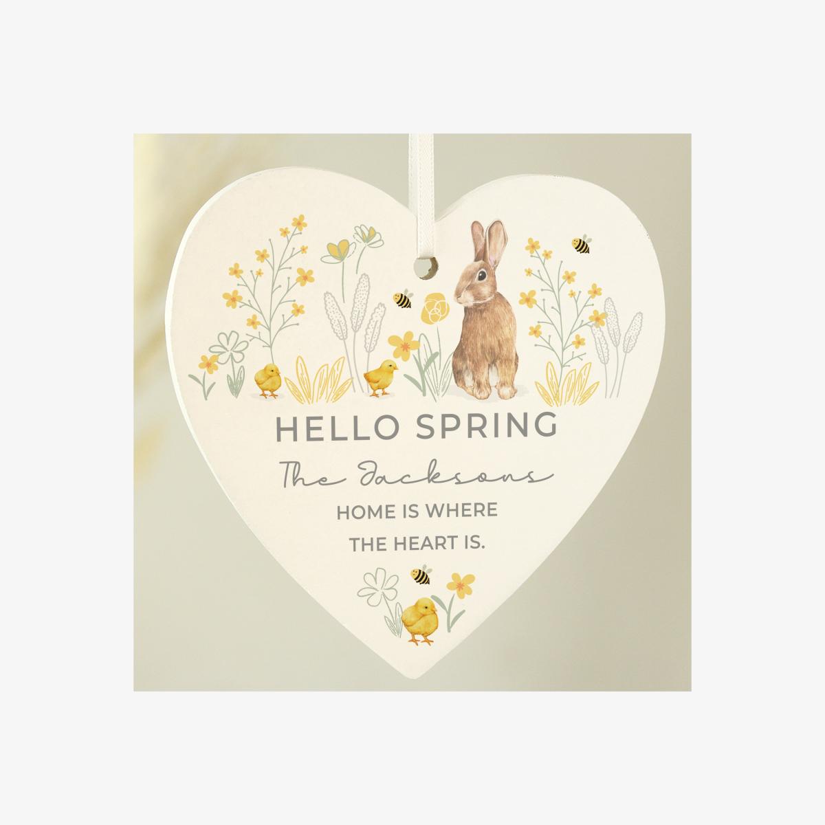 * Personalisation * Lovely gift idea * Sweet bunny iconography Add a touch of charm to your spring celebrations with our Personalised Spring Bunny Wooden Heart Ornament. Crafted from wood, this heart-shaped decoration features an adorable spring bunny design that will brighten any space. Perfect for Easter, springtime, or as a thoughtful gift, each ornament can be personalised with up to 4 lines of text. Personalise with a name (up to 20 characters) and three additional lines (15-20 characters each), with the first line case-sensitive and the rest in fixed UPPERCASE. This sweet decoration comes with a ribbon for easy hanging, making it ideal for any occasion. A lovely way to bring warmth and personality to your home or give as a heartfelt gift. **How to personalise your product:** 1. Place your order 2. You will receive an email from dunelm@personalisedmemento.co.uk within 1 hour to add your personalised message. If not received, please check your junk folder. 3. Once received, follow the link within the email. 4. Type your message into the fields on screen and click on the preview button to review the personalisation. 5. Once checked and happy, click submit. 6. Production of the order will commence. **Please note:** * The content on a personalised product will be produced exactly as you enter it, including spelling and capitalisation. Please ensure that all details, especially the personalised text, are correct before clicking submit. * Accents, special characters and emojis are not accepted. * Once the personalisation has been submitted, the order cannot be amended or cancelled. If the personalisation is not submitted within 3 days, the order will be automatically cancelled. * We do not permit personalisation that infringes copyright laws, is indecent or offensive, or contains language deemed to be abusive, threatening, or defamatory. Full content rules can be viewed in the [terms and conditions](https://www.dunelm.com/info/help/personalised-goods-terms-and-conditions). Orders that do not follow these rules will be refused. By ordering a personalised product, you are agreeing that your details (name and contact details, including address) and the details that you provide of any other party, such as the recipient of the personalised product, can be shared with our third party supplier who provides the personalisation service only for the purposes of completing the personalisation service and delivering the product to you or the recipient. Our Privacy Policy is here: [Privacy Policy | Dunelm](https://www.dunelm.com/info/help/privacy).