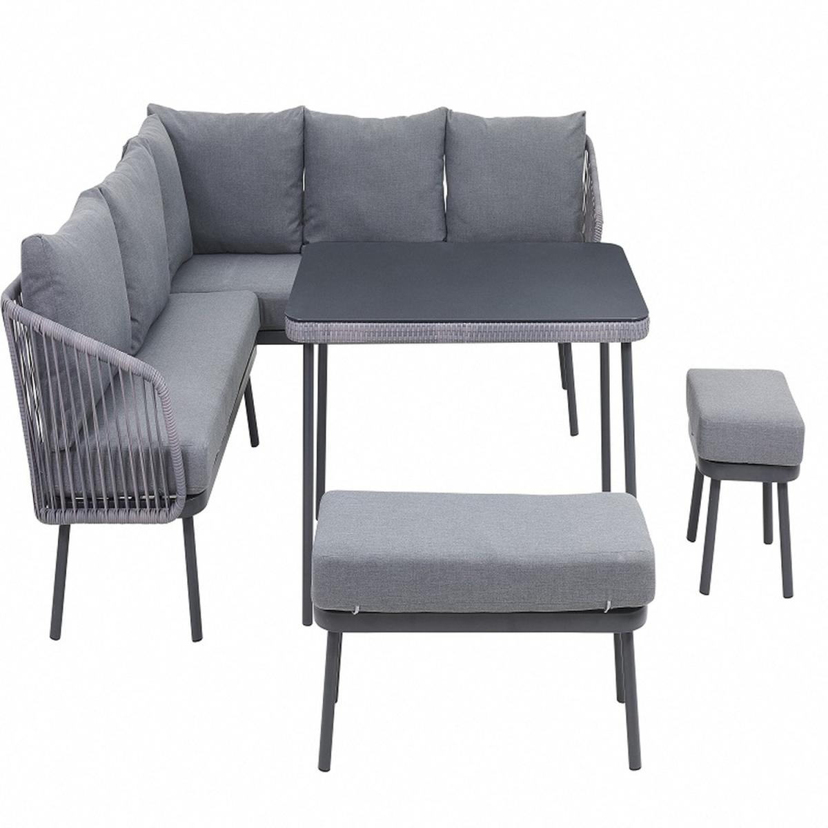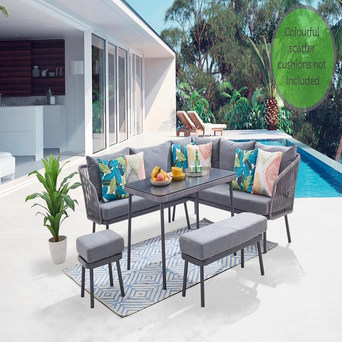 Introducing Perth a beautiful five-piece wicker, L-shaped corner seating arrangement made possible by the set's inclusion of a 3 seater and a 2 seater garden sofa. A 2-seater bench, a footstool, and a rectangular dining table with a clear glass top are also included with this garden set. This rattan garden set can accommodate up to 8 people. This set does not come with a cover - we recommend you purchase a waterproof cover to preserve your garden set when not in use. This garden set is durable and for outdoor use all year round in mild to warm weather. Although the cushions are weather-proof, we do not advise leaving them out in adverse weather conditions for long periods of time. We recommend the whole set be moved indoors over the winter. While the cushions have zips, we advise against removing the covers because they are challenging to put back on. If necessary, apply upholstery shampoo and store cushions indoors while not in use.
