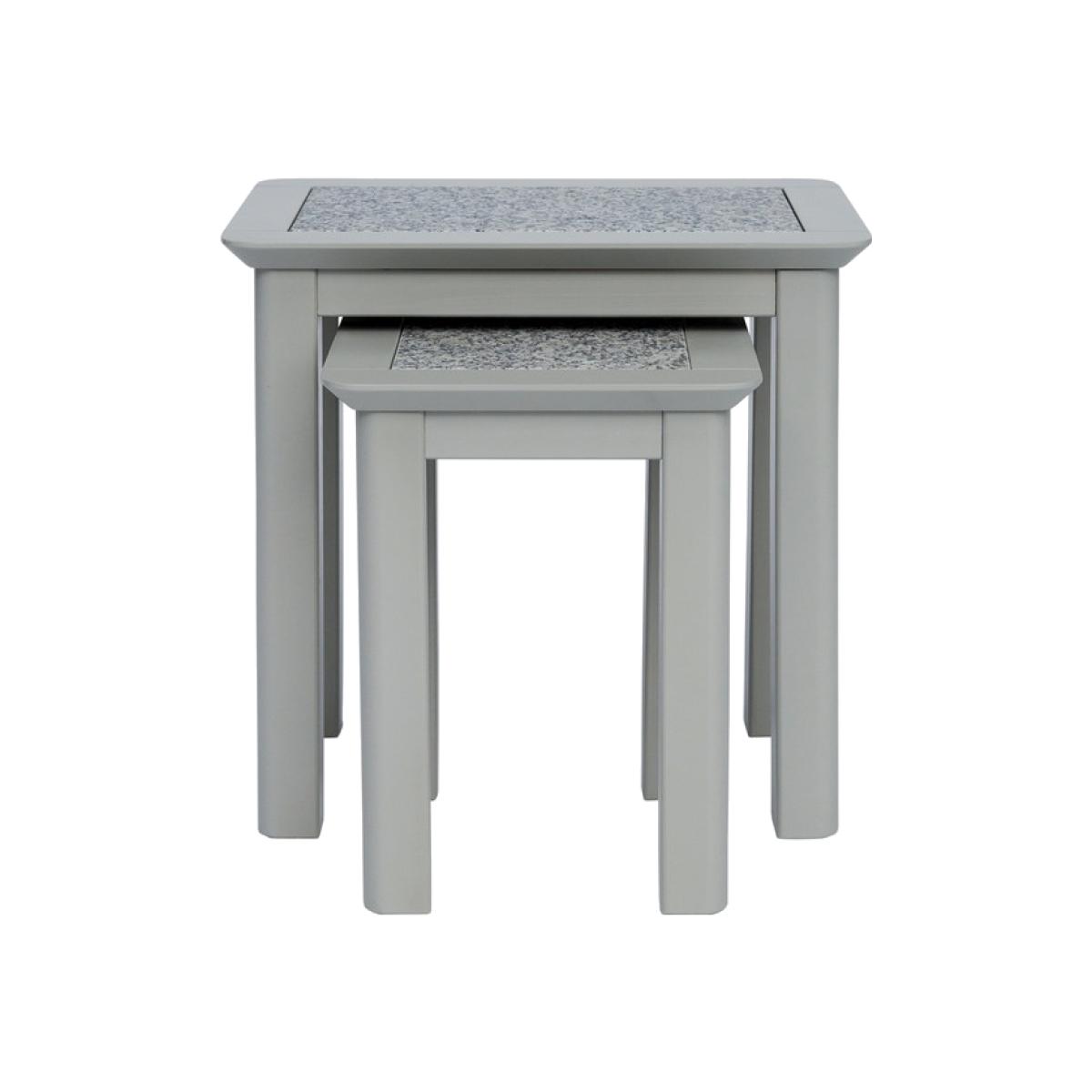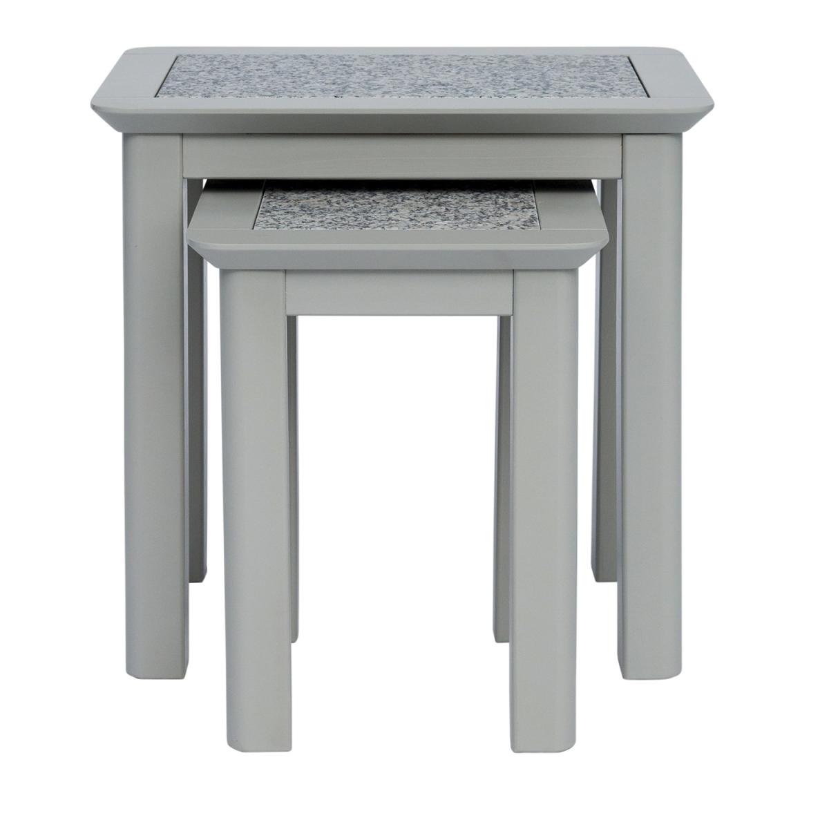 Our compact nest of two tables is finished in soft grey with real stone inset tops which are hardwearing and very easy to clean.