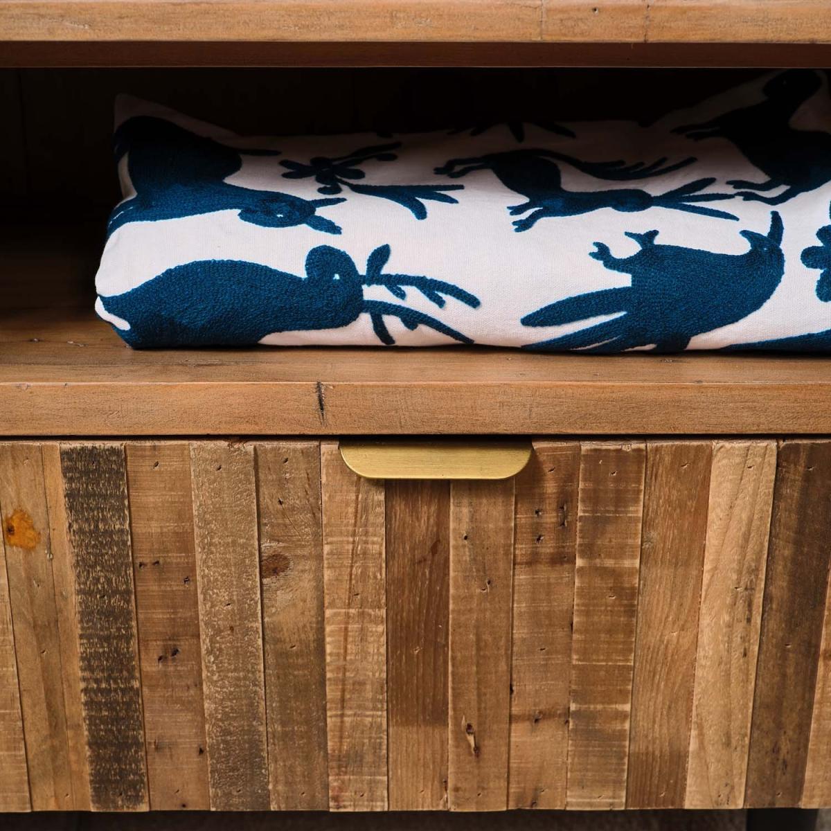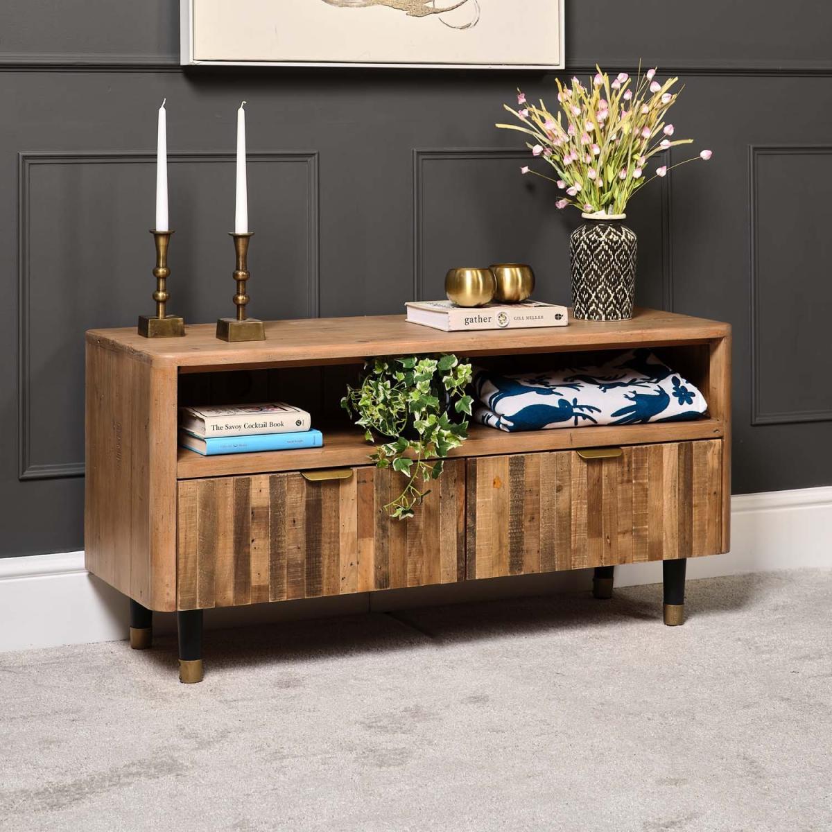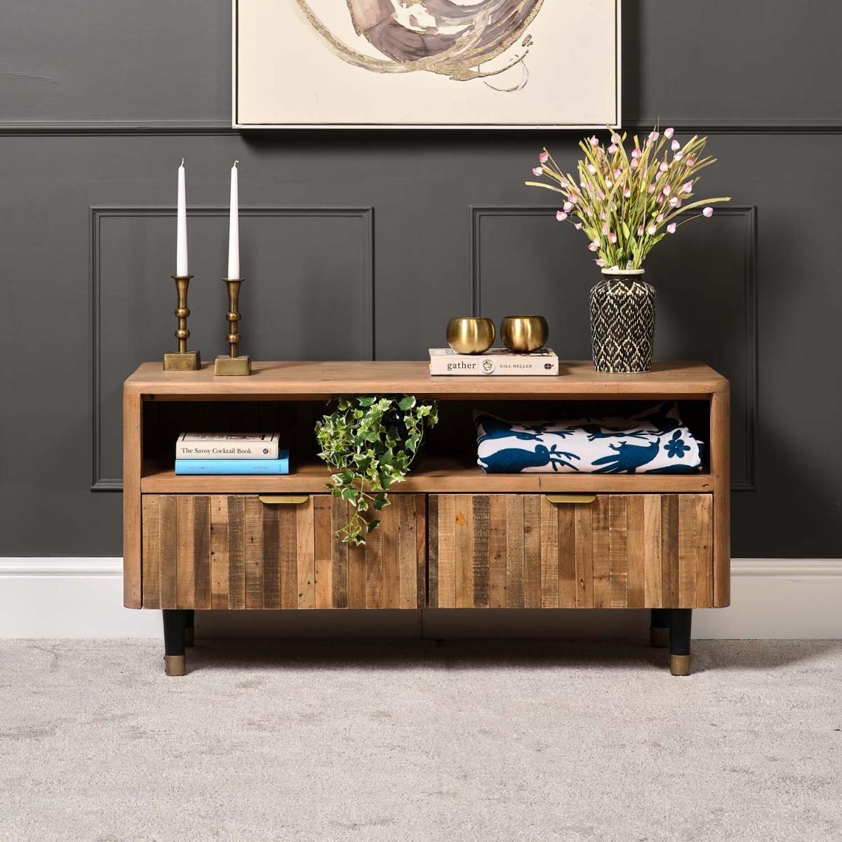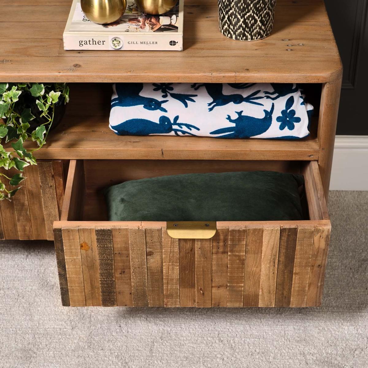 Watch your favourite film or show on a TV unit you'll love to look at! Made with reclaimed timber, featuring brass effect handles and black legs. Finish your living room off with the Perth coffee table and lamp table, also made from reclaimed timber, the matching vertical pattern of the wood create a subtle matching pattern for these pieces.
