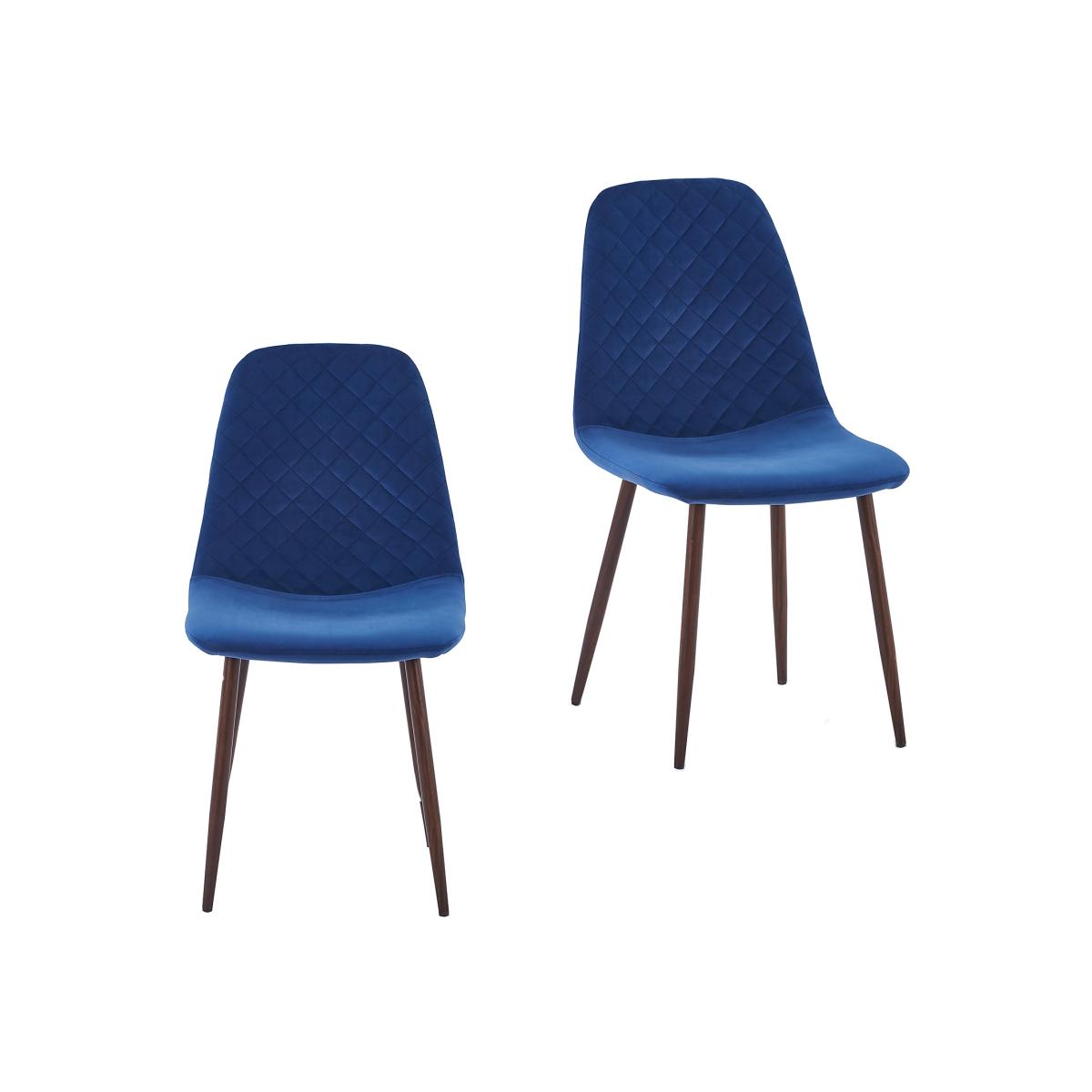 Pair of upholstered dining chairs in Navy velvet fabric and sturdy metal frame with walnut effect finish to add a splash of style and colour to your dining room.