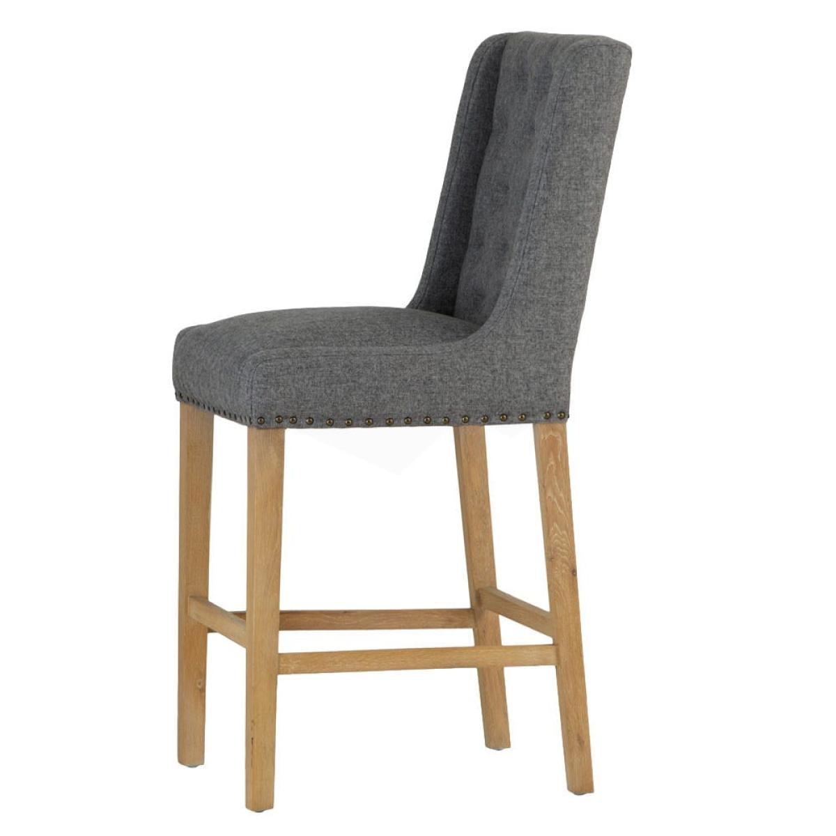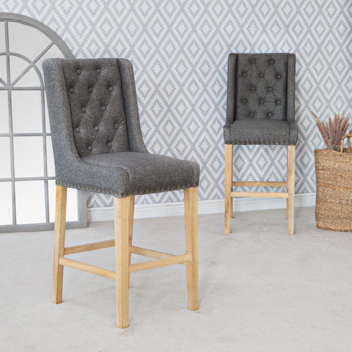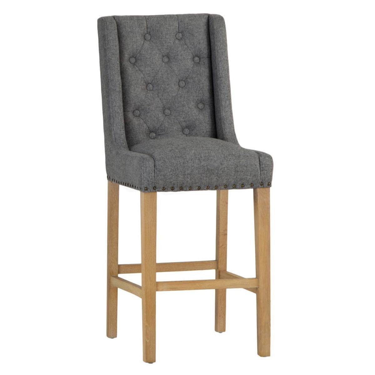 Our lofty Perugia dark grey button-back bar stool with studs is ideal for breakfast bars and bar-height dining tables. The seat back features Chesterfield-style buttons in a classic diamond pattern, and its base is adorned with metal studs for a traditional artisan finish. Shallow sides lend both style and discreet support, and the seat is generously cushioned to keep you comfy while you perch. The sturdy pale oak legs provide a striking contrast to the dark hue, and the chunky spindles make a handy footrest. Choose this statement stool as a sophisticated addition to your kitchen or dining area.