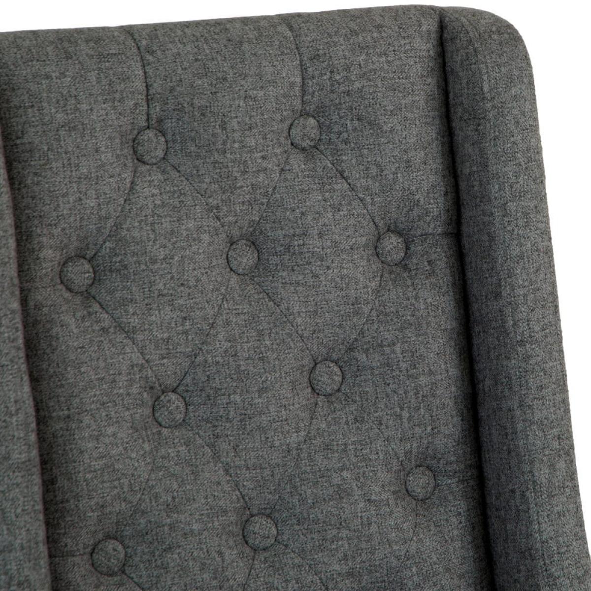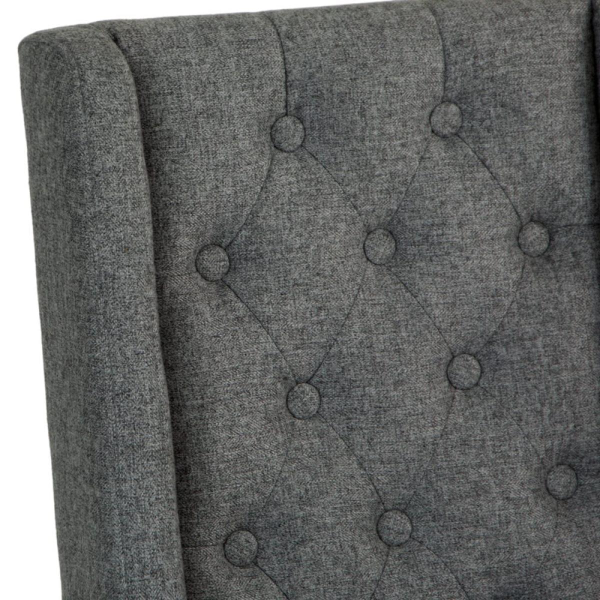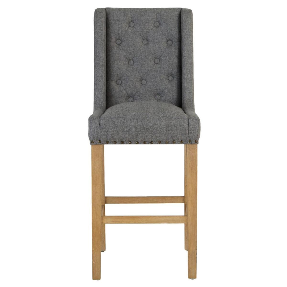 Our lofty Perugia dark grey button-back bar stool with studs is ideal for breakfast bars and bar-height dining tables. The seat back features Chesterfield-style buttons in a classic diamond pattern, and its base is adorned with metal studs for a traditional artisan finish. Shallow sides lend both style and discreet support, and the seat is generously cushioned to keep you comfy while you perch. The sturdy pale oak legs provide a striking contrast to the dark hue, and the chunky spindles make a handy footrest. Choose this statement stool as a sophisticated addition to your kitchen or dining area.