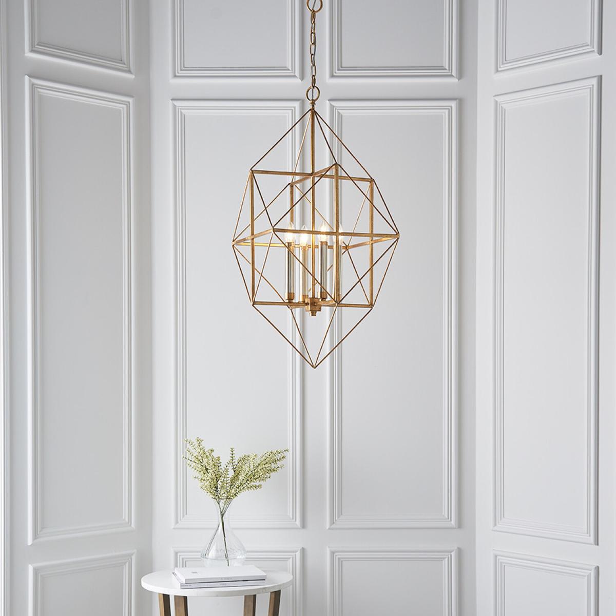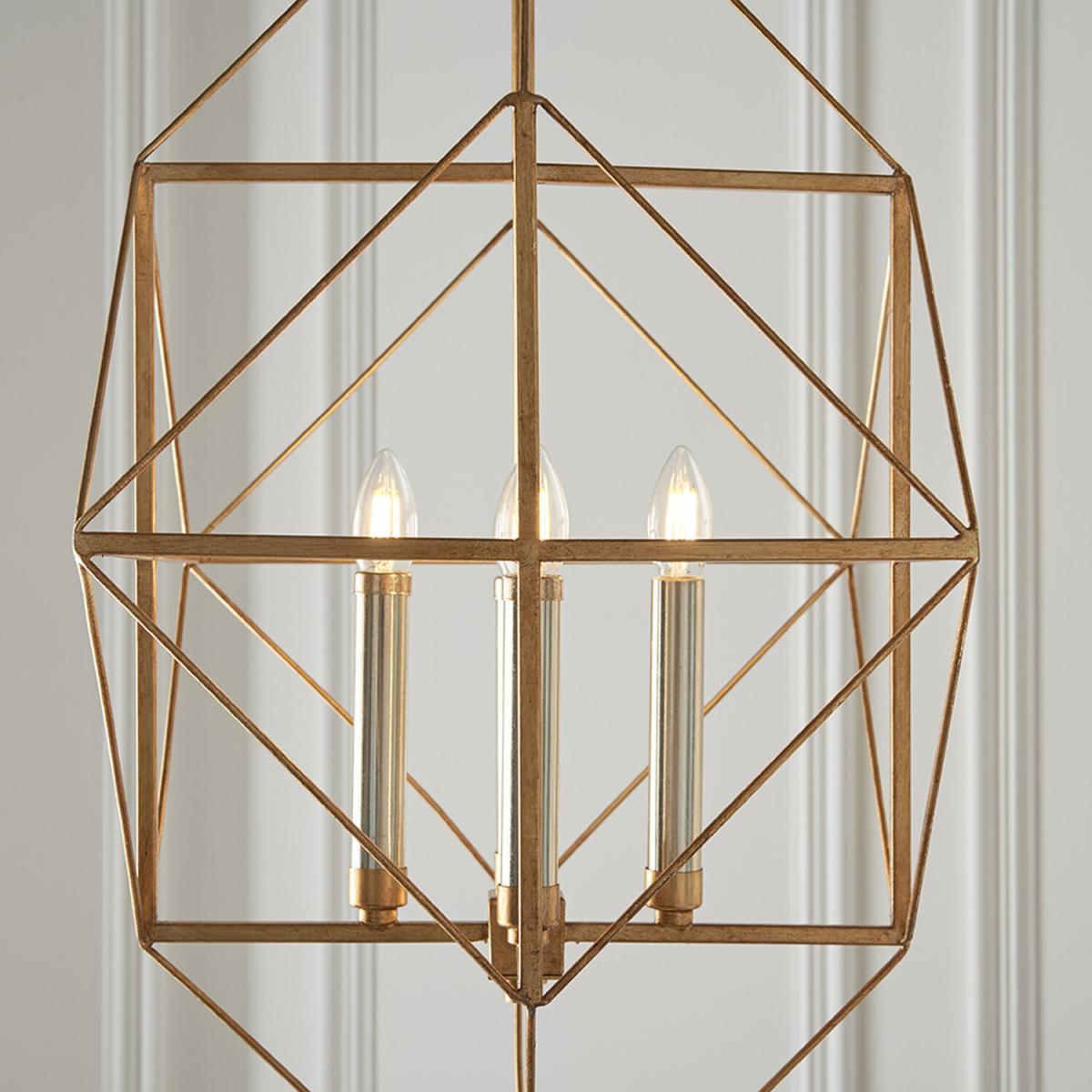 I love the mixer of antique gold and silver leaf on this pendant - it adds a subtle luxe feel that works well in both traditional and contemporary interiors. It’s a versatile piece that suits high-ceilinged hallways, dining rooms, or even a sophisticated living space, where its geometric form makes a statement without overpowering. For styling tips, try pairing it with warm-toned decor or muted colour schemes to highlight the metallic accents. It also looks great hanging above a dining table or in a cluster with other pendants for a layered lighting effect. Practical tip: ensure the chain length is adjusted to the room’s proportions for a balanced look and optimal illumination.