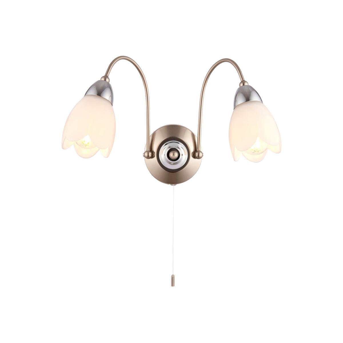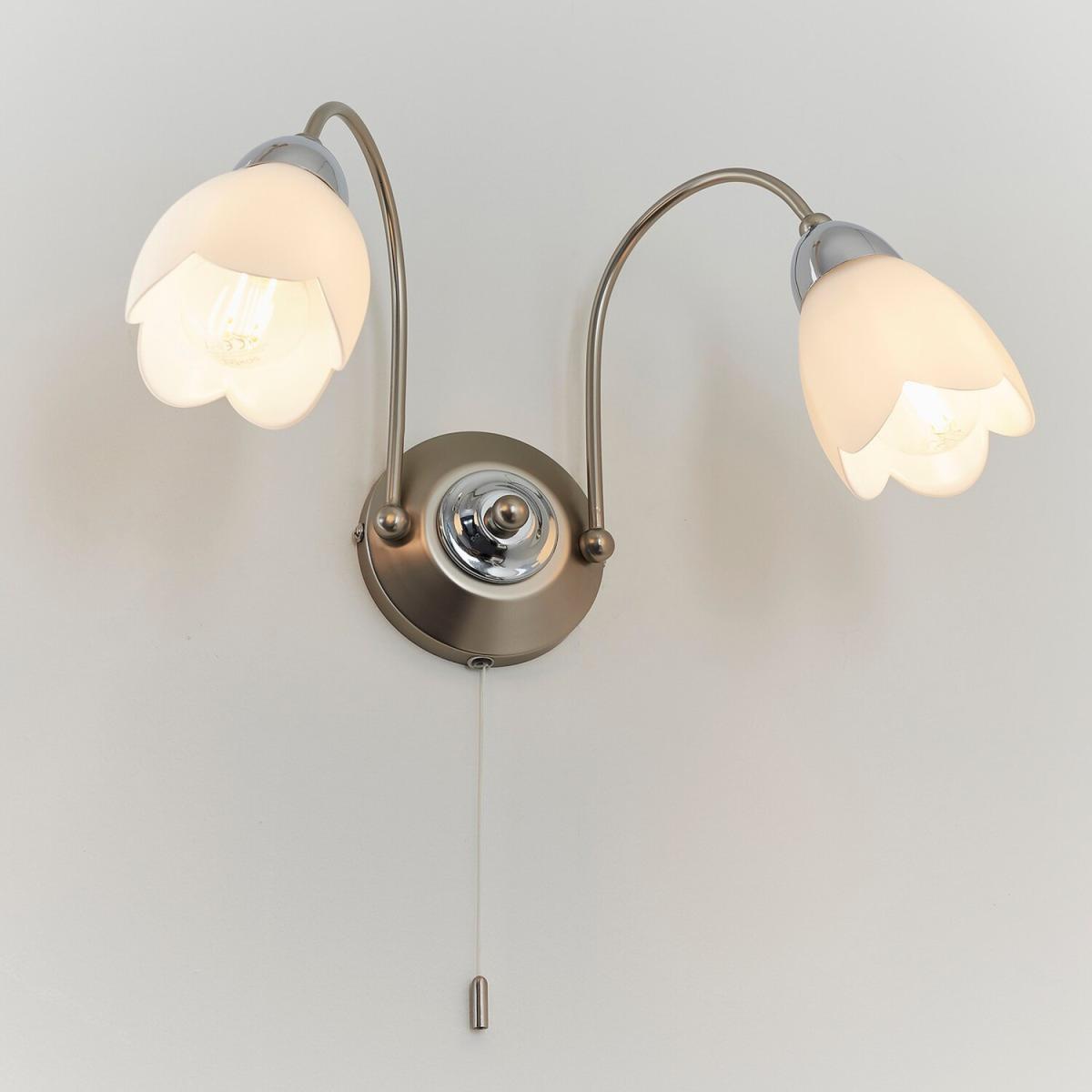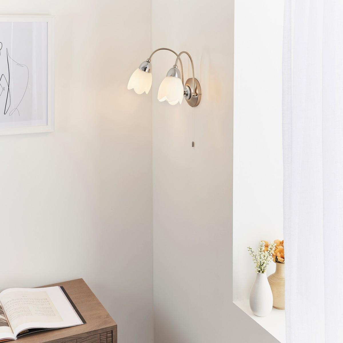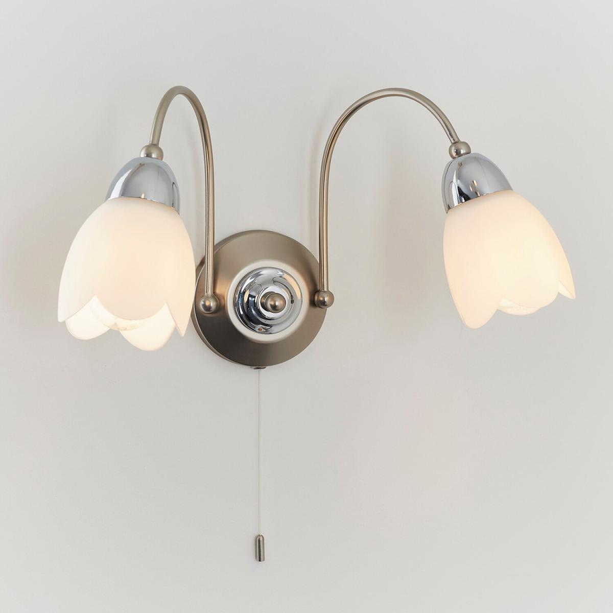 The twin wall light is one item within a wider range with a chrome and satin chrome effect and matt opal glass finish. This fitting has a pull cord switch, is dimmable and suitable for use with LED lamps. Antique brass finish also available