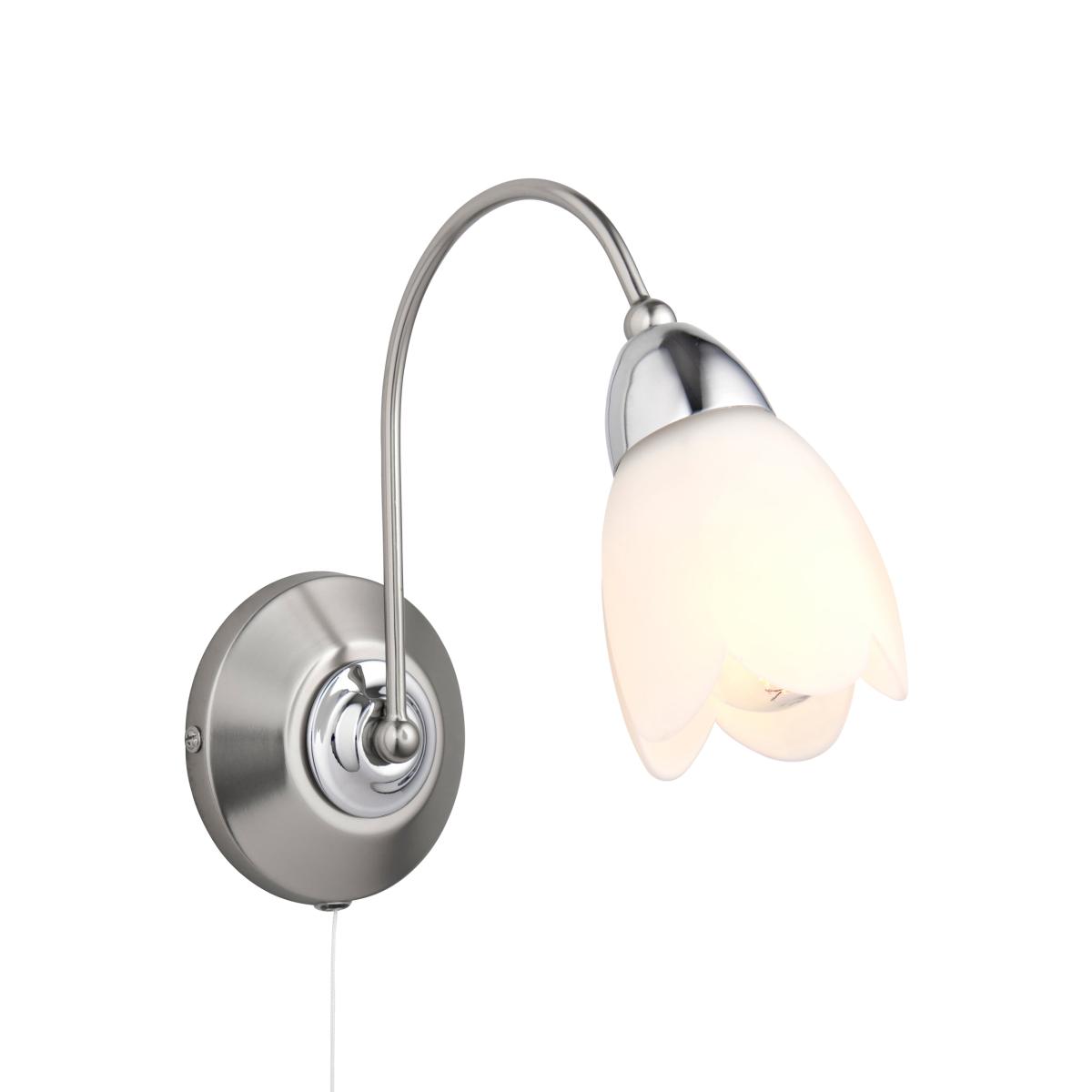 This single wall light is one item within a wider range with a chrome and satin chrome effect and matt opal glass finish. This fitting has a pull cord switch, is dimmable and suitable for use with LED lamps. Antique brass finish also available.