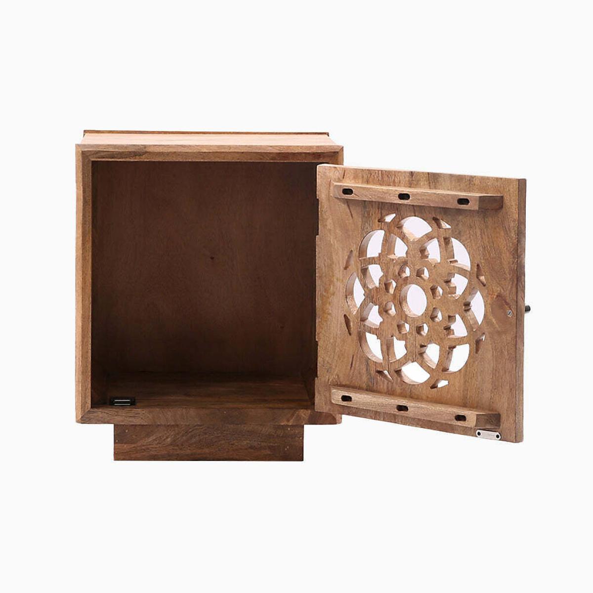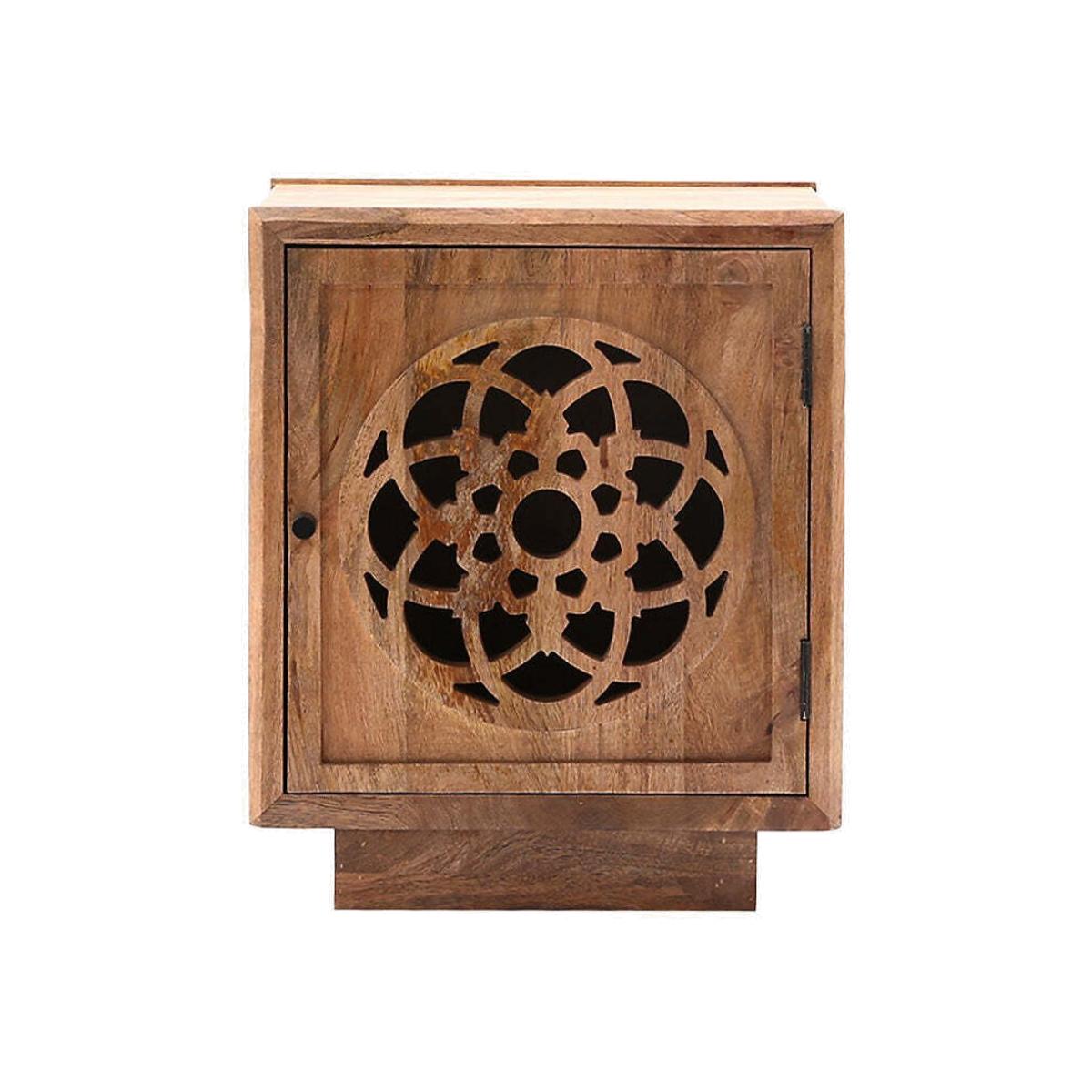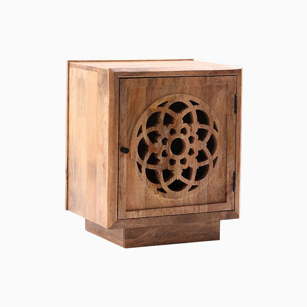 Merging exceptional functionality with elegant craftsmanship, the Petala of Life side table features a beautifully sculpted silhouette crafted from mango wood with a natural finish. Its front panel highlights an intricate wooden cut-out inspired by the sacred Petala of Life symbol, imbuing the piece with meaningful artistry. Versatile and refined, it serves perfectly as a bedside companion or a distinctive accent in the living room or bathroom. Product details• Mango wood• Floral cut-out design• Delivered fully assembled. Product Composition - Mango Wood. Product Dimensions - 50 cm x40 cm x60 cm , Weight - 14.05 KG• Clearance to floor: 5 cm Package Dimensions - 68 cm x 58 cm x 48 cm, Weight 18.2 kg. This product will be dispatched by one of our trusted suppliers. You’ll be contacted by their selected courier about your delivery.