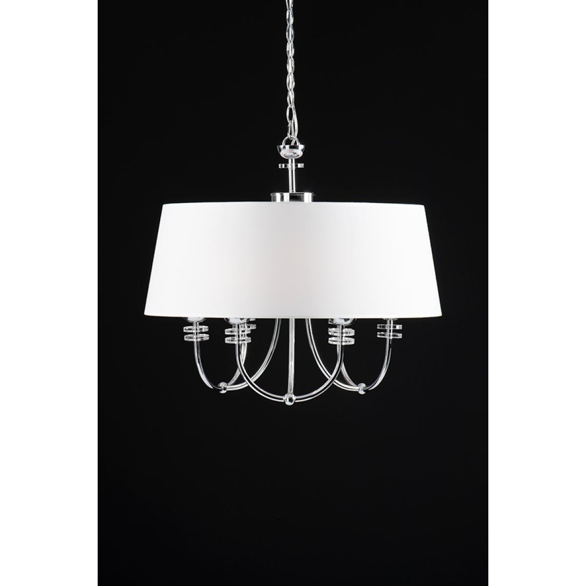 A perfectly proportioned, elegant pendant light – perfect for any contemporary interior. Featuring a chrome plated steel structure with white cotton shade. Clear acrylic disc details. Height adjustable prior to installation (simply remove surplus links from chain). Supplied complete with 6 x E12 25W Bulbs.