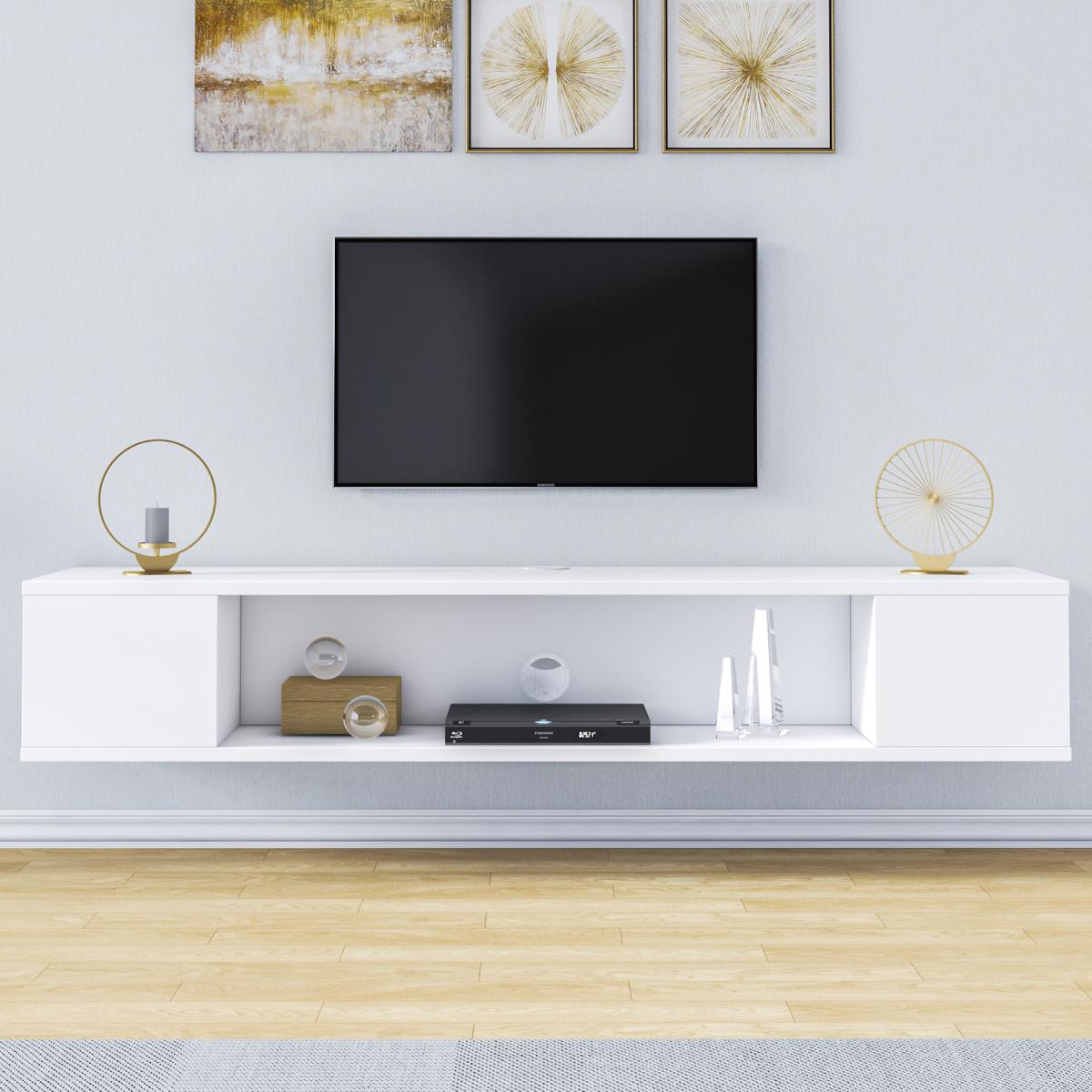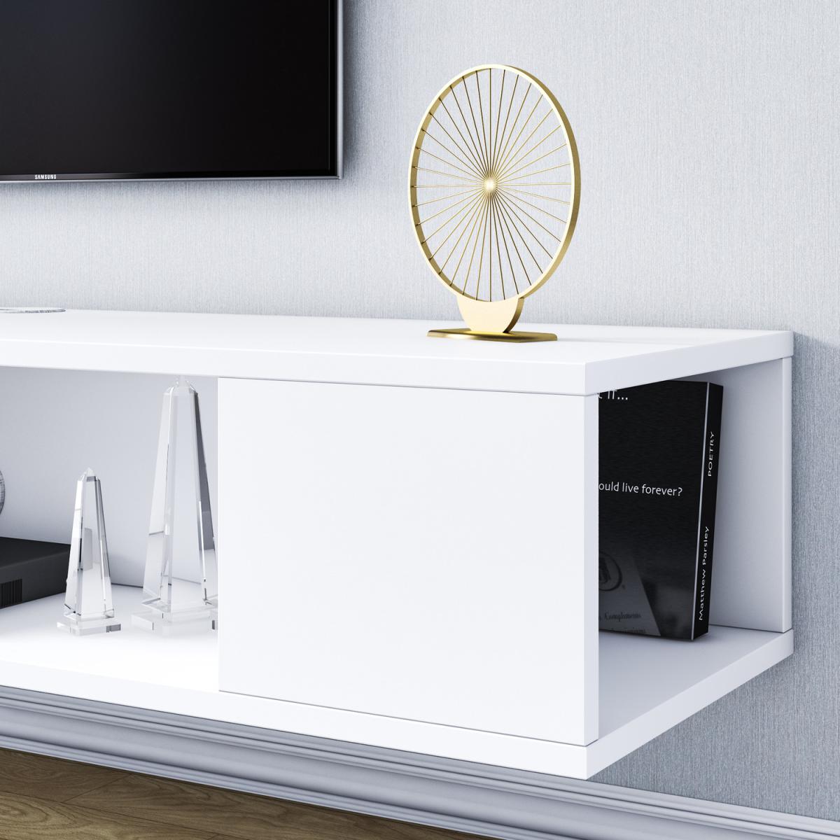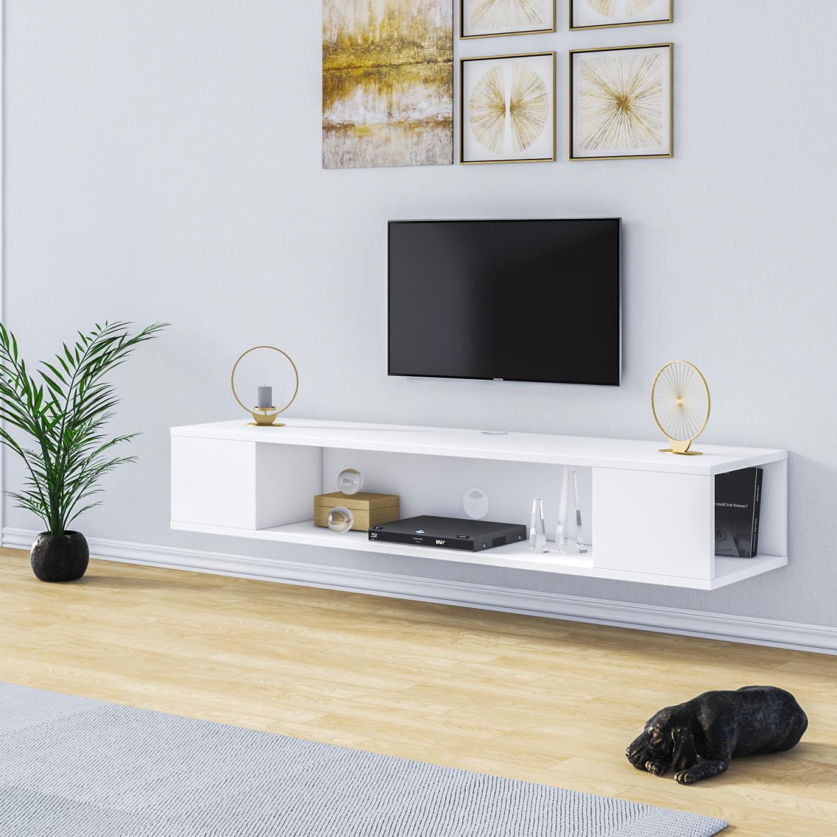 It is not designed to hold a TV, instead, this design requires that the TV must be wall-mounted as shown in the photo. The Petini 135 cm wide media stand features three cubbies and a wiring compartment in the back providing storage space for your books, electronic devices, and media equipment. A triple-holed adjustable cable management system with a small wire compartment in the back is specially designed to meet contemporary growing technological needs. The media stand will suit perfectly for any wall-mountable TVs up to 60''. It is made of an 18 mm thick melamine coated particle board and banded with PVC edge banding tape. The product will be delivered to the customer in the original package as disassembled. It is designed to be assembled and mounted to the wall by the customer easily using a power drill. Assembly instruction and installation hardware including metal wall mounting apparatus are included in the package. For fast and error-free installation, product parts are numbered with stickers in accordance with the assembly guide.