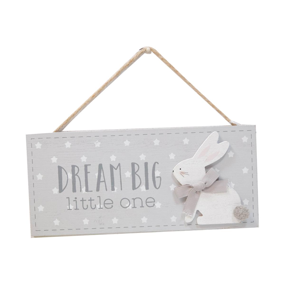 * Distressed design * 3D detailing * Rustic twine hanger This sweet wooden plaque is full of charm, with its distressed finish, star detailing, and a fluffy-tailed bunny bringing a soft and soothing feel. Featuring the phrase "Dream Big Little One", it makes a thoughtful decorative piece for a nursery or child's bedroom.