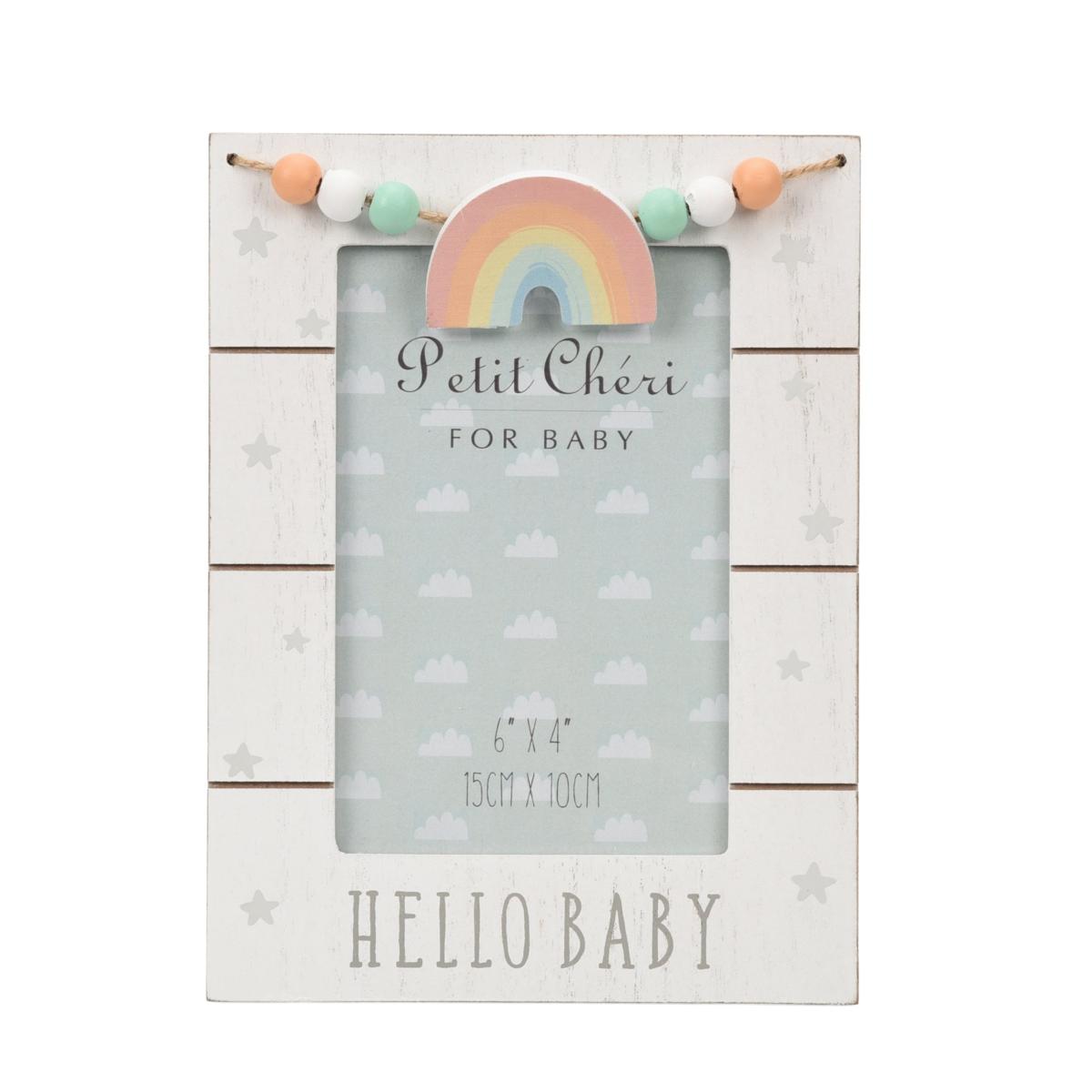 * Wooden frame * Rustic design * Fits 4”x6” photos Frame those first special memories in this cheerful photo frame, designed especially for your newest arrival. Featuring a soft pastel rainbow and delicate bead detailing, it offers a sweet and sentimental touch to a shelf or nursery wall.
