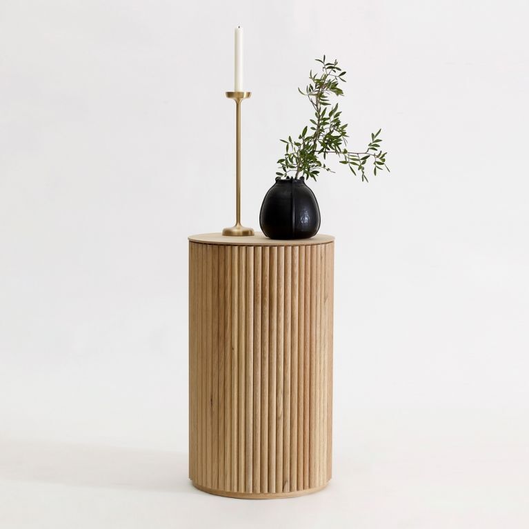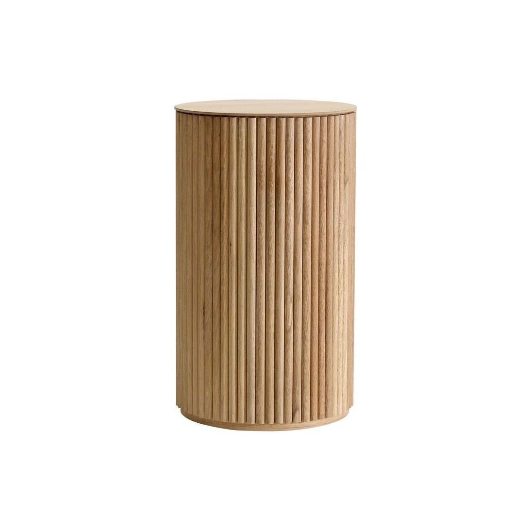 Innovatively designed by Anya Sebton and Eva Lilja Löwenhielm for ASPLUND, the Petit Palais Bedside Table in white stained oak would lend a playful touch to any bedroom. Expertly crafted from stained oak panels and topped with a stained oak veneer, this statement bedside table features a stained white finish. Specially designed to embody the elegance and luxury of pure Scandinavian expression, the table's circular profile lends it a soft edge that would enhance any bedroom.