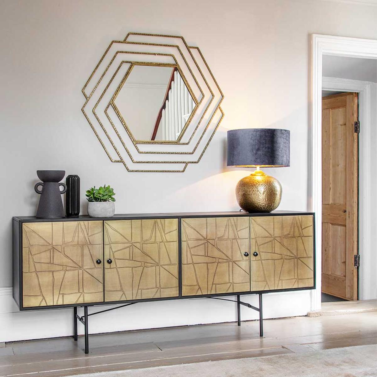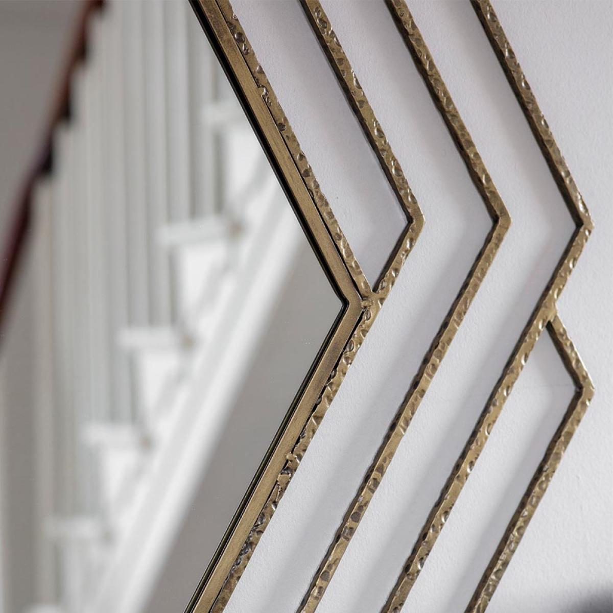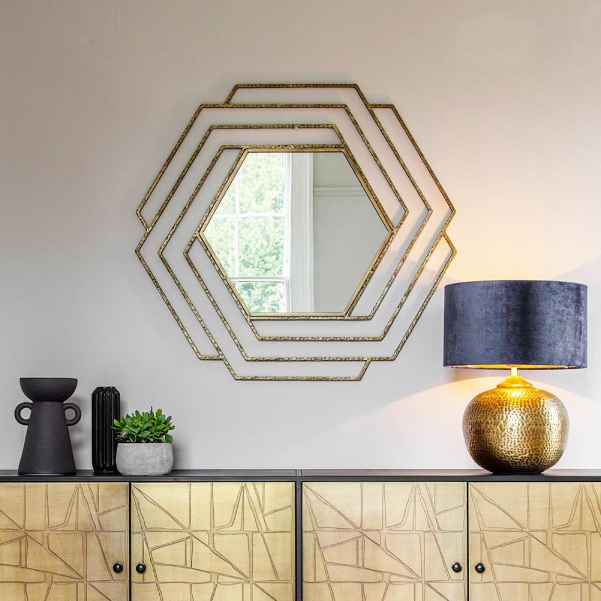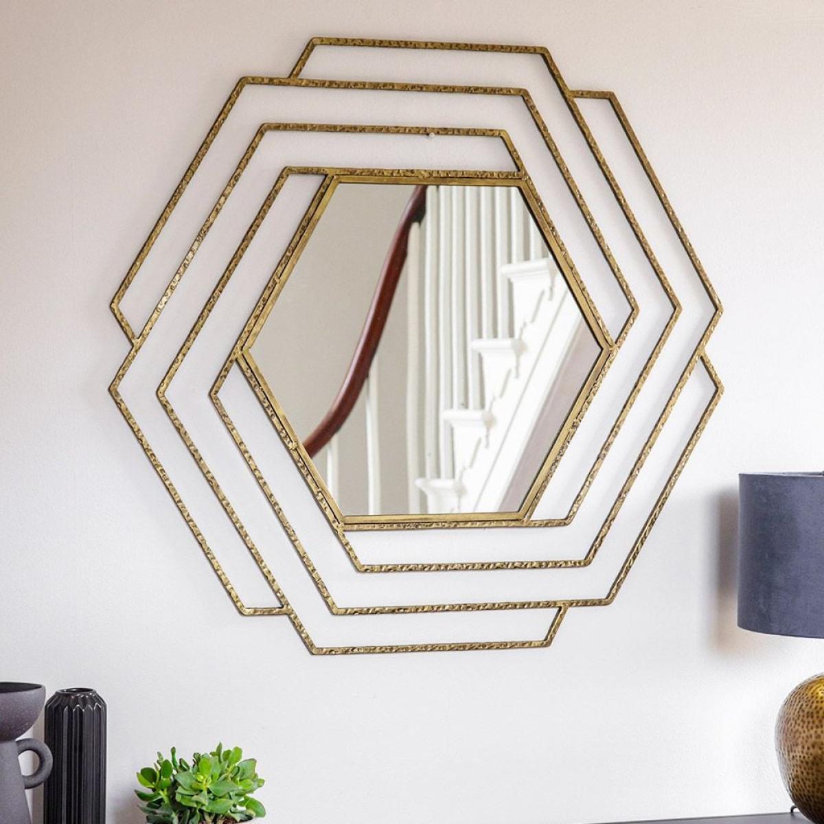 I love this mirror for its modern geometric design and warm brass finish, which adds a subtle touch of luxury without overpowering the space. It works particularly well in contemporary or minimalist interiors, where its clean lines can serve as a focal point or complement a sleek décor. Practical styling tips include placing it in an entryway to create a welcoming vibe, or over a console table to echo the metallic accents in a room’s accessories. Its multi-layered hexagonal shape also makes it versatile enough to be styled with are decorative objects nearby, creating an interesting visual balance. Overall, this one’s a great choice for adding a stylish, reflective element that feels current yet timeless.