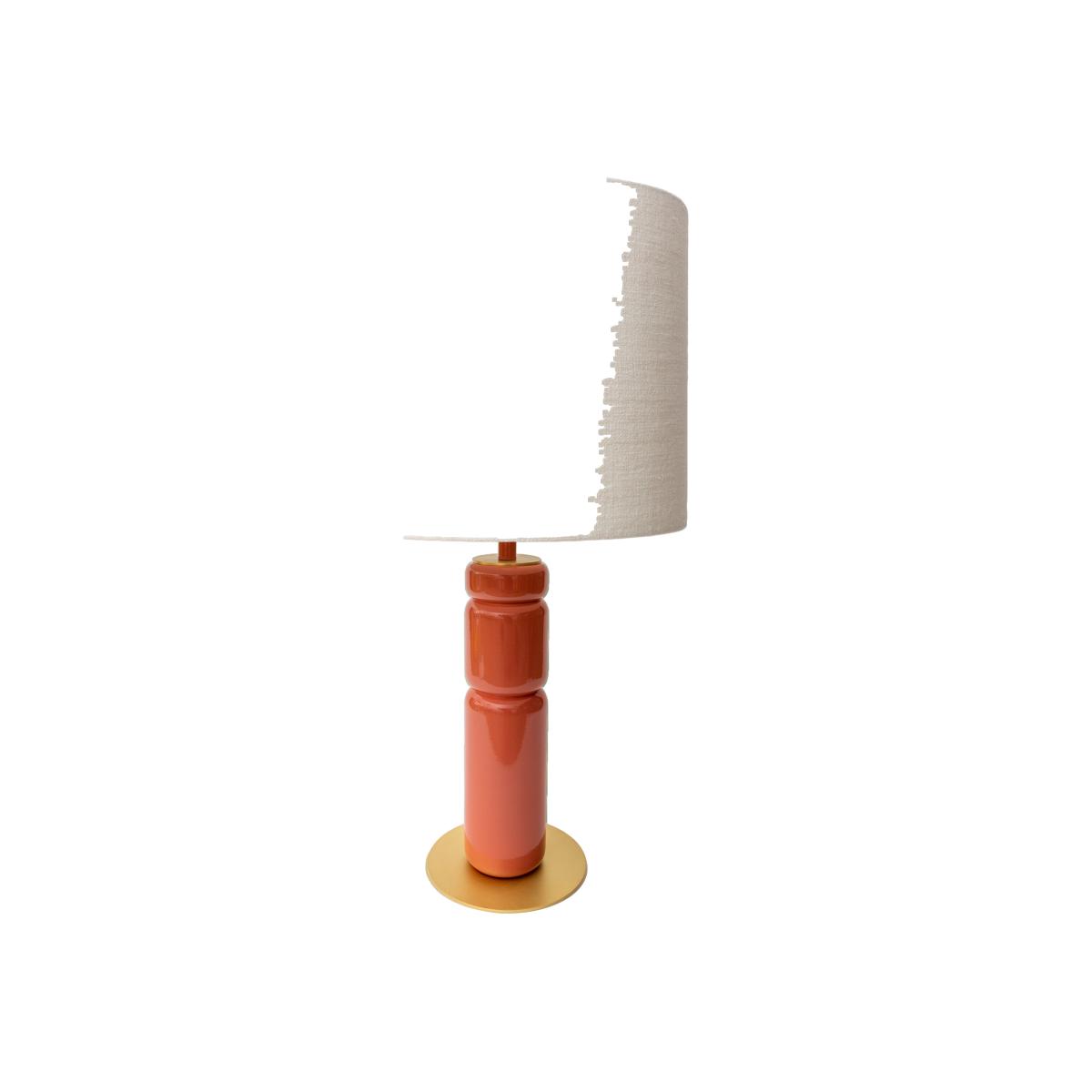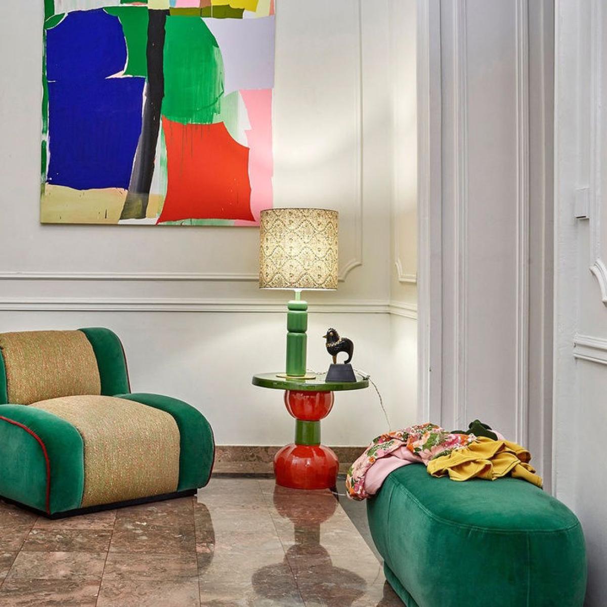 This Petra lamp offers an aspect that is both chic and relaxed. The hand-turned solid beech base is coated with a high-shine lacquer that reflects the light and creates a stunningly smooth surface. The colourful wood is combined with sophisticated details in brushed solid brass. The combination of a noble and natural material like wood with a glossy and vibrant colour creates a wonderful visual contrast. The lampshade is available in satiny white linen or colourful patterned fabric. Available in several versions, from the more understated to the most eccentric, the Petra lamp is perfect in a living room, bedroom or entrance hall. Dive into the eccentric, delightful and elegant world of the budding creative force, Popus Editions. Inspired by the hustle and bustle of London and "Swinging London", this collection reveals a daring mix & match of bold colours and graphic prints, all mixed together with an oh-so-seventies vintage attitude. Get your dose of good vibes with Popus Editions, creating a sunny and relaxed interior with plenty of boho-chic style.
