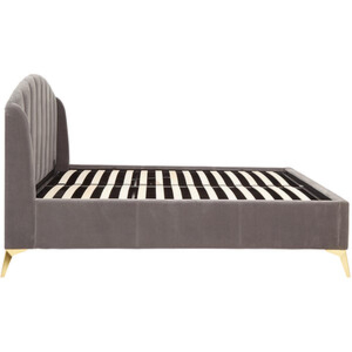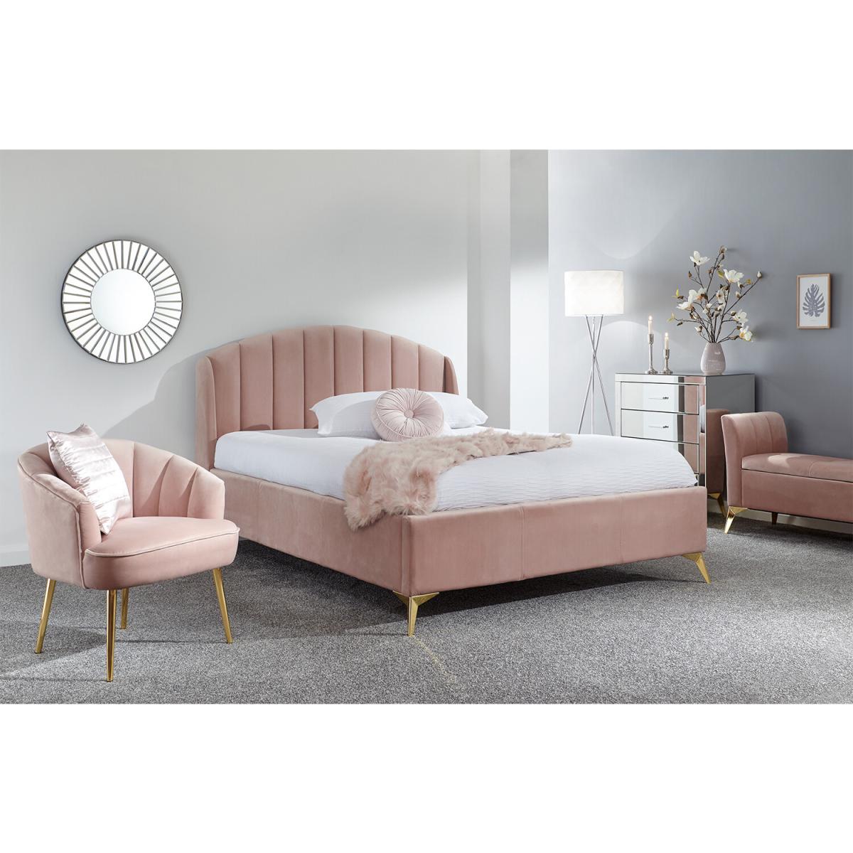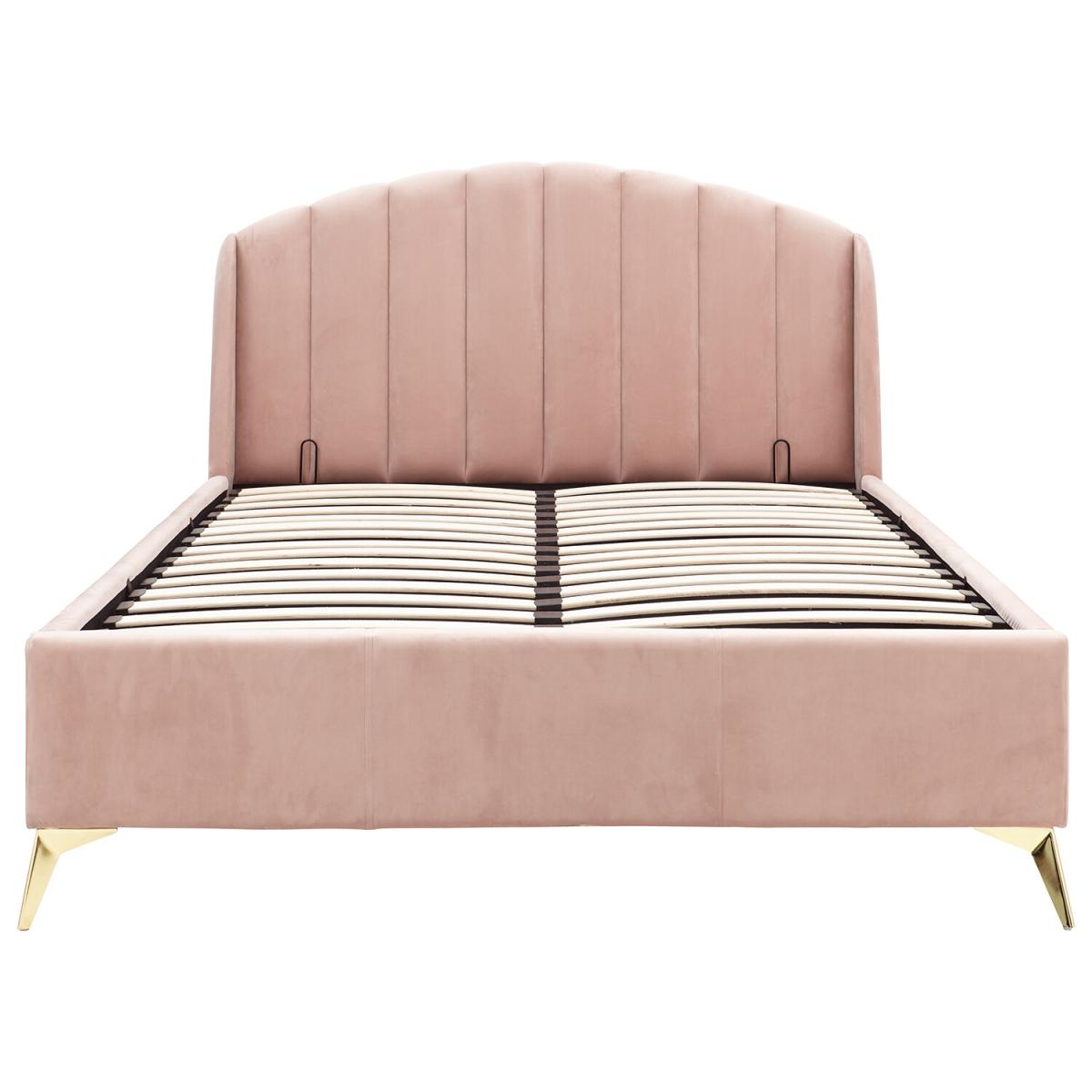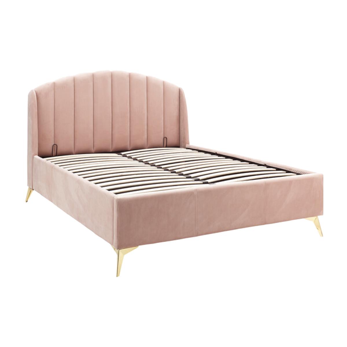 Transform your bedroom into a romantic boudoir with this wonderful Pettine End Lift Ottoman Bed. The softly padded frame and heavy-duty sprung slat system provides a sturdy base for your mattress. The headboard's winged design evokes the soft contours of a scallop shell, an impression that's enhanced by the gorgeous plush fabric with velvety pile in a choice of pink and grey colourways. The angled gold-effect metal legs offer a contemporary contrast to the classic lines of the frame. Hydraulic pistons allow the slatted base to lift with ease, revealing a storage compartment beneath.
