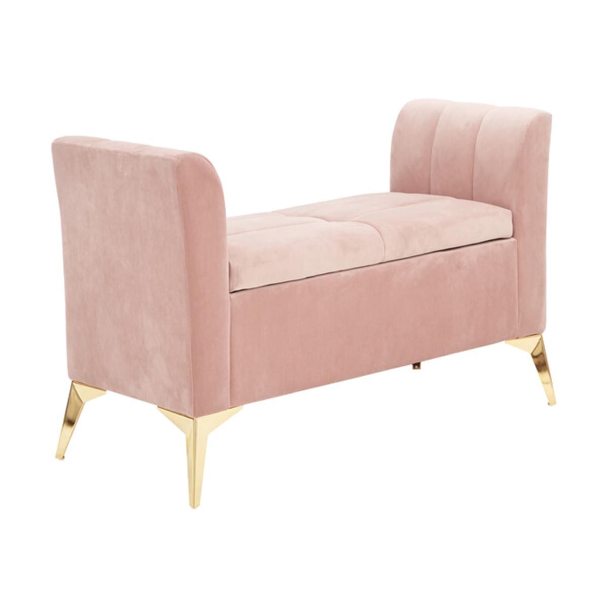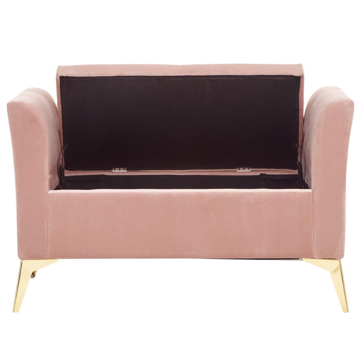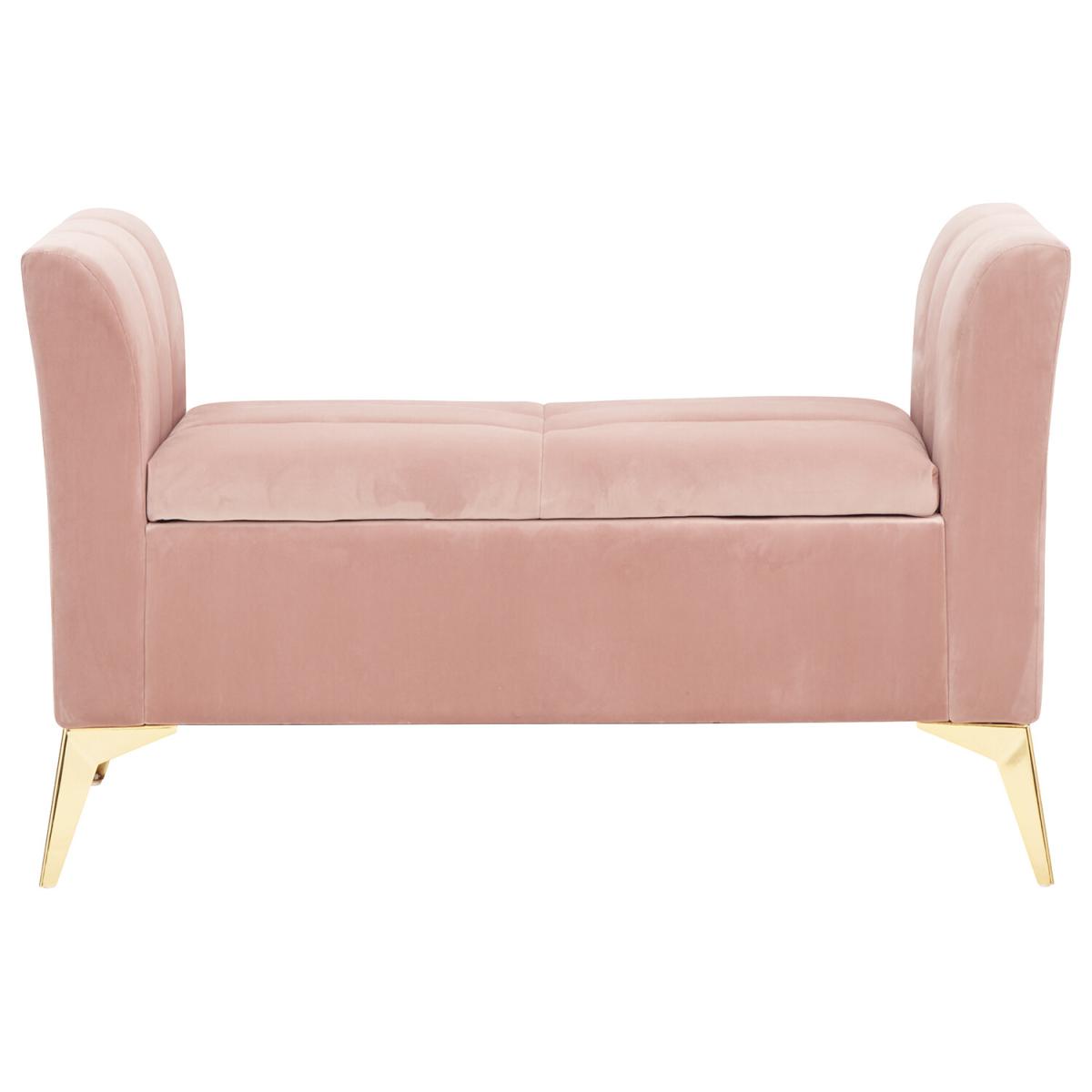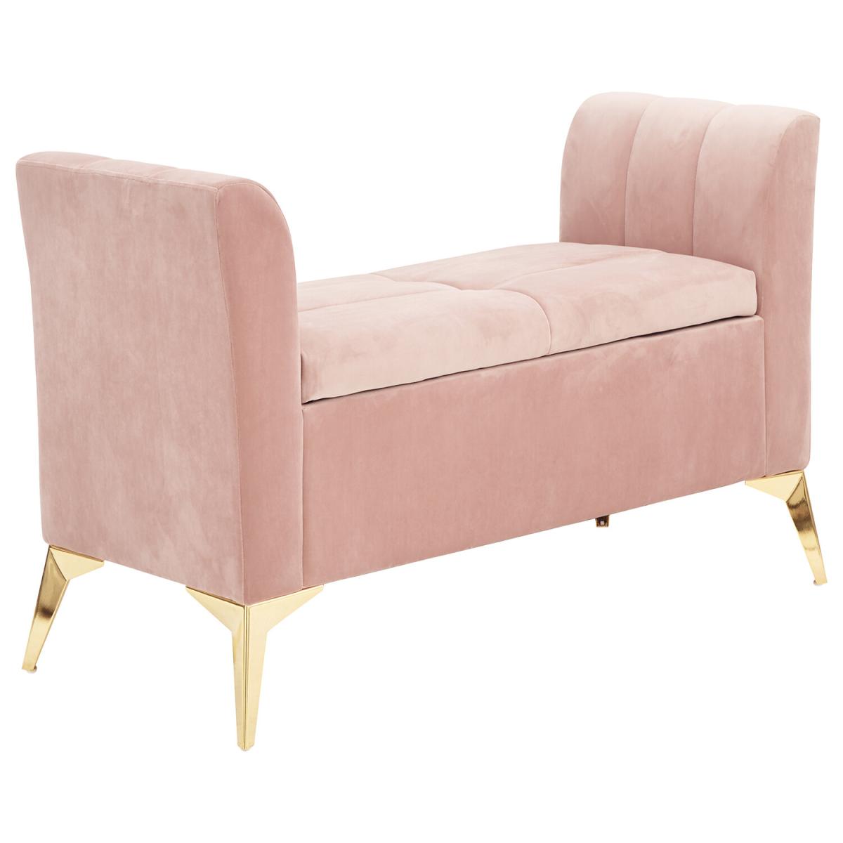 Give an underused window bay or another bedroom nook, an eye-catching feature with this gloriously elegant Pettine Ottoman Storage Bench. The gently flared arms feature a classic sculpted design and flank a comfortable seat beneath which is concealed a useful lined storage compartment, perfect for blankets and throws. The deep padded frame and seat is upholstered in a tactile plush fabric with a matt velvet pile that looks and feels wonderfully indulgent. The angled gold-effect metal legs add a contemporary contrast to the seat's classic lines. Pick from blush pink and soft grey colourways.