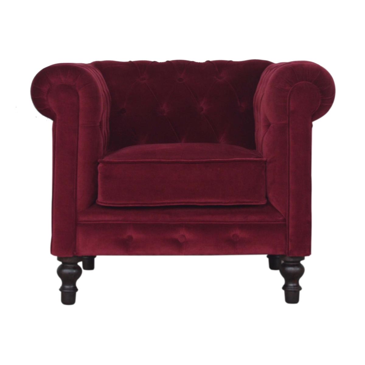 Enjoy the comfort and style of this Chesterfield armchair in pewter tweed. This armchair is made of solid mango wood and has a classic buttoned back and piping details. The pewter tweed fabric is soft and durable, and the oakish finish on the feet adds a touch of elegance. This armchair is perfect for any room, whether you want to relax, read, or chat. Please note that this armchair may vary slightly in colour and texture due to the natural variations in the wood and fabric. If you want to match this armchair with other products, you can either order a custom-made piece or be aware of the possible differences. This beautiful Chesterfield armchair has been upholstered in a luxurious wine red cotton velvet and features 4 turned feet constructed from 100% solid mango wood in a chestnut finish. This sofa is detailed with deep button tufts, piping and sheltering arms. This is a statement piece for the home which can be suited well with many different styles and colours of interiors.