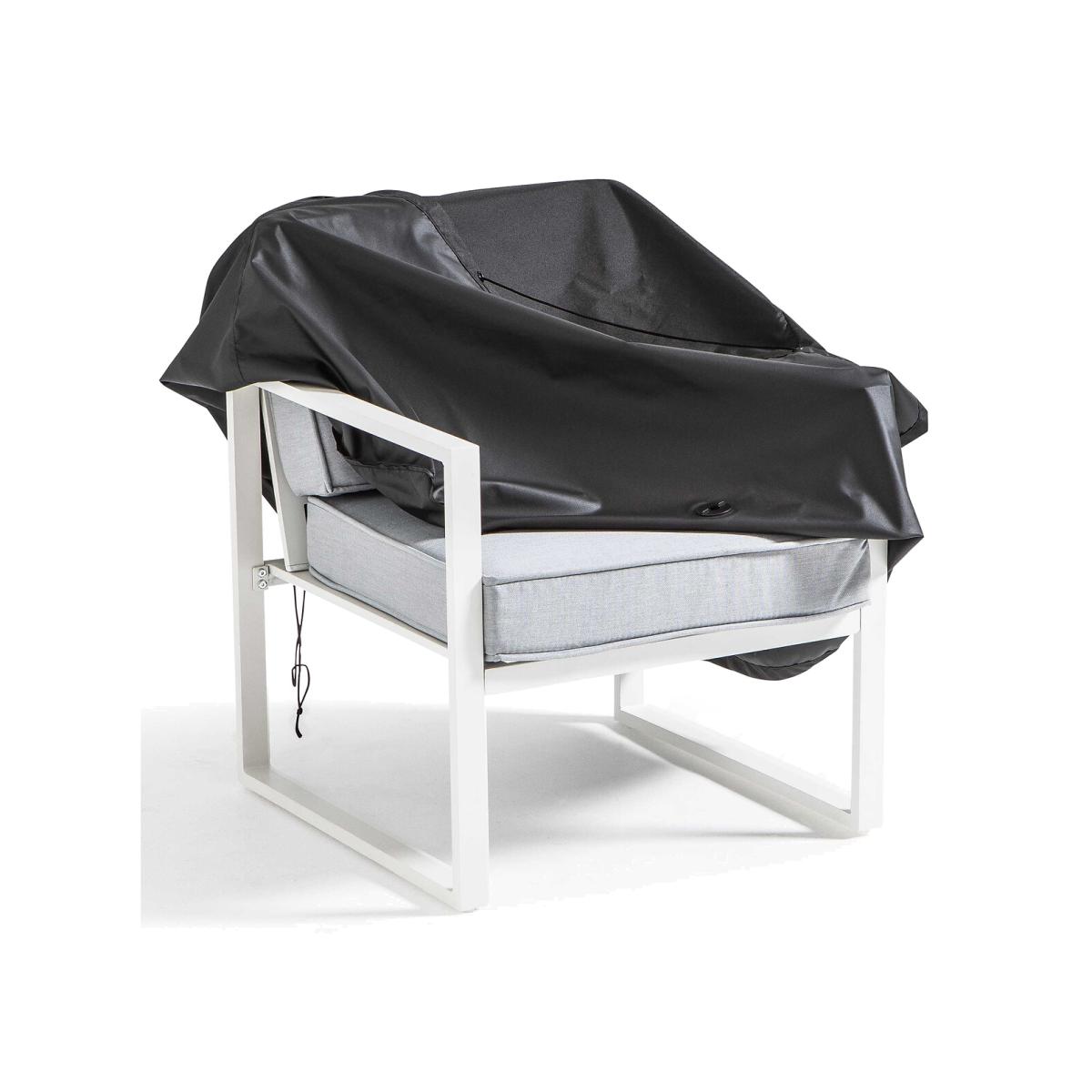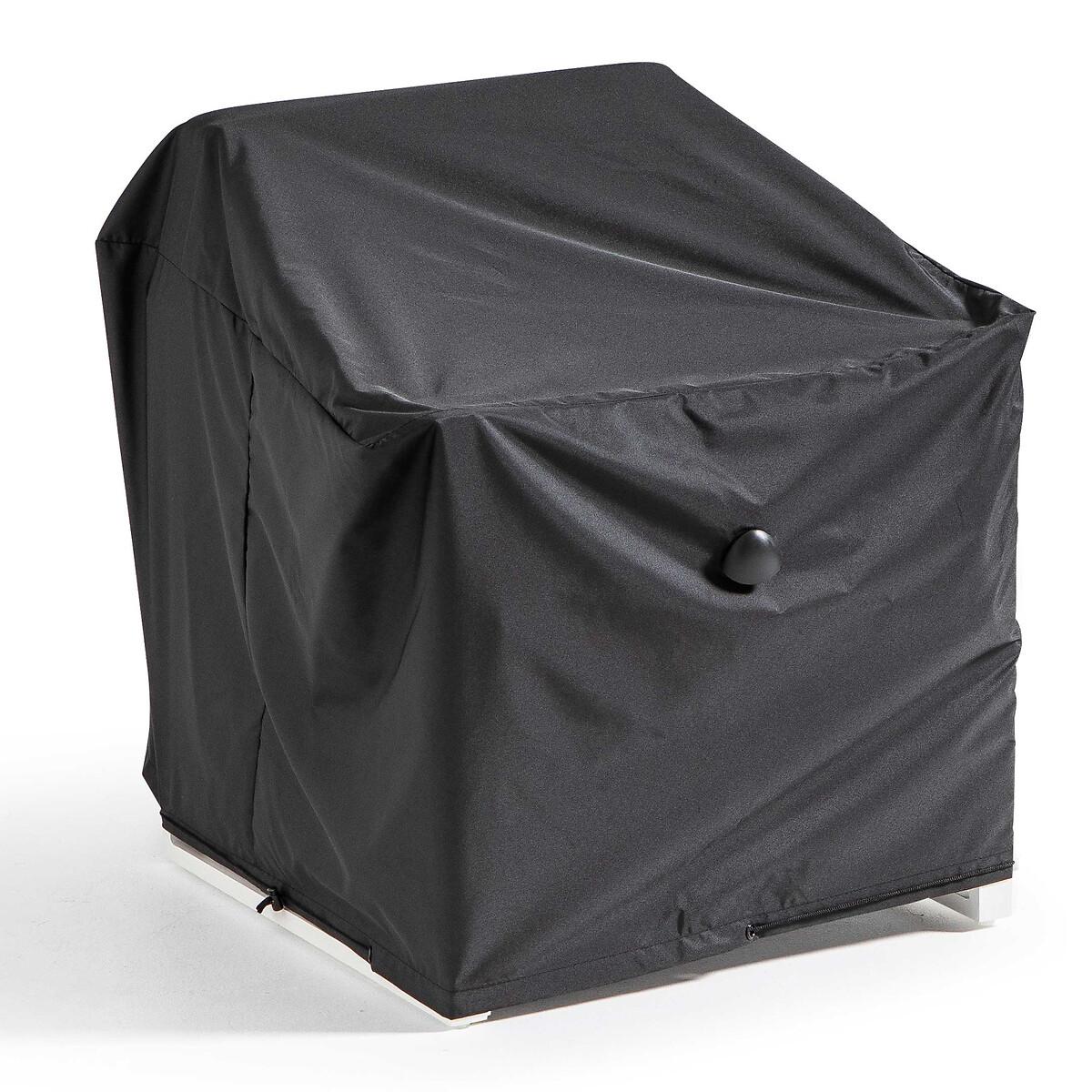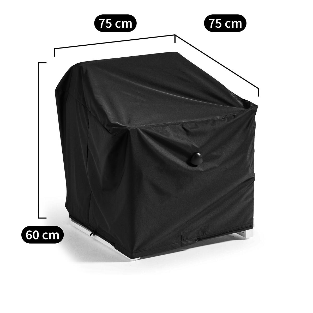 Water-repellent, waterproof and essential for overcoming winter, the Pext protective cover is designed to protect your garden furniture from bad weather, humidity and dust thanks to its many patented systems.. In a black colour, it is delivered in a storage bag.Product Details • Protective cover for garden armchair with dimensions less than W75 x D75 x H60cm. • Premium fabric: 100% mass-dyed polyester canvas, PU coated 160 gr/m², water-repellent, waterproof • 1 PVC aerator: Prevents condensation and mould. • Patented hook-up fastening system: Polyester cord with stopper, eyelets along the entire length, hook-and-loop strips at each corner to perfectly hold the cover in place at the level of the feet. • Delivered folded in a strong and elegant storage bag. Dimensions • Length: 75cm • Height: 60cm • Depth: 75cm